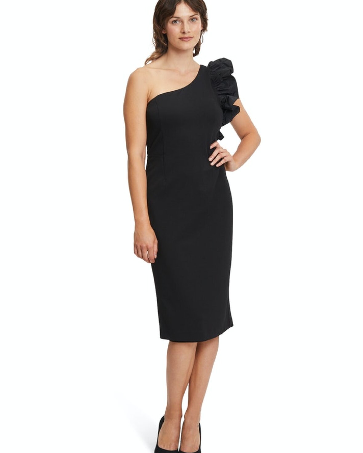 KJOLE 3235/4467 - VERA MONT er en klassisk smart one-shoulder cocktailkjole. På den ene skulder er der påsat store smukke voluminøse flæser. Kjolen lukkes med lynlås bagtil.Kvalitet: 95 % Polyester, 5 % Elastane