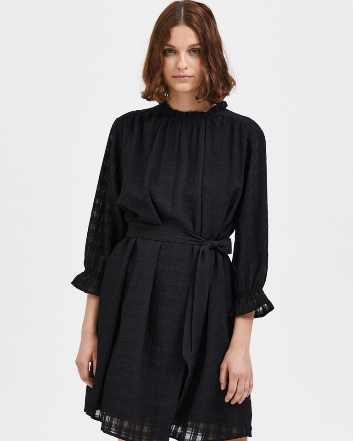 SLFINNA 3/4 SHORT DRESS - SELE er en minikjole med tekstur er fyldt med flæser og fantasi! Den har en fabelagtig rund flæsekrave, elegante voluminøse ærmer i 3/4-længde og stofsamlingsdetaljer på brystet og over skuldrene bagpå samt et fint bindebæltet.Kvalitet: 98% Genanvendt polyester, 2% Elastan