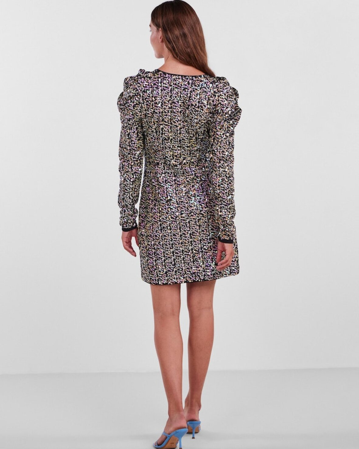 YASMULTISEQ LS WRAP DRESS - YA er en super flot og festlig kjole med slå-om effekt og lange ærmer med puf ved skuldrene. Den er sort og toppet med fine palietter i lyserød, creme og gylden. Den lukkes i siden med en sløjfe, af velour. Indvendigt er den forret med et glat materiale.Kvalitet: 100% Polyester