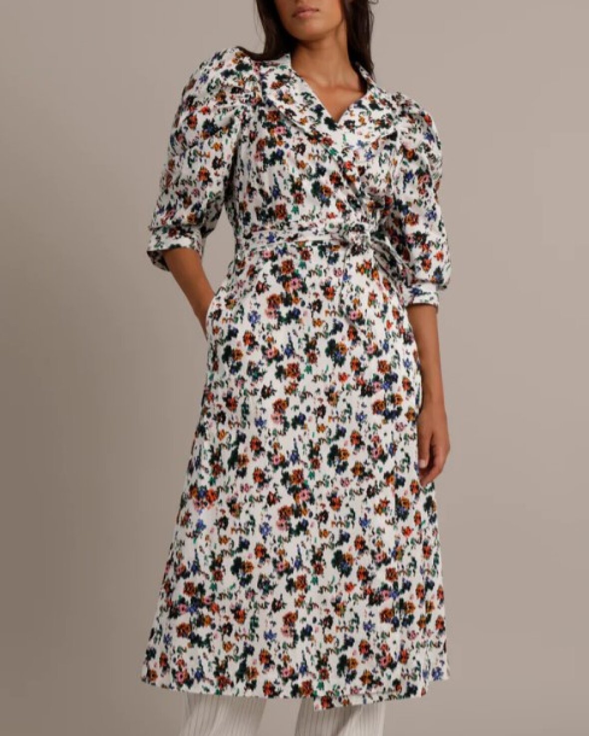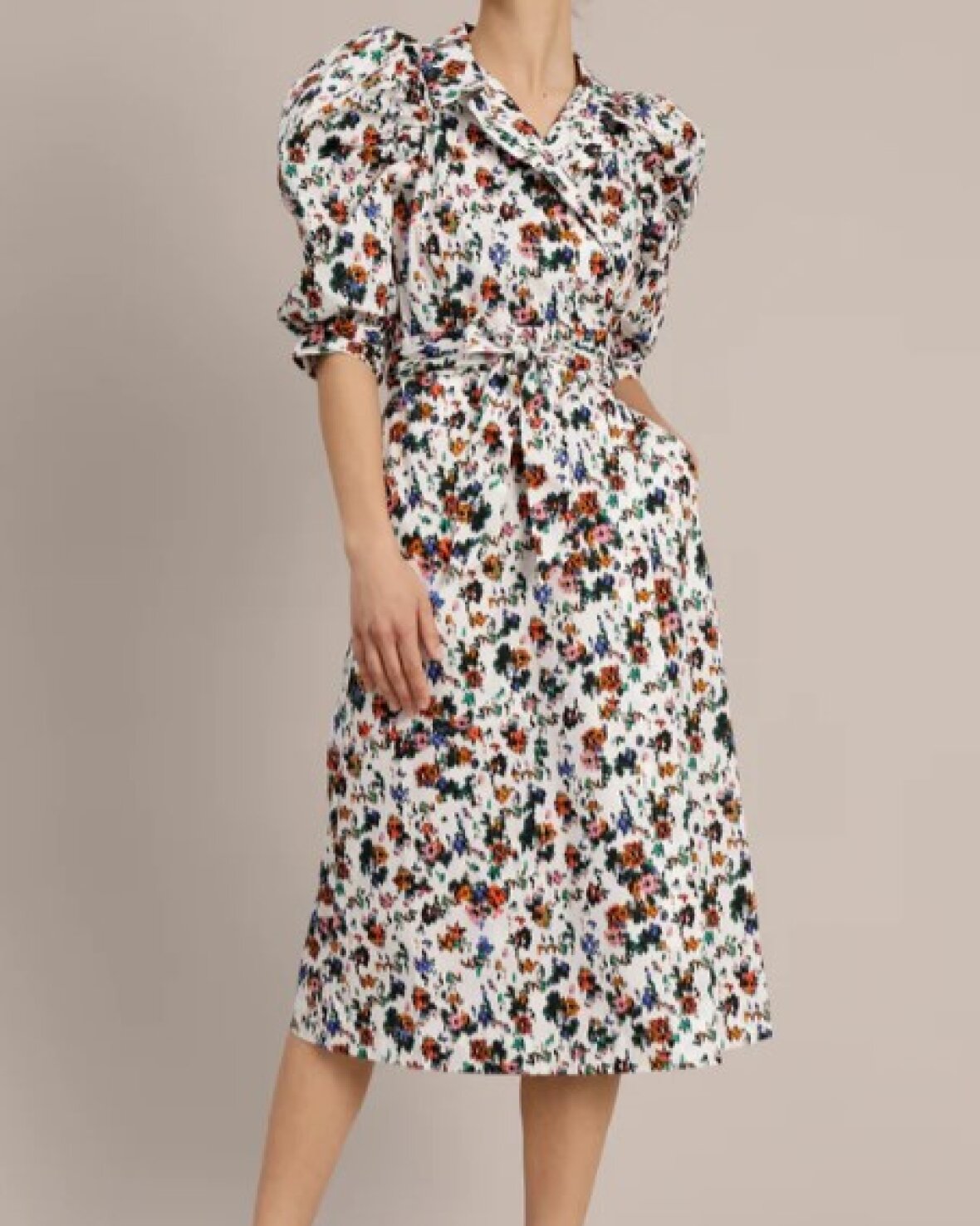 JITA KJOLE - MUNTHE er en feminin slå-om-kjole i økologisk bomuldsmiks med smukt blomsterprint, bindebånd, skjorte-krave-hals og korte pufærmer.Kvalitet: 97% Økologisk Bomuld 3% Elastan