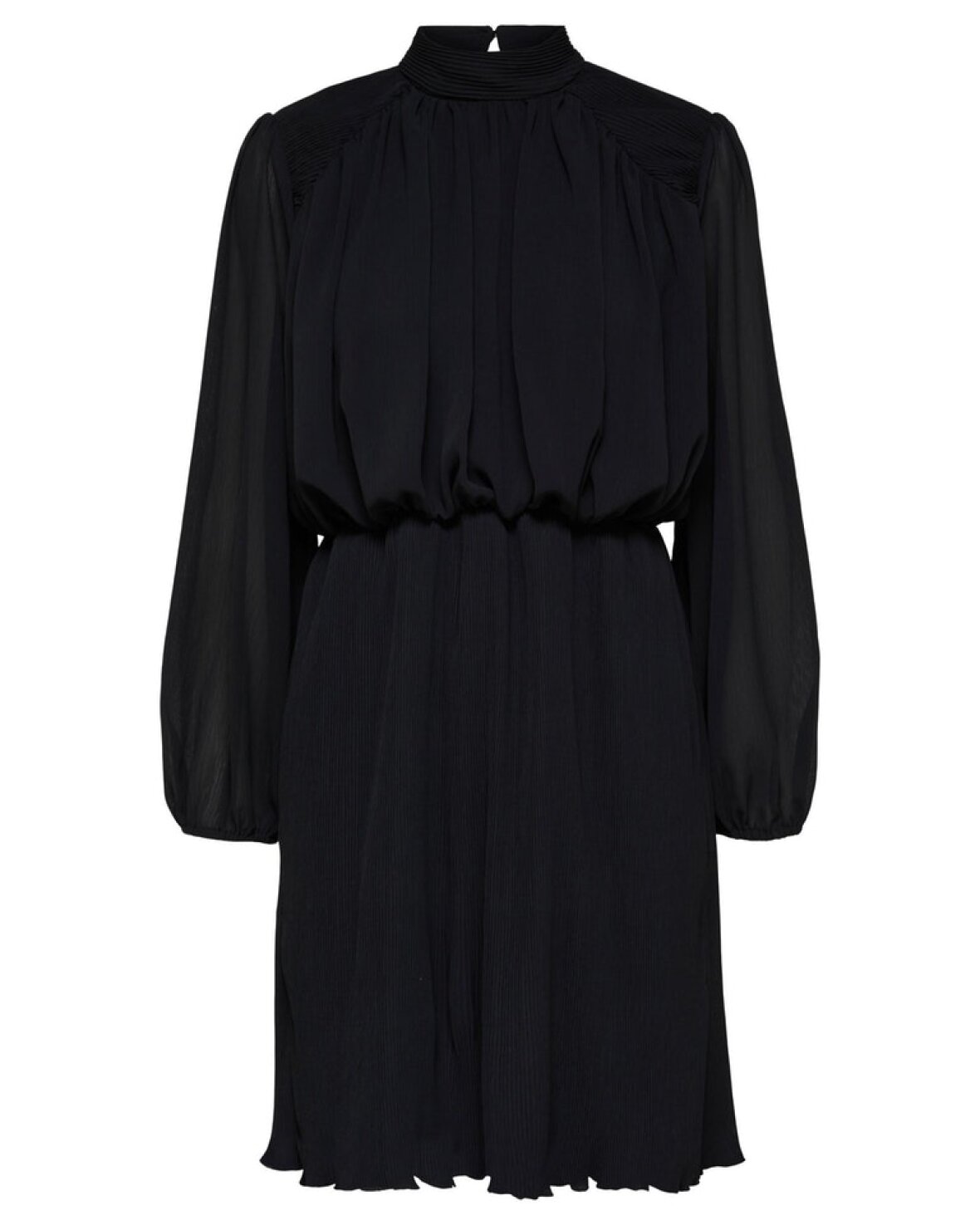 SLFSIMONE LS SHORT DRESS gør festen mindeværdig med denne plisserede mini-kjole. Den har en plisseret høj hals, der matcher den plisserede detalje ved skuldrene, og semi-gennemsigtige ærmer. Rynke-effekten foran sammen med den elastiske linning giver den en æterisk, voluminøs effekt, og den flæsede kant gør, at den ser elegant ud.Kvalitet: 50% Polyester, 50% Genanvendt polyester
