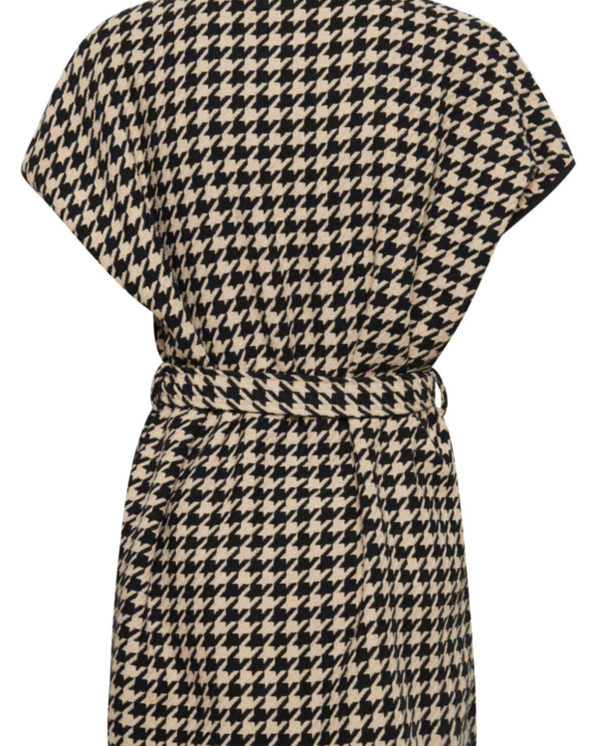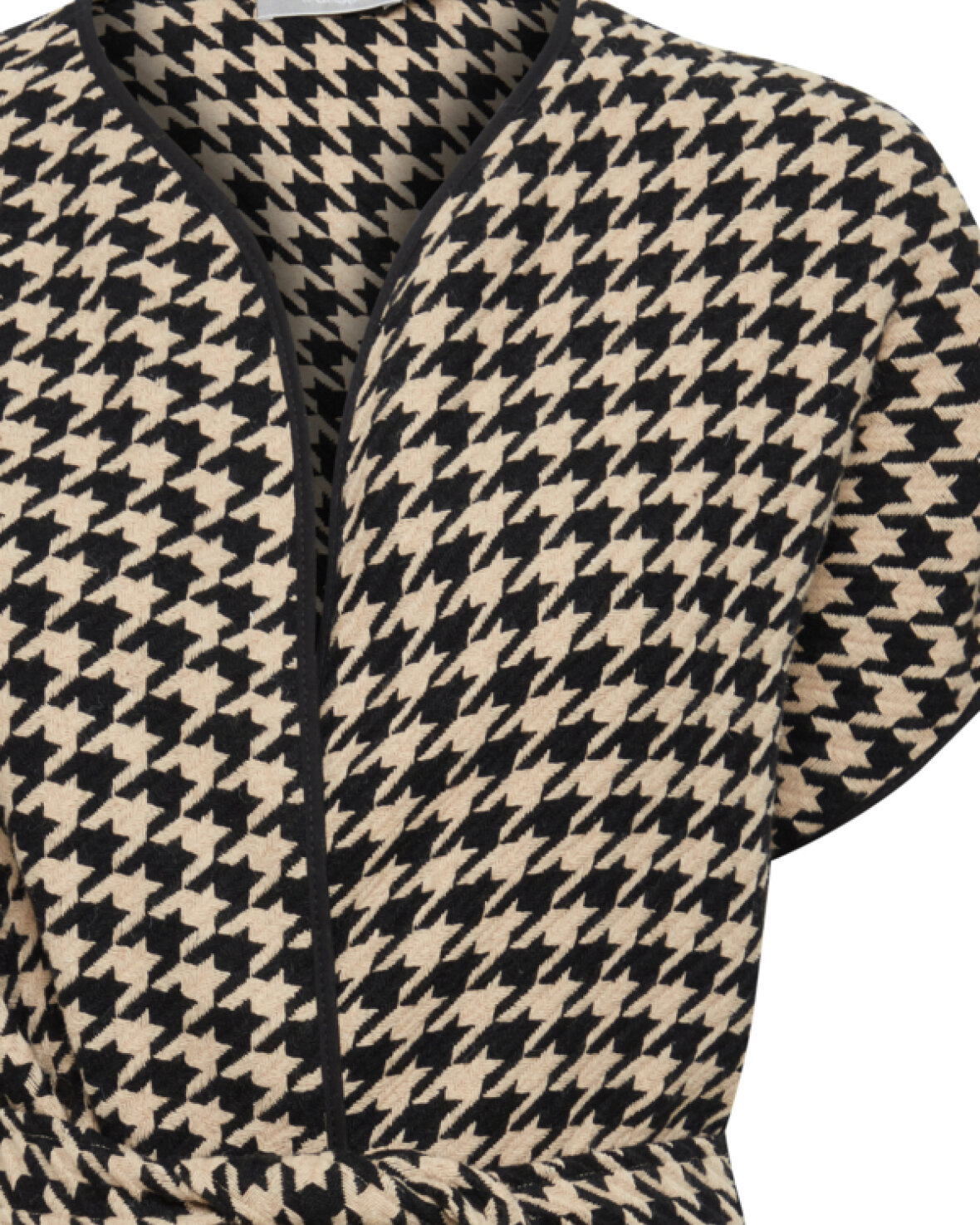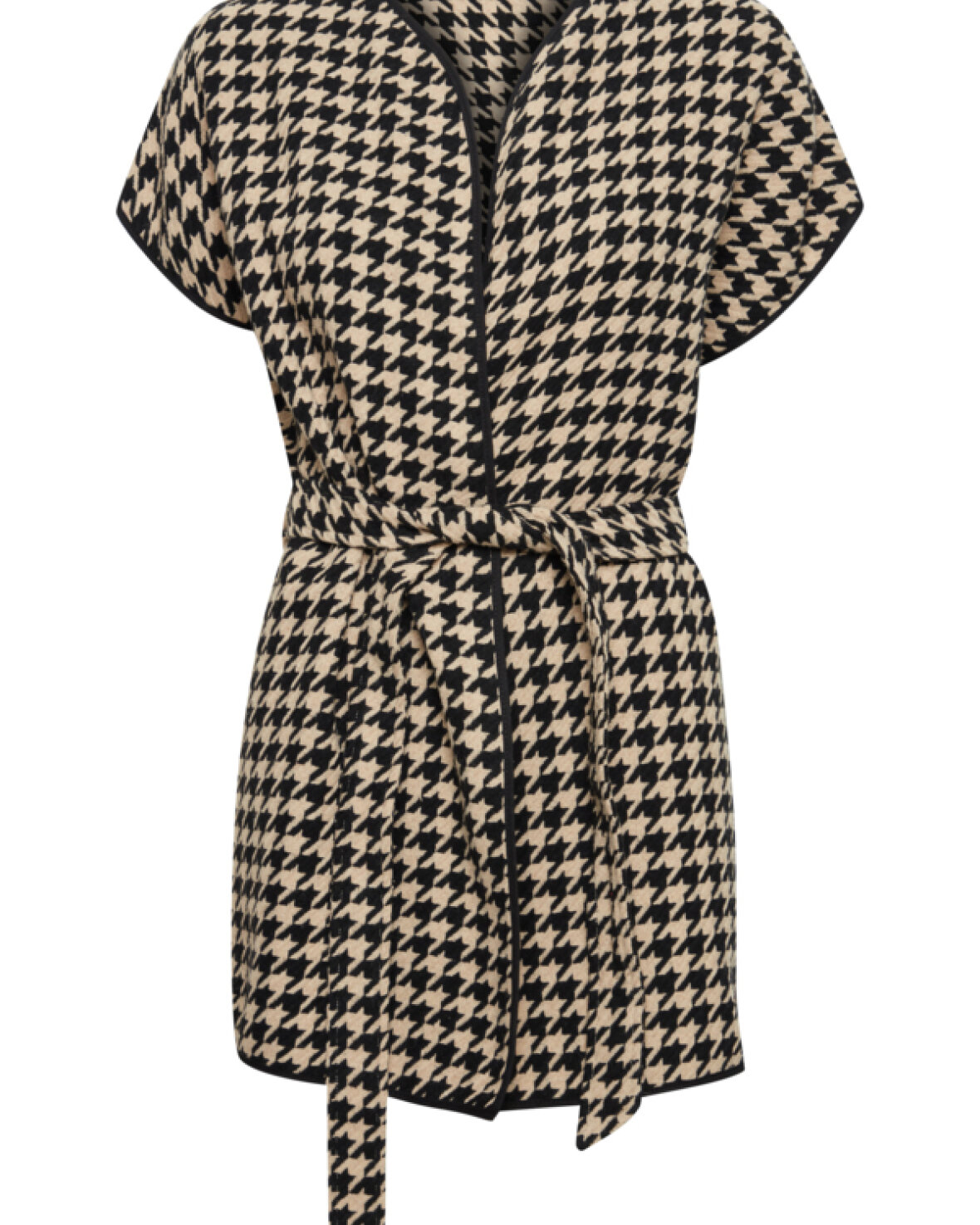FREDA VE 1 - FRANSA er en smart vest i det smukkeste beige og sort farvet print, samt i et lækkert materiale, som er super nemt at holde varmen i, samt super behageligt at have på. Vesten er med et bindebånd rundt i taljen – hvilket gør vesten mulig at style åben eller lukket over et outfit. Denne model er ellers med en lille v-hals udskæring, med en smule hængene ærmer, samt med et hav af alle de lækreste detaljer.Kvalitet: 60% Acrylic 35% Polyester 5% Viskose