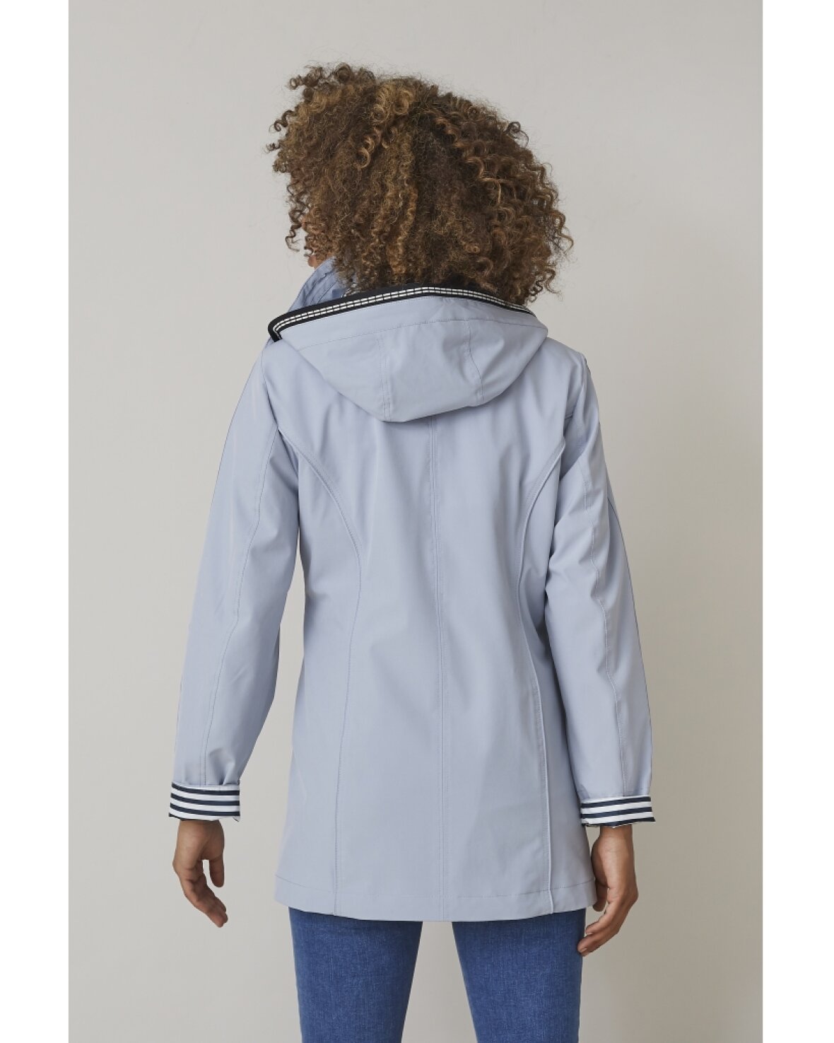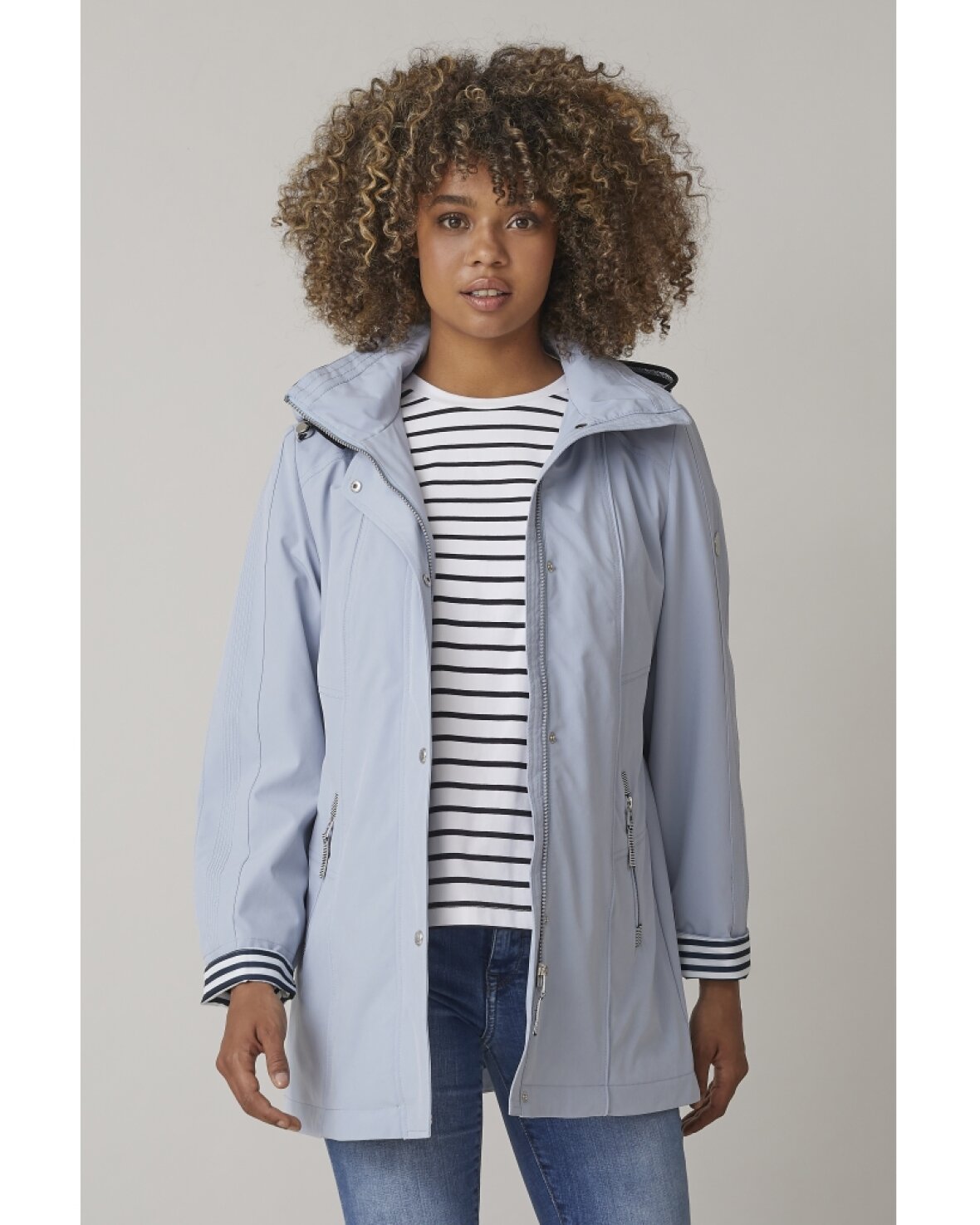 JAKKE JENNIFER 0124-2486-86 - Junge er en smart jakke med fine detaljer og aftagelig hætte. Jakken har lynlås- og trykknaplukning, lynlåslommer og en inderlomme med lynlås. Jakken er delvist foret i et smukt stribet print.Kvalitet: 92% Polyester, 8% Elastan. Foer 1: 100% Polyester