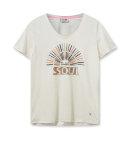 T-SHIRT CAROO-SS 163170 - MOS MOSH er en smart t-shirt med korte ærmer, rund hals og et flot grafisk print på fronten med perler og pailletter.