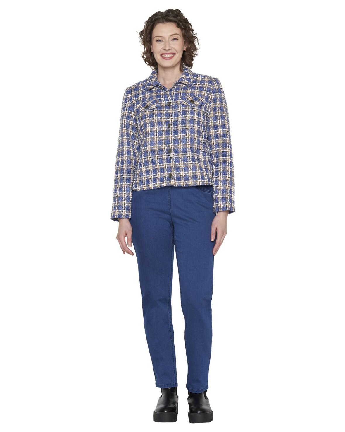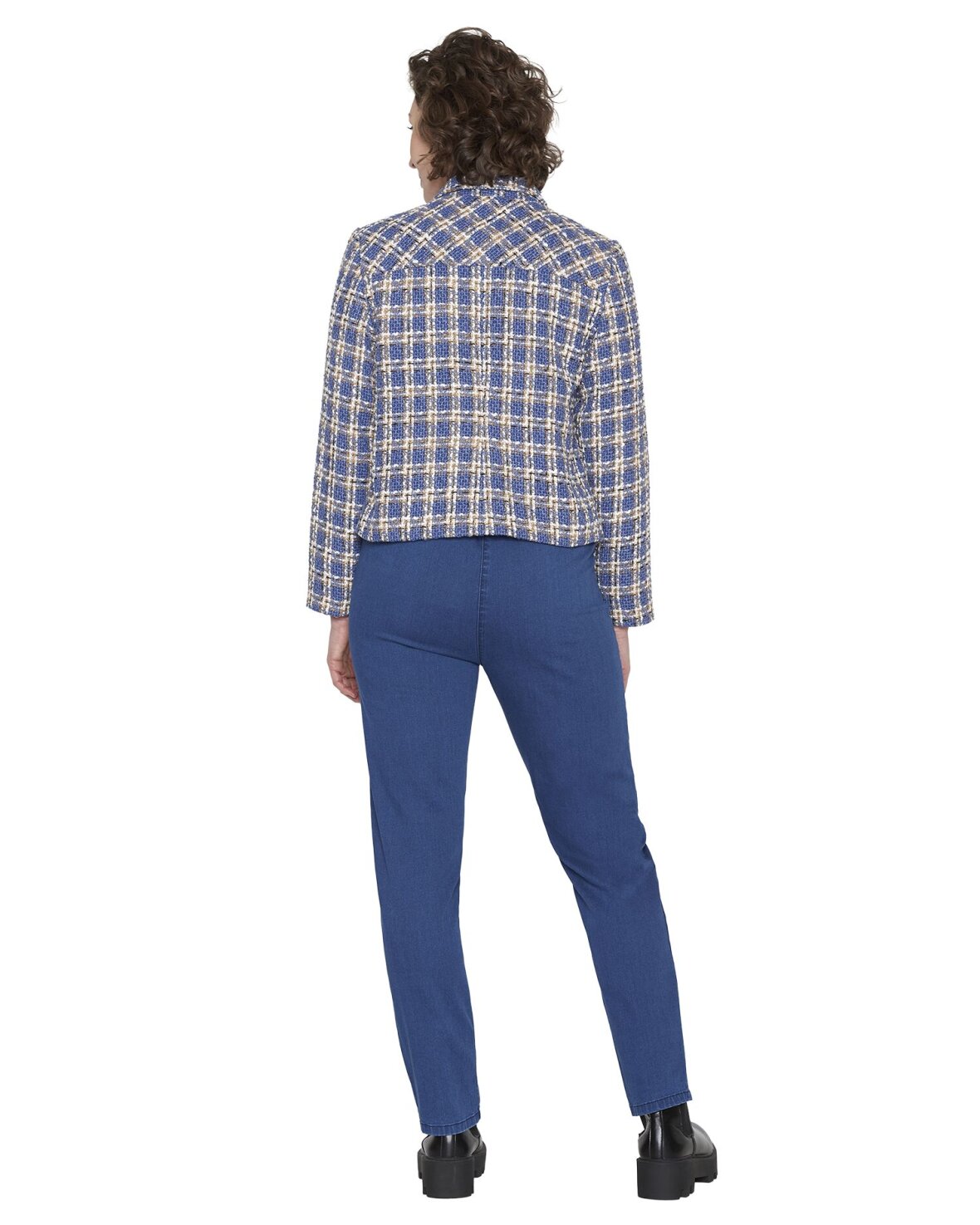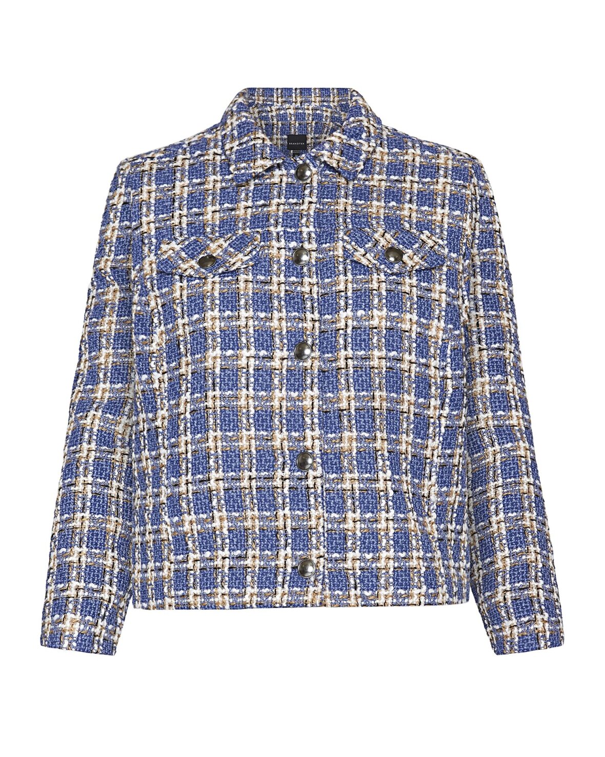 JAKKE 217654 - BRANDTEX er en flot og elegant kort jakke et flot ternet design i blå, hvid og brun. Det ternede tråd design giver et flot og eksklusivt look. Jakken er lavet i et klassisk design med krave og gennemgående knapper langs fronten. Jakken er med to forlommer med klap og knapluk. Kort pasform med lange ærmer. En skøn jakke til at pifte garderoben op med. Kan anvendes til mange forskellige styles og anledninger og giver altid et smart look.