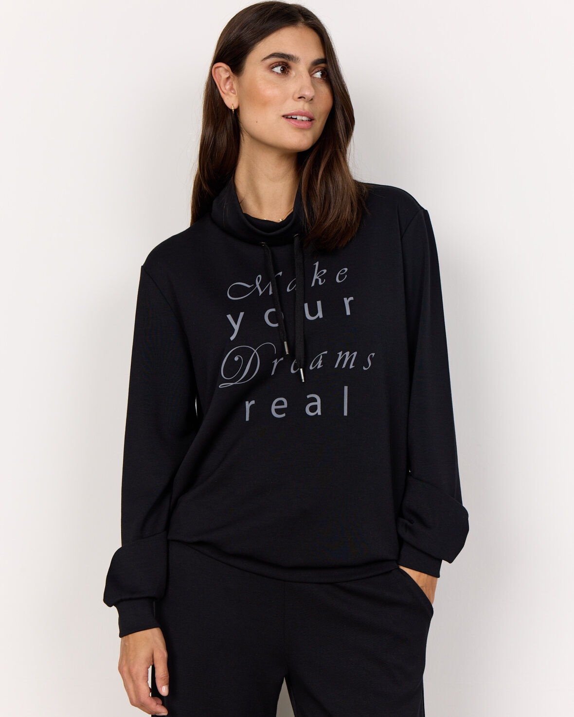 SWEATSHIRT BANU 217-ART. 9 er en behagelig afslappede sweatshirt med en justerbar hætte med snøre, manchetter og kant i samme materiale og et motiverende tekstprint på forsiden. Sæt den sammen med dine yndlingsjeans og sneakers til en afslappet dag ude eller med sweatpants til en hyggelig dag inde.Kvalitet: 48 % modal, 48 % polyester og 4 % elastan.