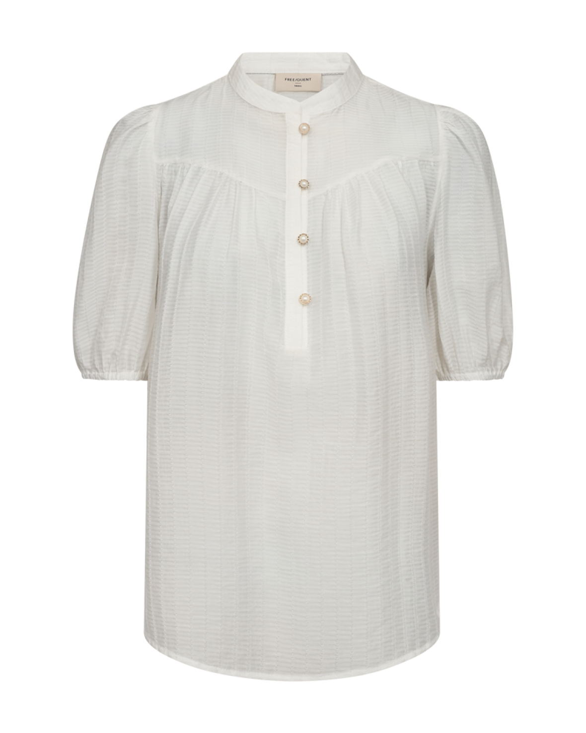 FQEBELLA BLUSE-FREE/QUENT er en i en let kvalitet med strukturmønster. Blusen er enkel i modellen med korte ballonærmer med elastik cuff, en elegant, løs pasform samt de smukkeste knapper med perlemorseffekt på frontenKvalitet: 55% Viscose, 30% Lyocell, 15% Polyamid