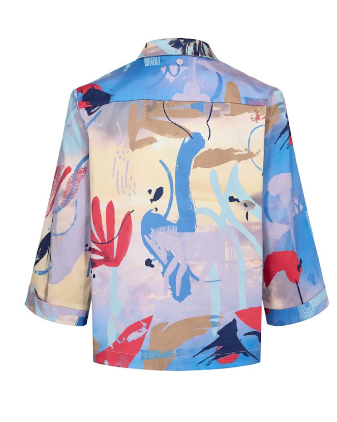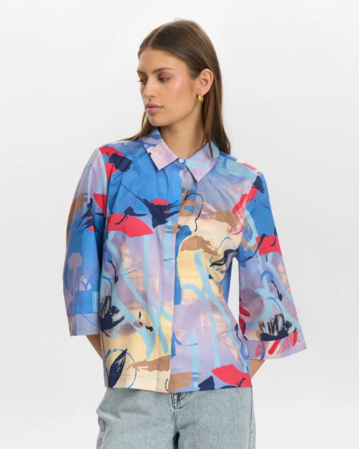 NUGLORIA SHIRT - NÜMPH er en fin skjortebluse med løse trekvartærmer og skjortekrave samt et flot statement print fra deres nyeste kollektion 'Dreamer'. Knapper er skjulte og øverste synlige knap med stof i samme print. Der findes matchende nederdel med samme print, så du kan have det på som et sæt. Kan også fint bruges med et par jeans eller shorts.