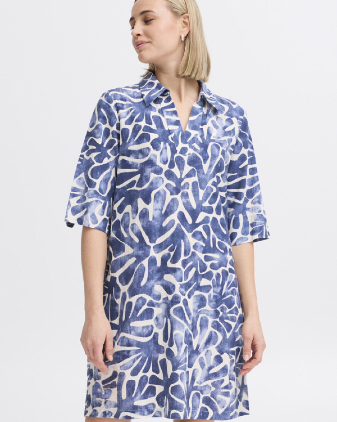 FRMADDIE KJOLE 4-FRANSA er med korte ærmer, v-hals med skjortekrave og lommer i siderne. Tunikaen går til lige over knæene og kan styles med en buks eller leggings eller bruges som kjole til sommer. Fremstillet af bomuld og hør, der gør den dejlig behagelig at have på.