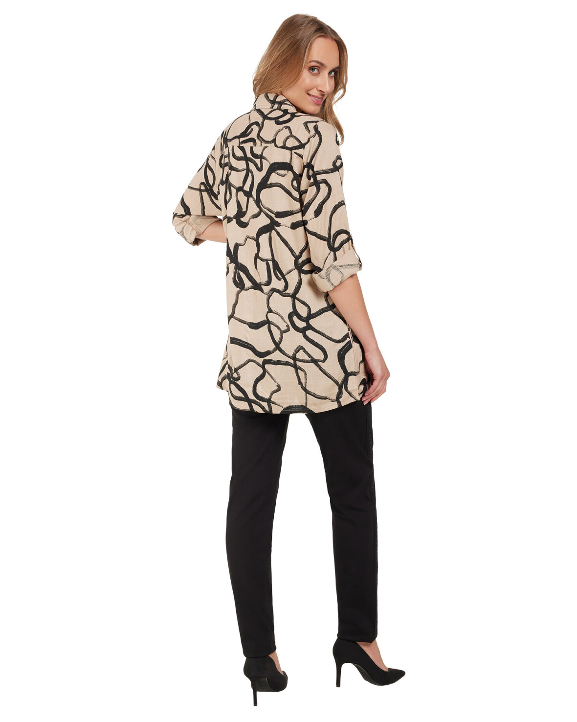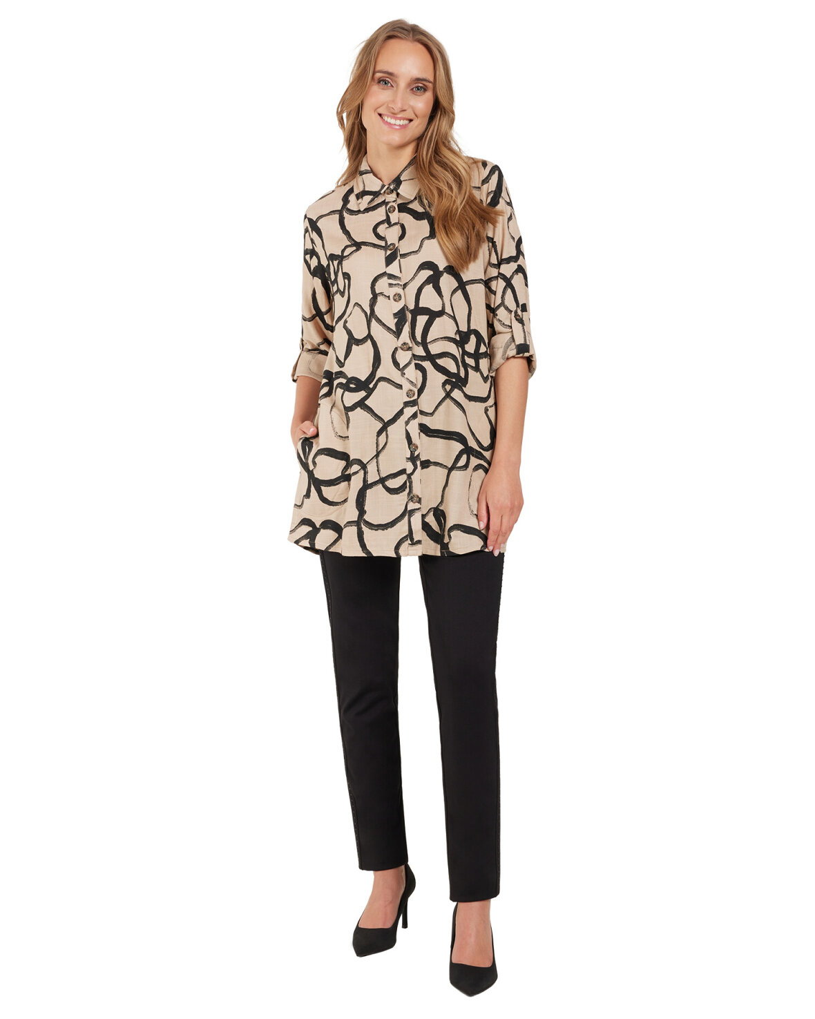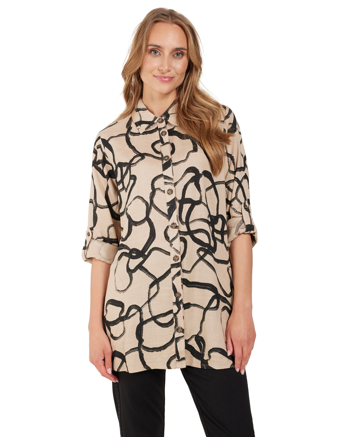 SJORTE 218549 - SIGNATURE er en fin skjorte er lang og med god vidde. Den har skjorte krave og er gennemknappet ned foran. Den har lange ærmer med god vidde og en smart detalje med en strop som kan knapper ærmet lidt længere op på armen.Kvalitet:100%Viskose