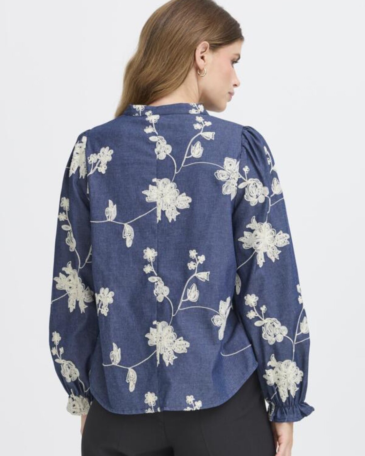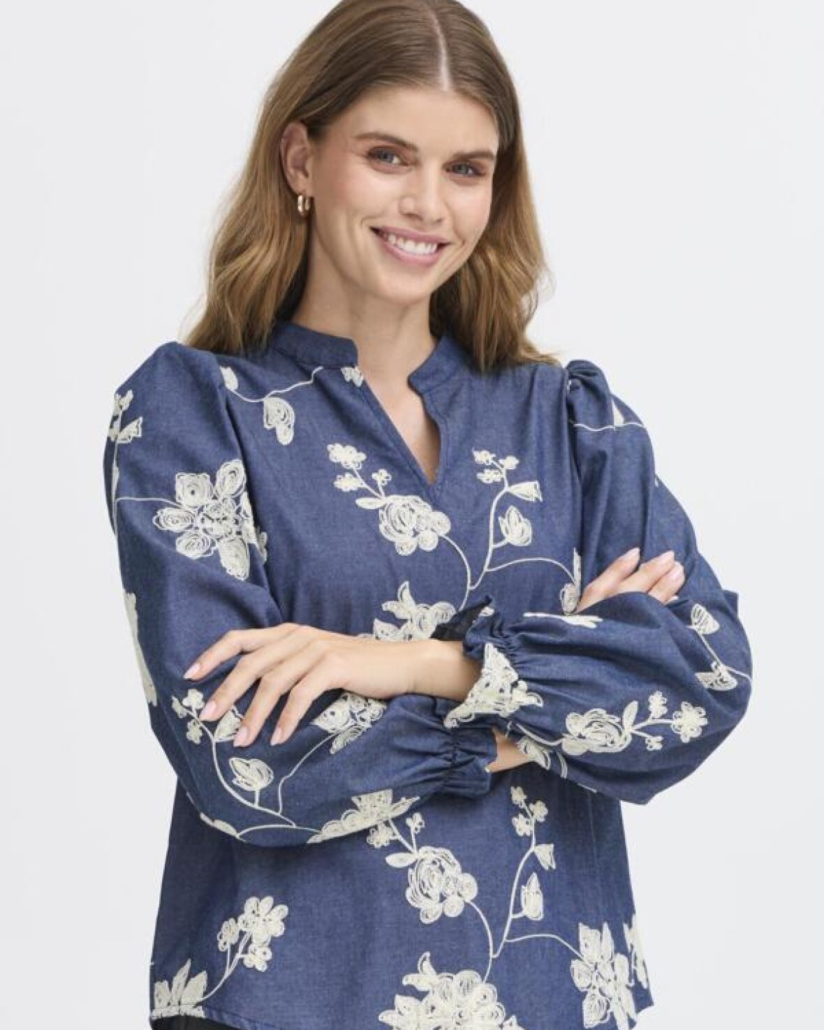 FRDARNA BLUSE 1 - FRANSA Bluse til kvinder med afslappet pasform, elegant ståkrave med V-split og detaljerede ærmer. Komfortabel og alsidig til hverdagsbrug og pænere anledninger.Kvalitet: 80% Viskose, 20% Polyamid