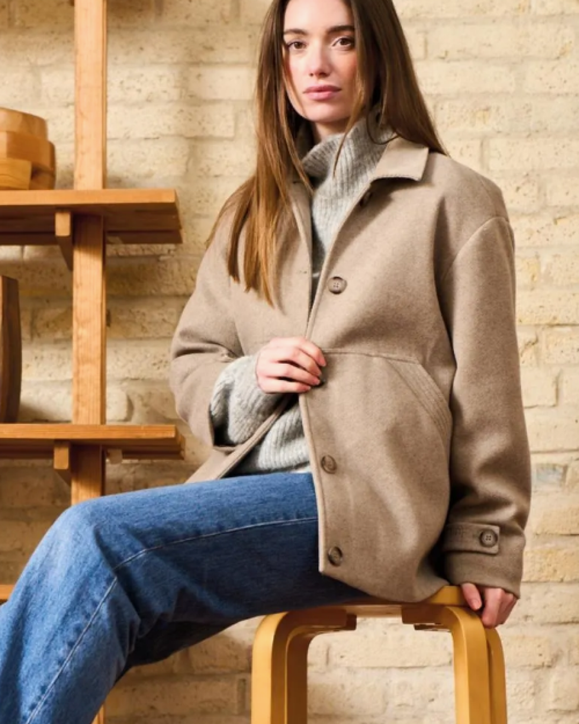 KPHWOOLI STUDIO JACKET -KOPENHAKEN denne elegante jakke kombinerer ren minimalisme med optimal komfort. Med sin let oversized pasform og klassiske skjortekrave får du et moderne look, der fungerer lige godt til hverdag som til stilfulde lejligheder. Fronten er designet med knapper og diskrete sidelommer, der tilfører praktisk funktion uden at forstyrre det simple udtryk. Den bløde, slidstærke kvalitet efterligner et uld-look, samtidig med at den er let og behagelig at bære.Kvalitet: 100% Polyester,