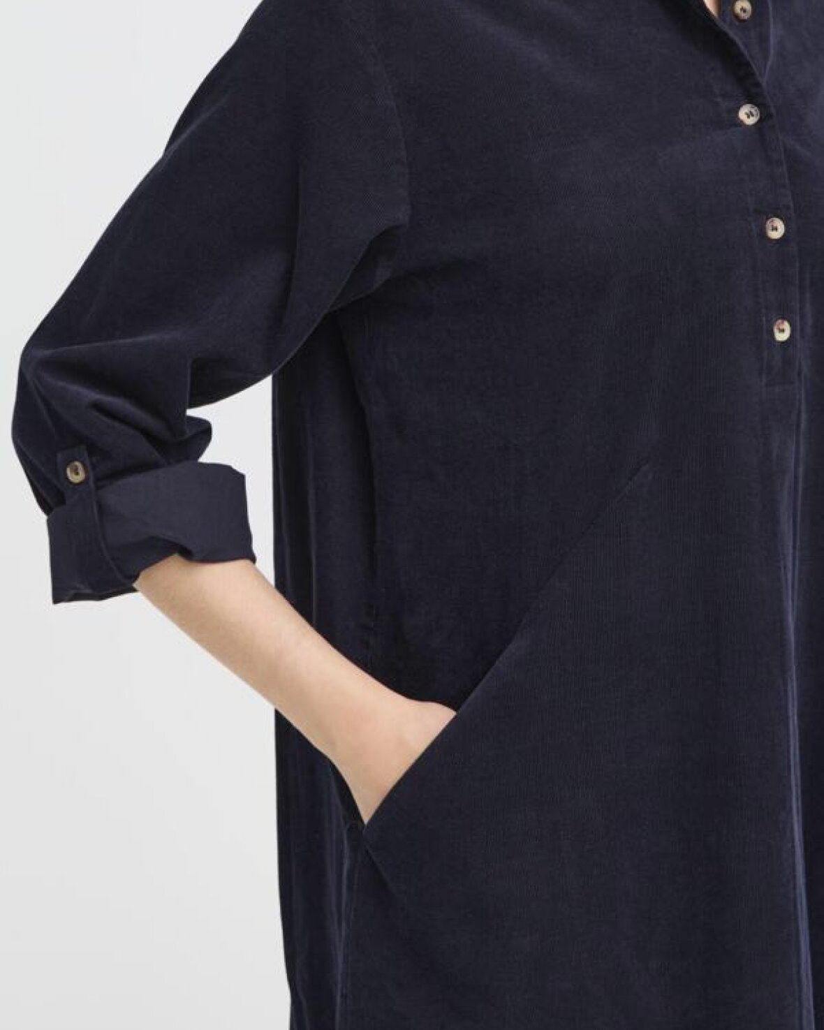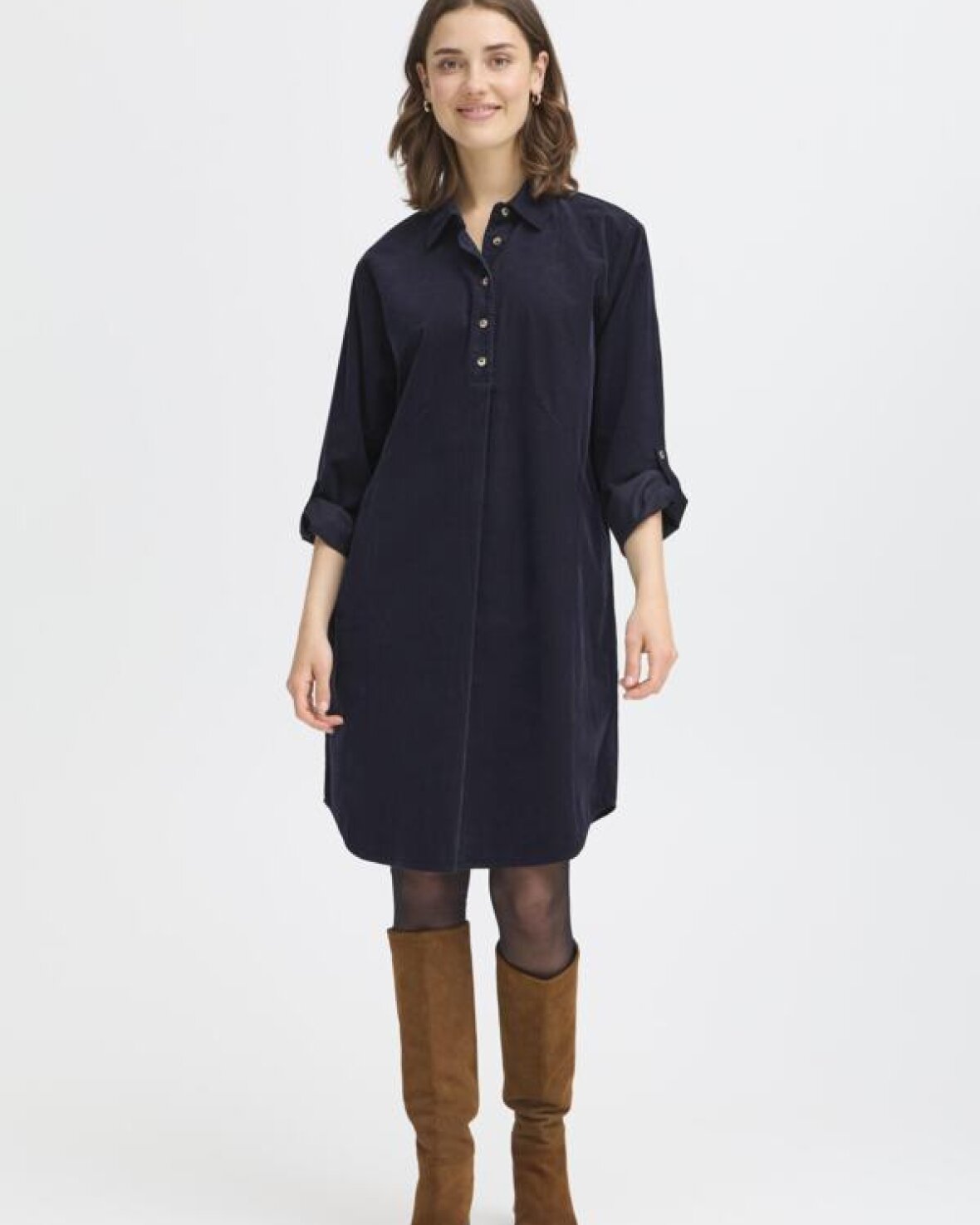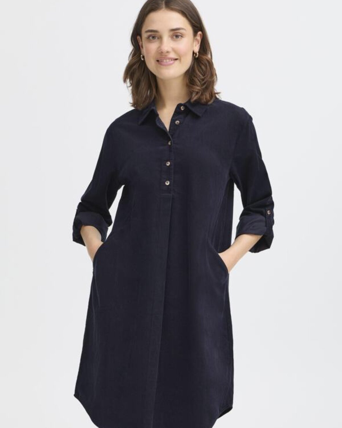 FRCORY KJOLE 2 - FRANSA er en smart skjortekjole med afslappet pasform og klassisk krave. Lange ærmer med manchetter og knaplukning. Komfortabel knælang model til mange anledninger.Kvalitet: 100% Bomuld