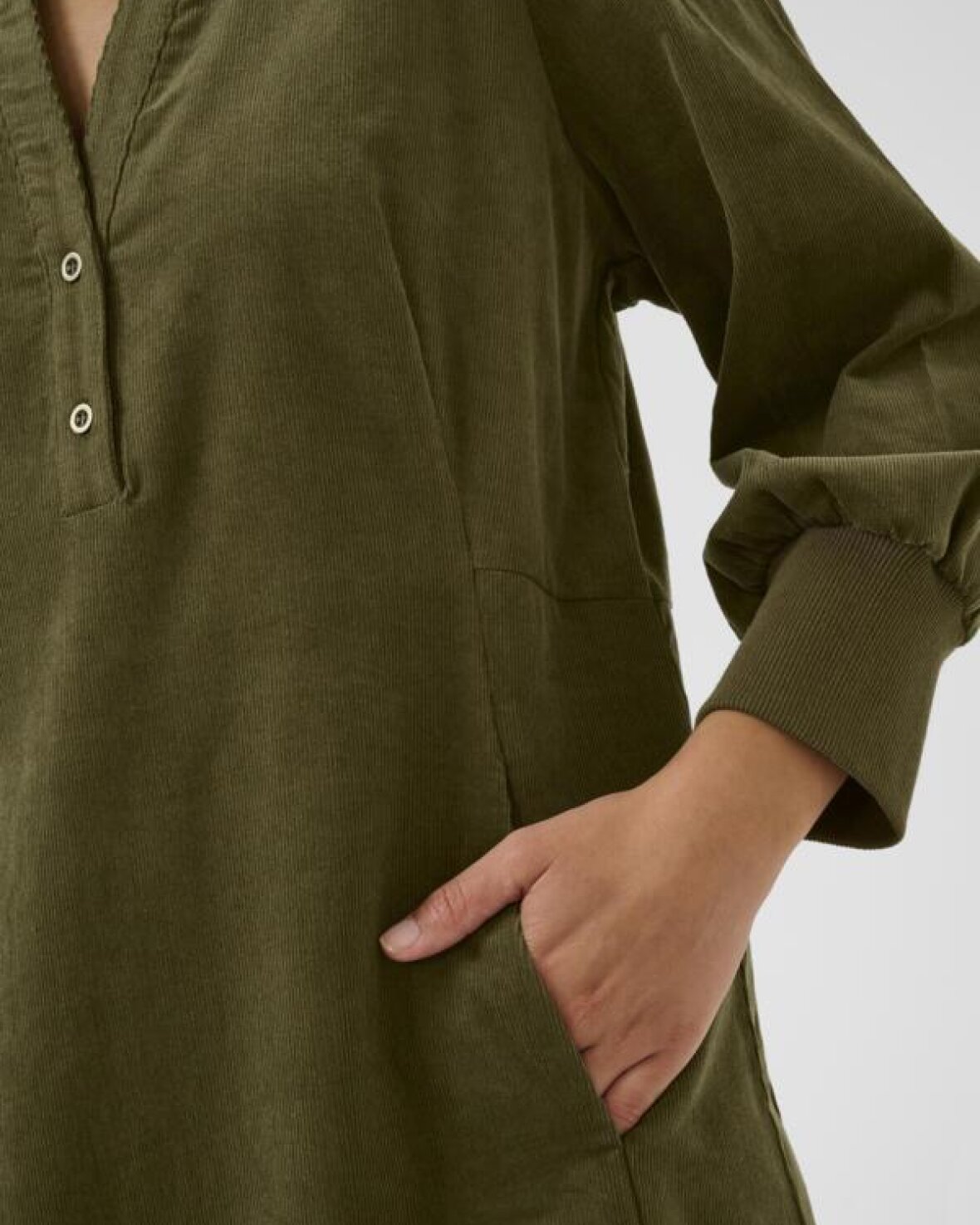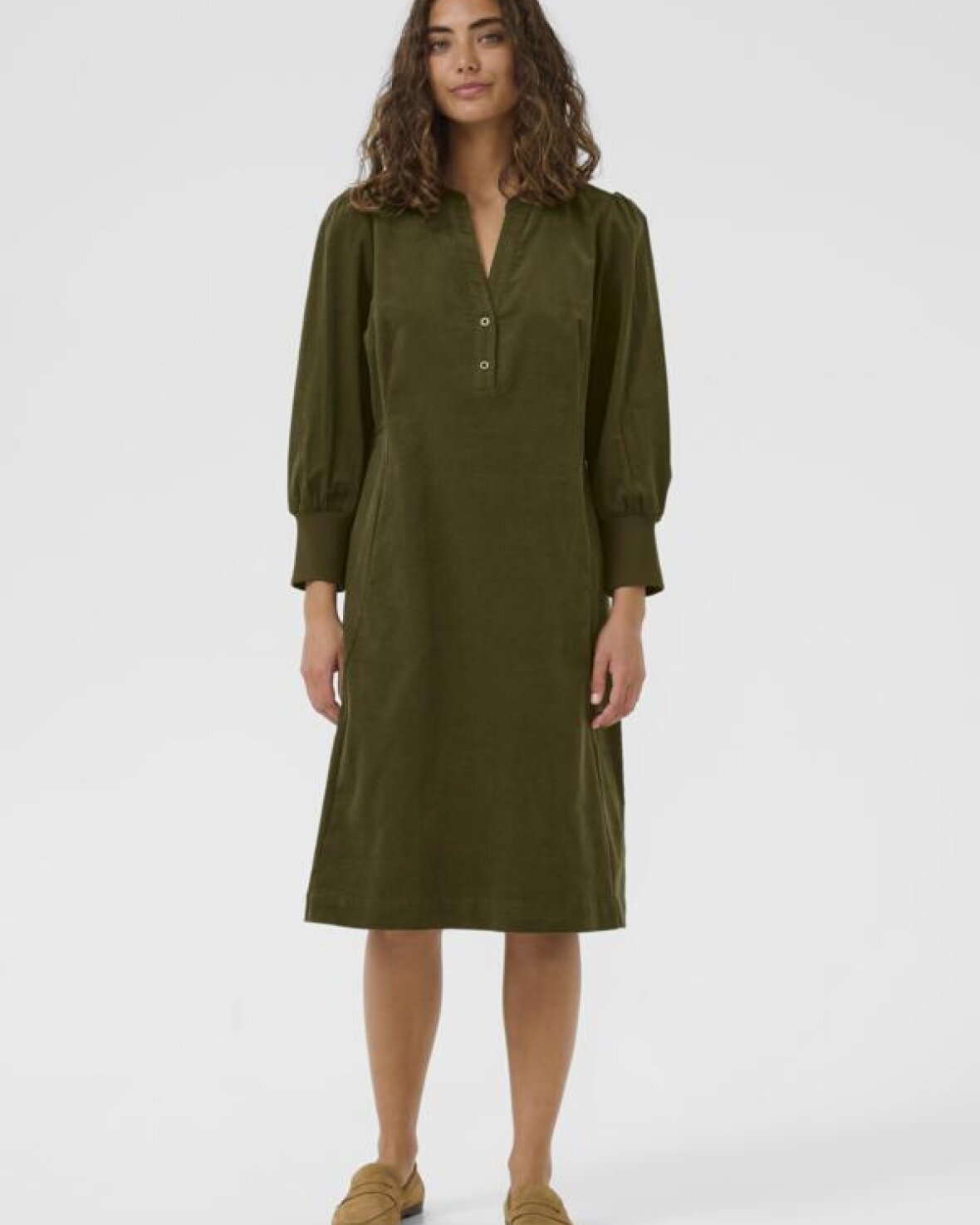 CURHAENA DRESS - CULTURE er en flot A-formet kjole til kvinder med en afslappet pasform, rund V-udskæring med knaplukning, trekvartærmer og knælang kjole. Tilbyder alsidig brug og øget komfort til både afslappede og kontormæssige omgivelserKvalitet: 100% bomuld
