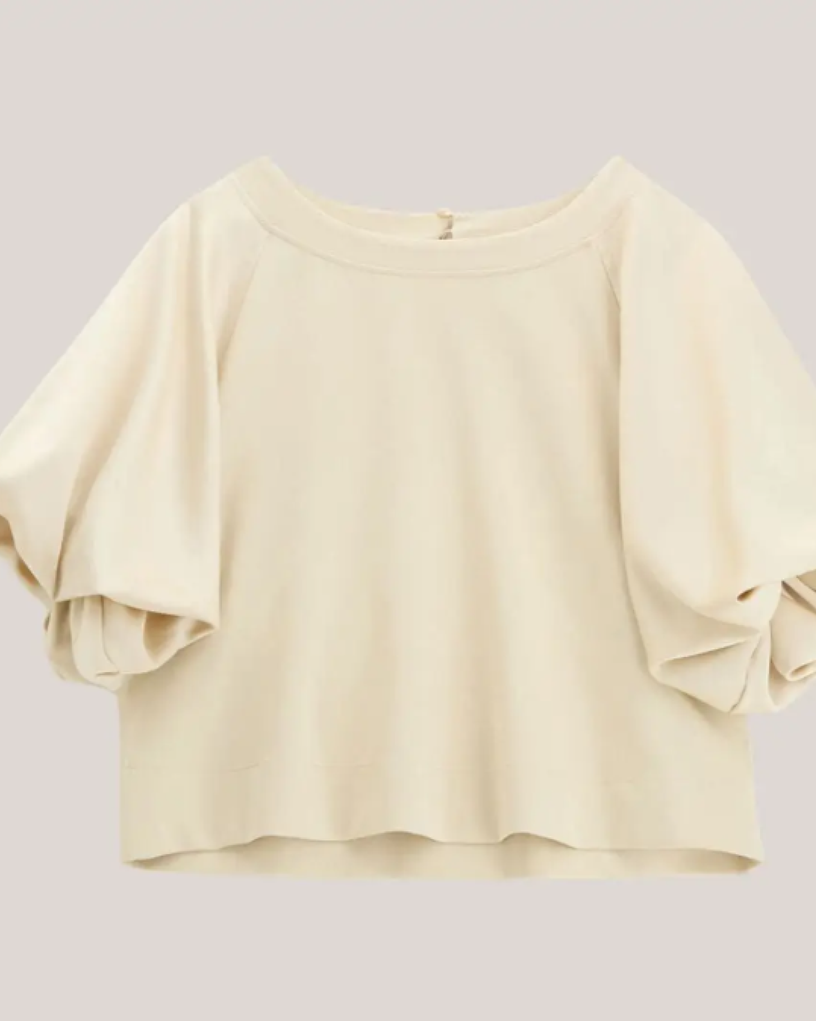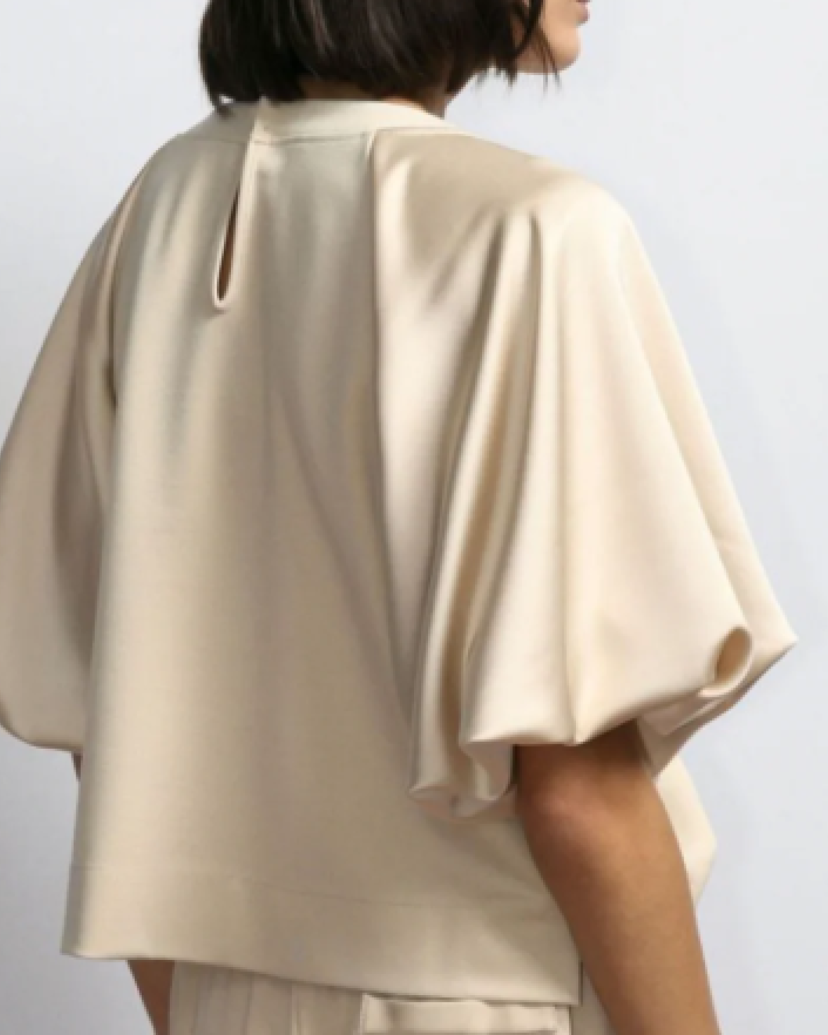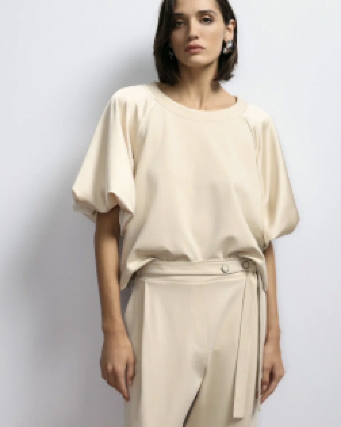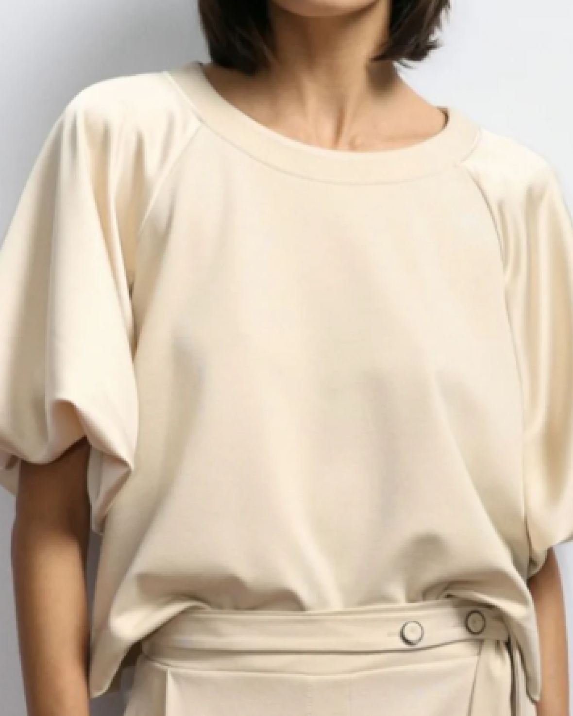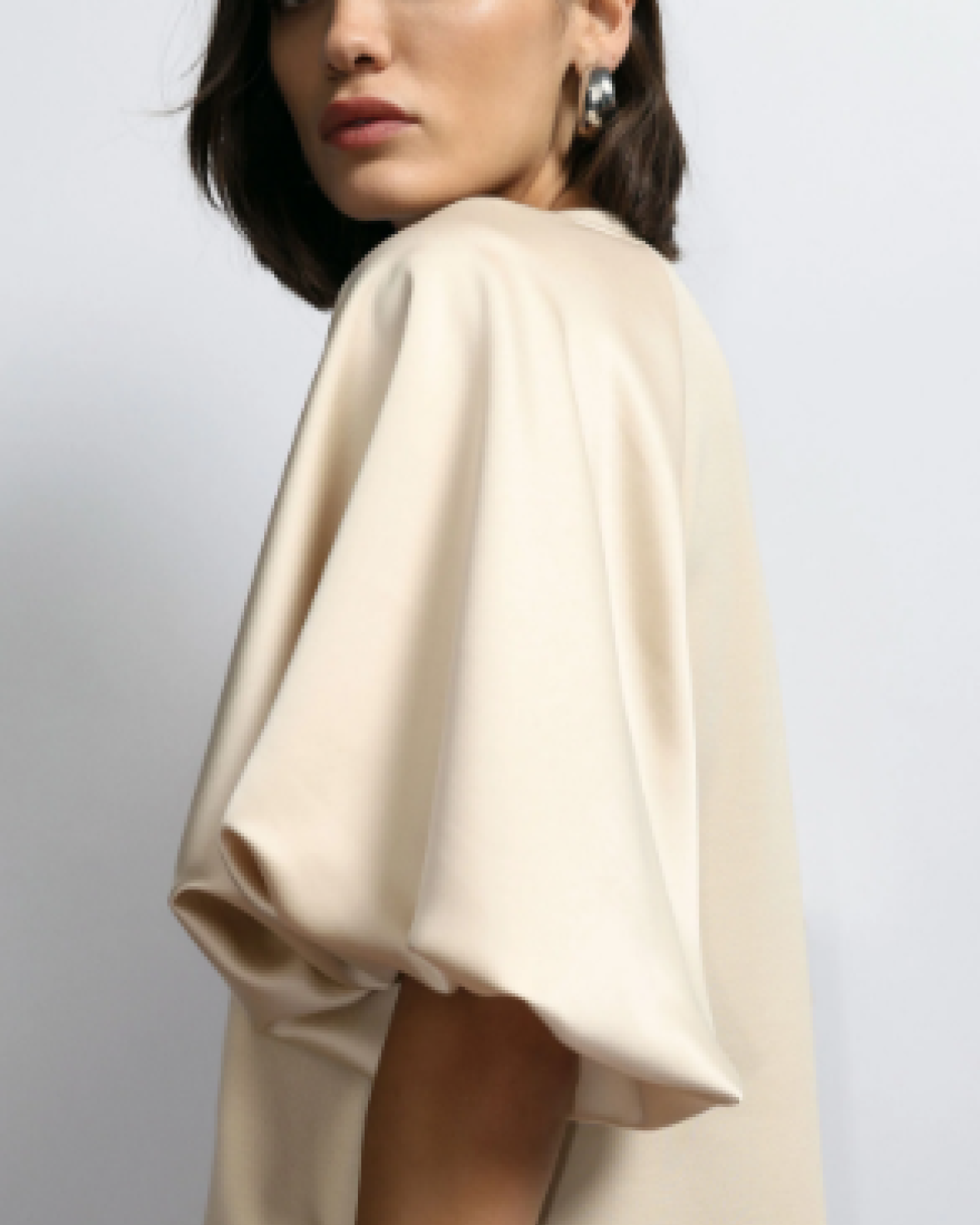 FI35KHZ TOP - IMPERIAL er en smuk bluse i den blødeste sweatshirt kvalitet, kombineret med blanke satin ærmer med elegant puf. Blusen har en rund hals, en lille knap i nakken og den fineste løse pasform. Som altid fra Imperial er det i eksklusiv, farveægte og strygefri kvalitet.Kvalitet: 62% Viscose 32% Polyamide 6% Elastan