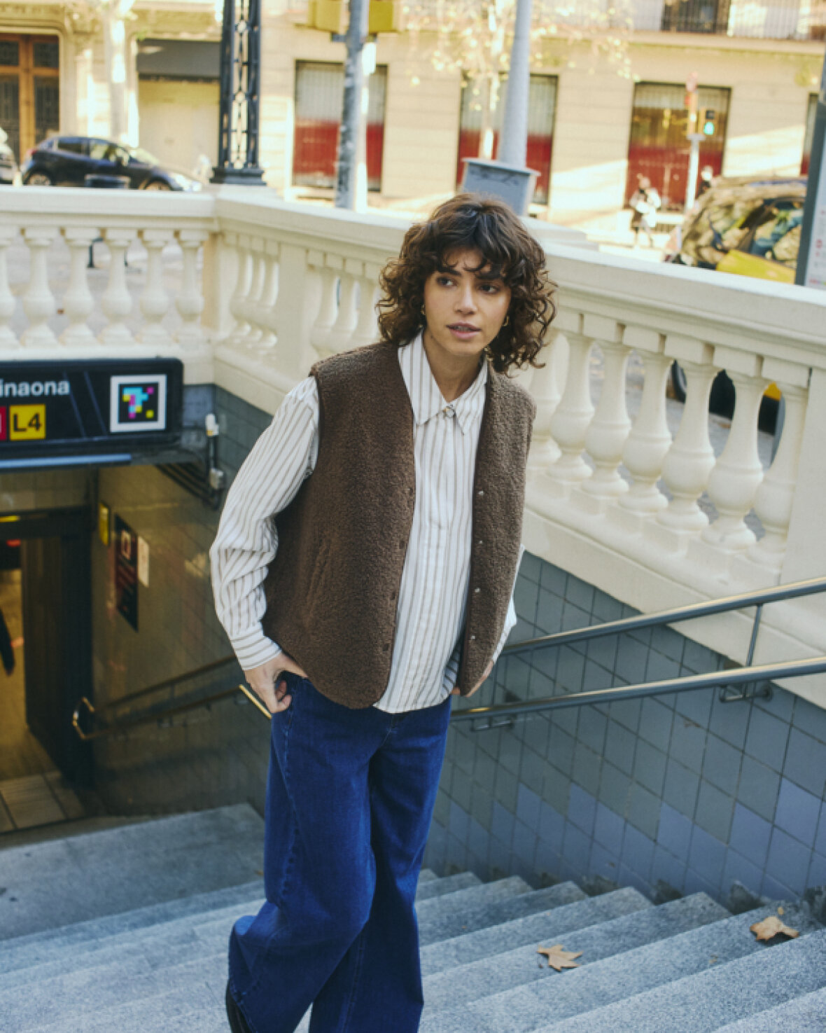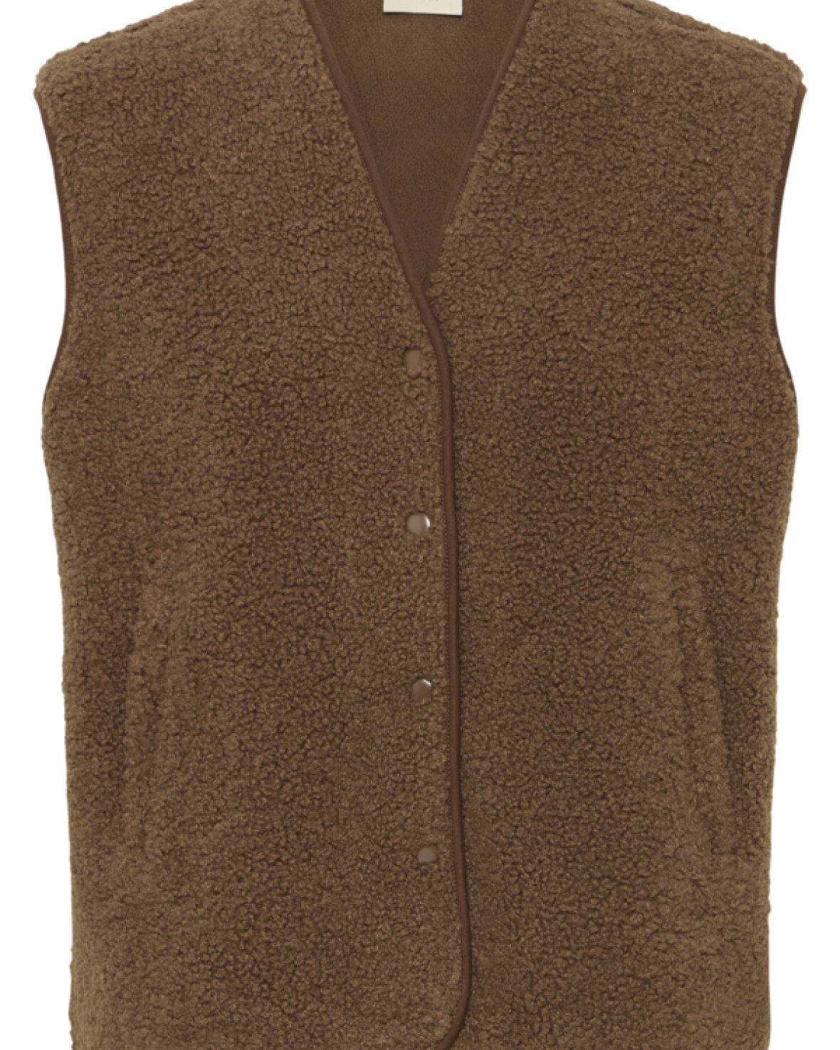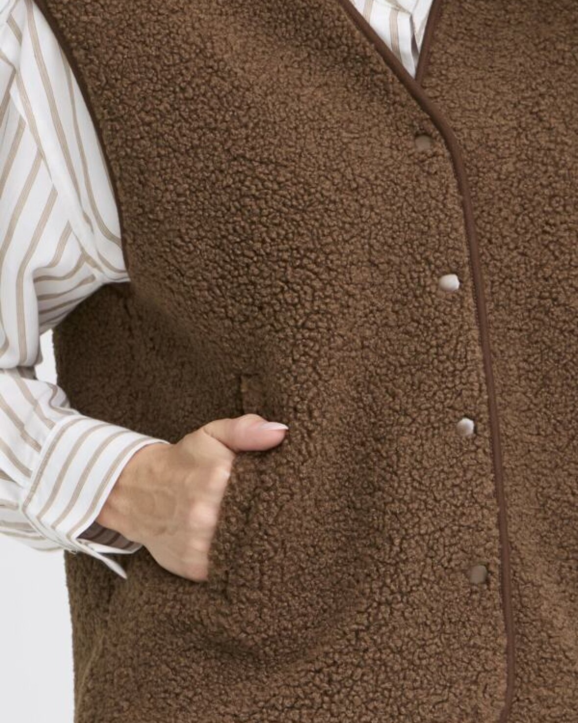 FRGWYNNE VEST - FRANSA er et musthave til lag-på-lag styling og afslappede hverdagslooks. Den er fremstillet i blød fleece, der giver en lækker, varm og komfortabel følelse hele dagen. Med sin afslappede pasform og tidløse design er den både praktisk og nem at style over alt fra skjorter og bluser til lette striktrøjer. Den har en klassisk V-udskæring og lukkes med trykknapper foran, hvilket gør den både funktionel og stilren. Den bløde tekstur tilfører et cozy element, mens det enkle snit sikrer, at vesten passer ind i enhver garderobe. Perfekt til hverdagsbrug – uanset om du er på farten, arbejder hjemmefra eller bare vil have et ekstra lag, når dagene bliver køligere. Fremstillet i polyester, som gør den let, holdbar og nem at vedligeholde.