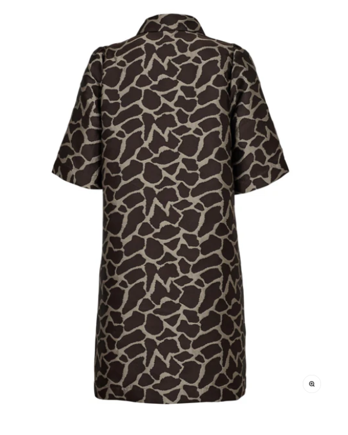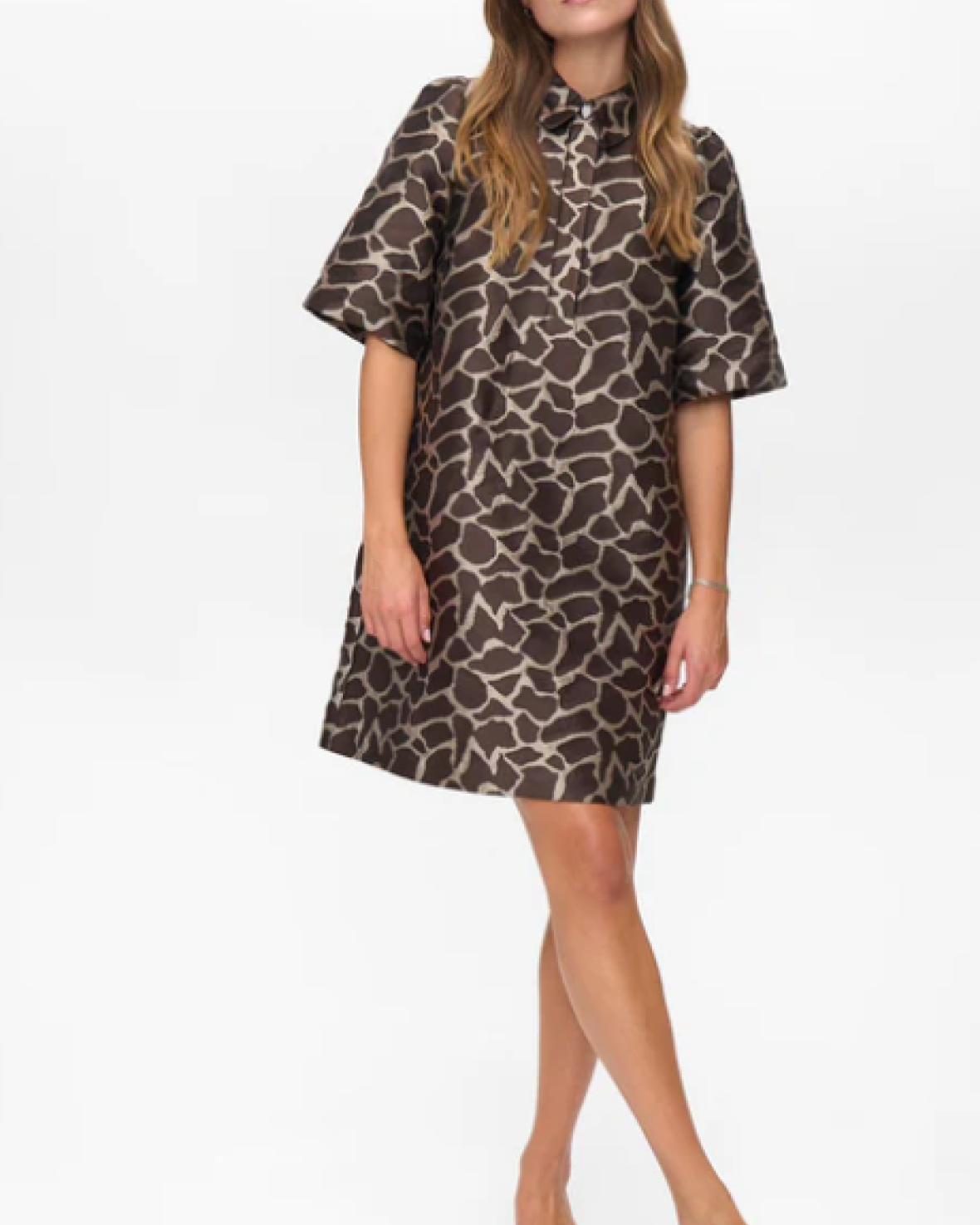 NUMING DRESS - NÜMPH er en skøn kjole med krave, skjult stolpelukning hvor den øverst er en smuk synlig hjerteformede knap. Kjolen er med korte pufærmer og lommer i siderne, samt længde til knæ. Kjolen er i en let kraftig blød og behagelig kvalitet med et flot mønster i sort brune farver.