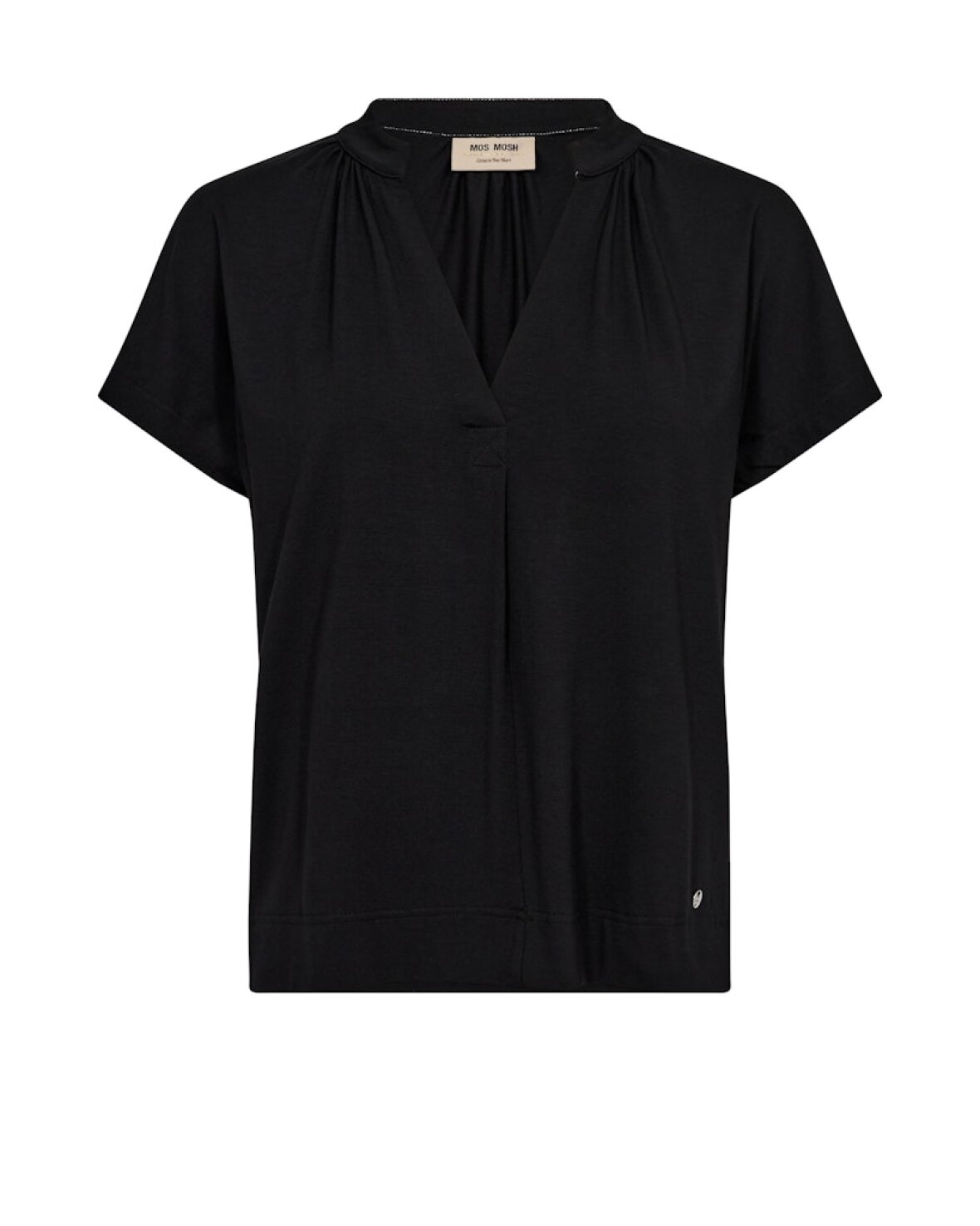MMSHIRA TEE - MOS MOSH giv din garderobe et pift med denne smarte T-shirt. Fremstillet i luksuriøs viskose og designet i en løs silhuet med en flatterende V-hals, der udstråler tidløs charme. Med bløde plisseringer som en sød detalje. Passer perfekt til jeans, en denimnederdel eller tailoring alt efter stylingbehov.