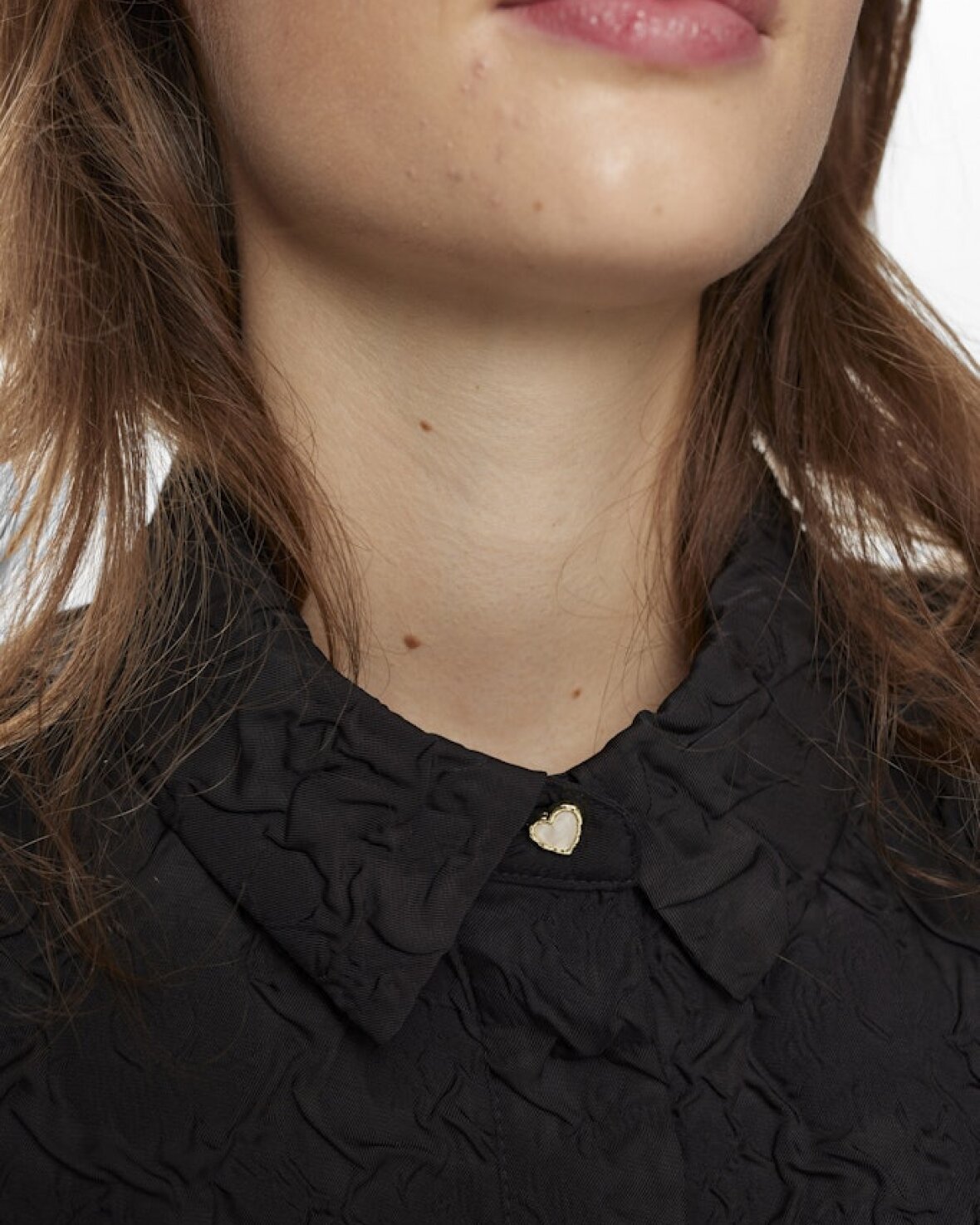 NUHUDA DRESS - NÜMPH er en elegant og feminin kjole i klassisk sort med smuk struktur i stoffet, den er med en løs pasform med fin længde på ærmerne samt en flot detalje med knappen i halsen også er den med skjulte lommer i siden.