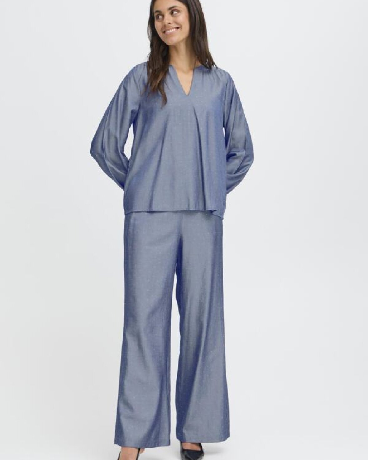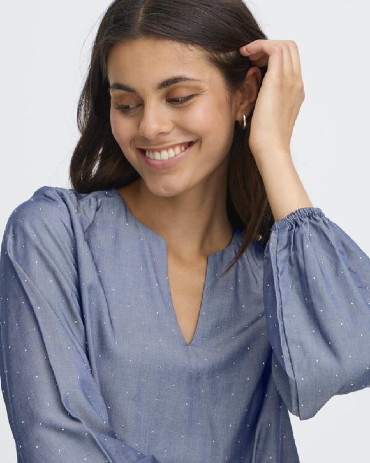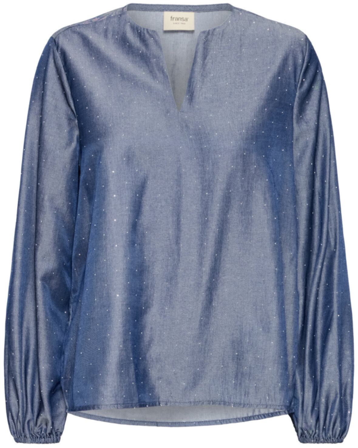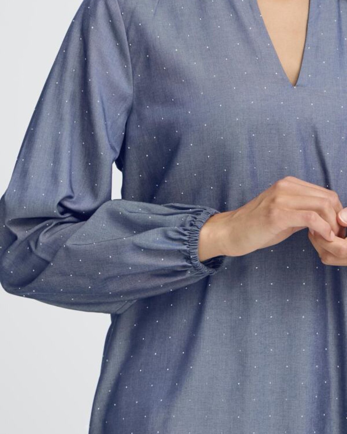 FRYUKKA BLUSE 1-FRANSA elegant og alsidig med en rund hals med V-udskæring og lange ærmer med elastikkant, hvilket giver et feminint udtryk, og den kan bruges til både hverdag og fest.Kvalitet: 70% Viskose, 30% Polyester.