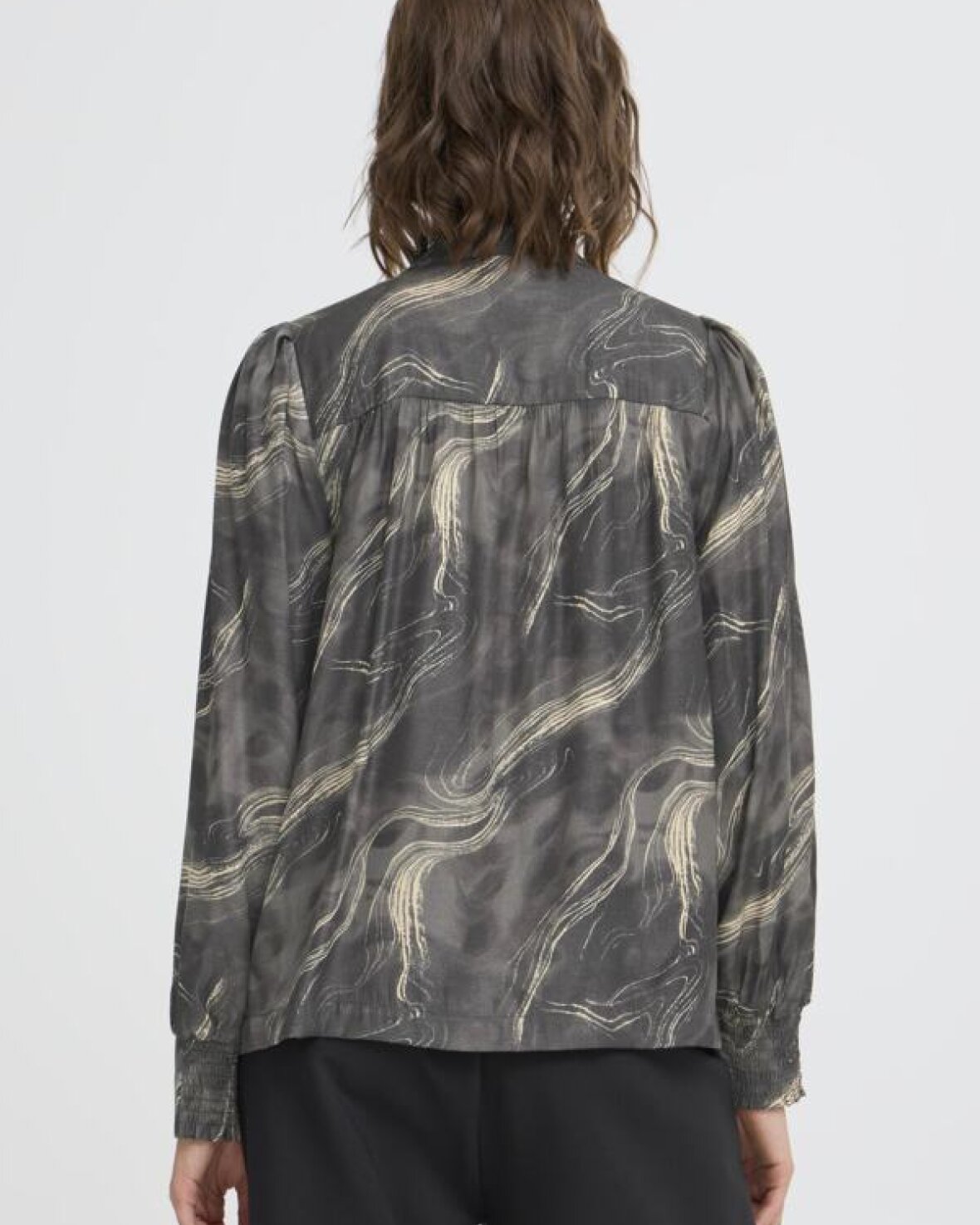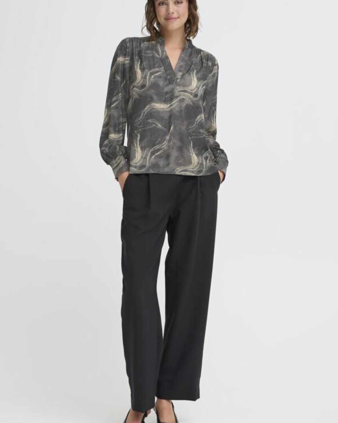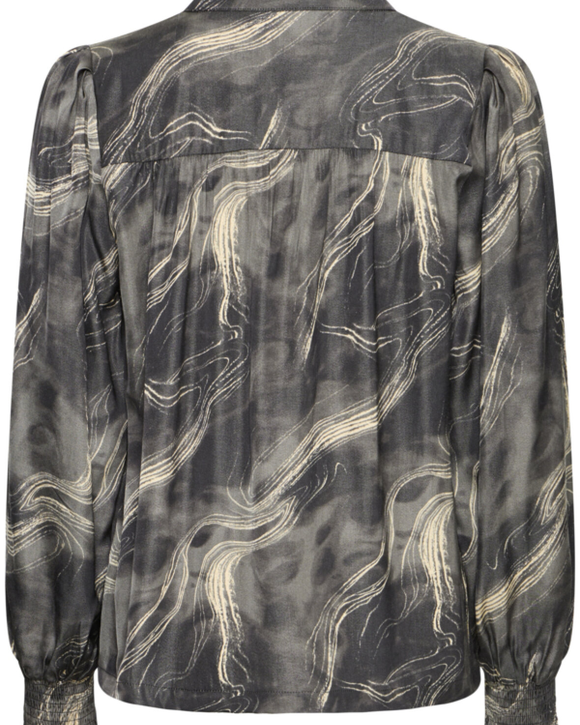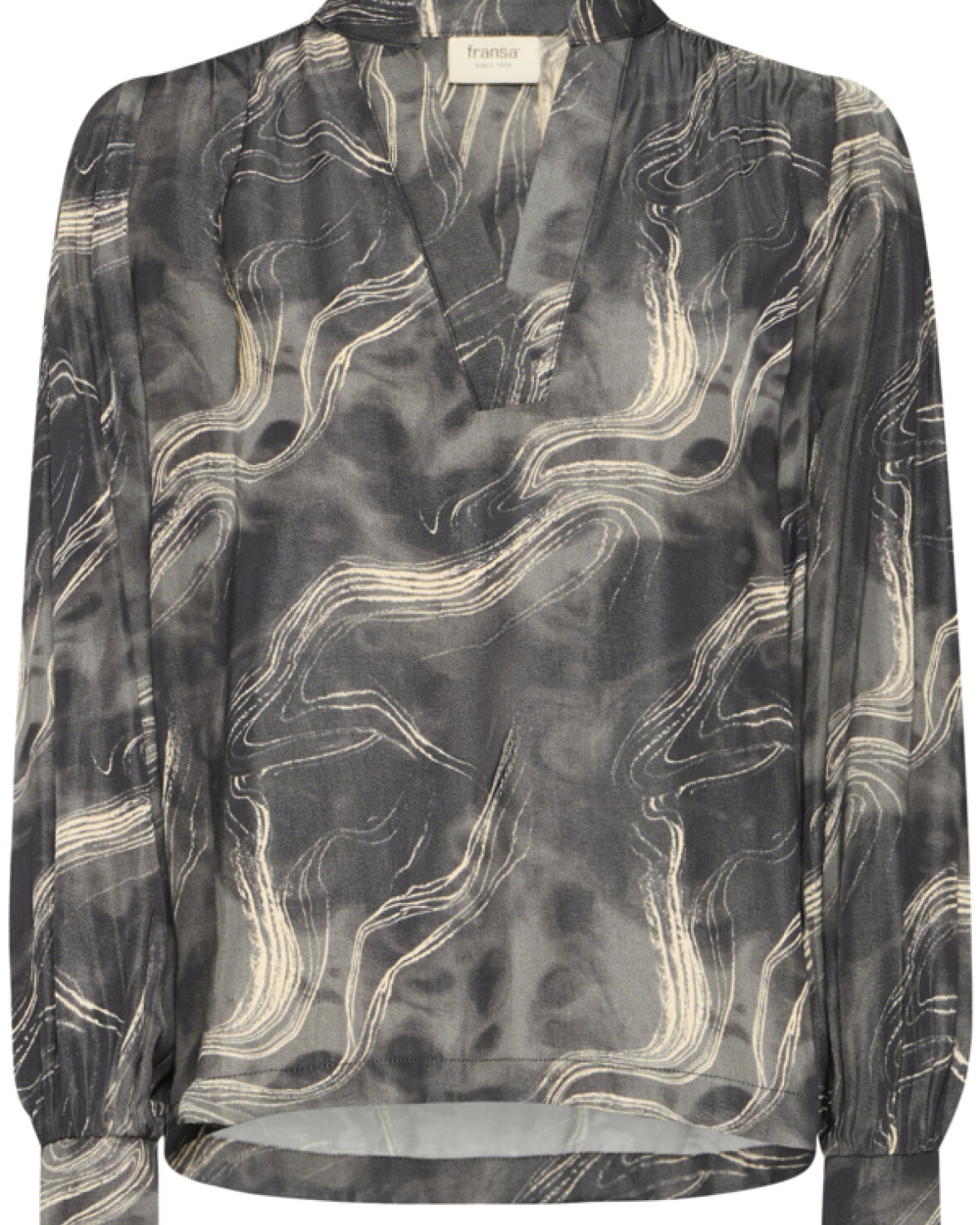 FRHATTI BLUSE 1-FRANSA Denne elegante bluse kombinerer et unikt mønster med en feminin silhuet. Designet har en smuk V-hals og lange ærmer med manchet, der giver et raffineret udtryk. Det grafiske print i gyldne nuancer på mørk bund tilfører blusen et eksklusivt look, som gør den perfekt både til kontoret og til festlige anledninger. Den let løstsiddende pasform gør den behagelig at have på og nem at style med både bukser og nederdel.Vask: Skånevask 30 grader anbefales