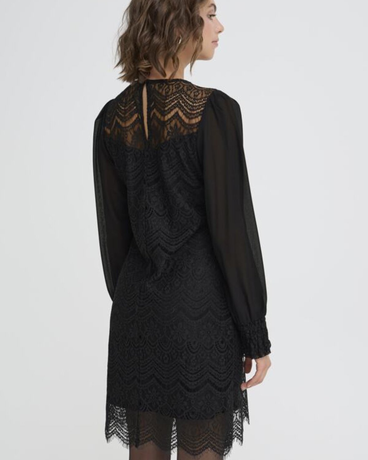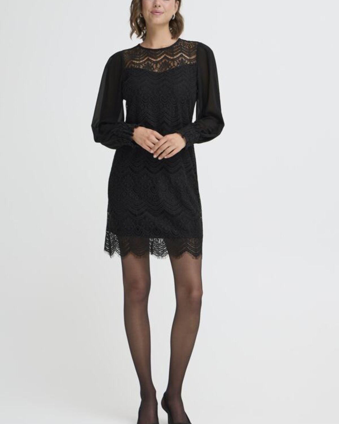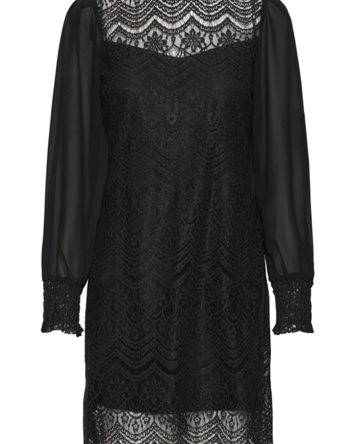 FRCATY KJOLE 1-FRANSA er en fin lace-kjole med lige pasform, transparente lange ærmer og detaljeret bølget kant. Rund halsudskæring og indviklet blonde-look for et sofistikeret udtryk.
