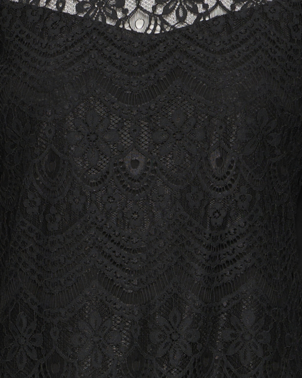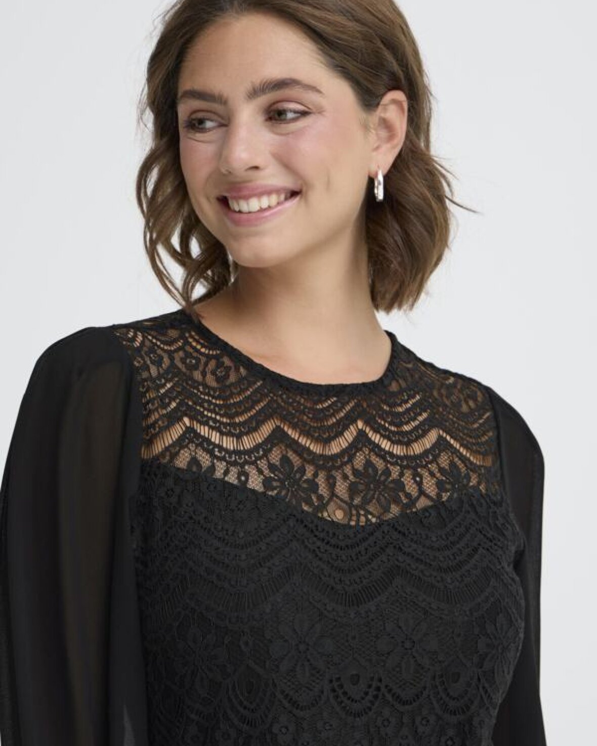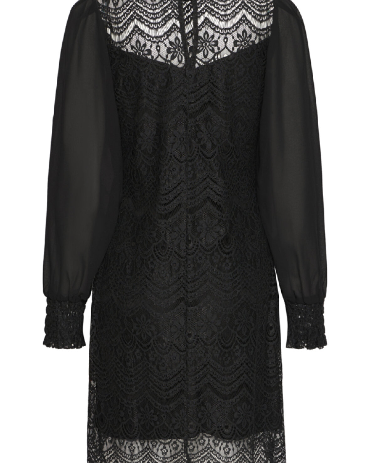 FRCATY KJOLE 1-FRANSA er en fin lace-kjole med lige pasform, transparente lange ærmer og detaljeret bølget kant. Rund halsudskæring og indviklet blonde-look for et sofistikeret udtryk.