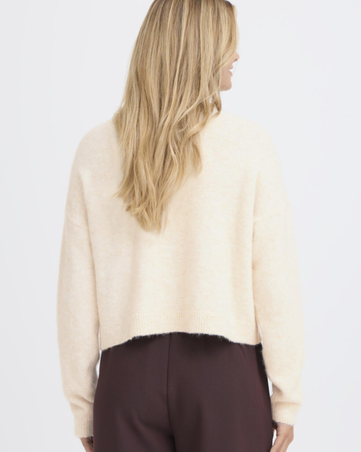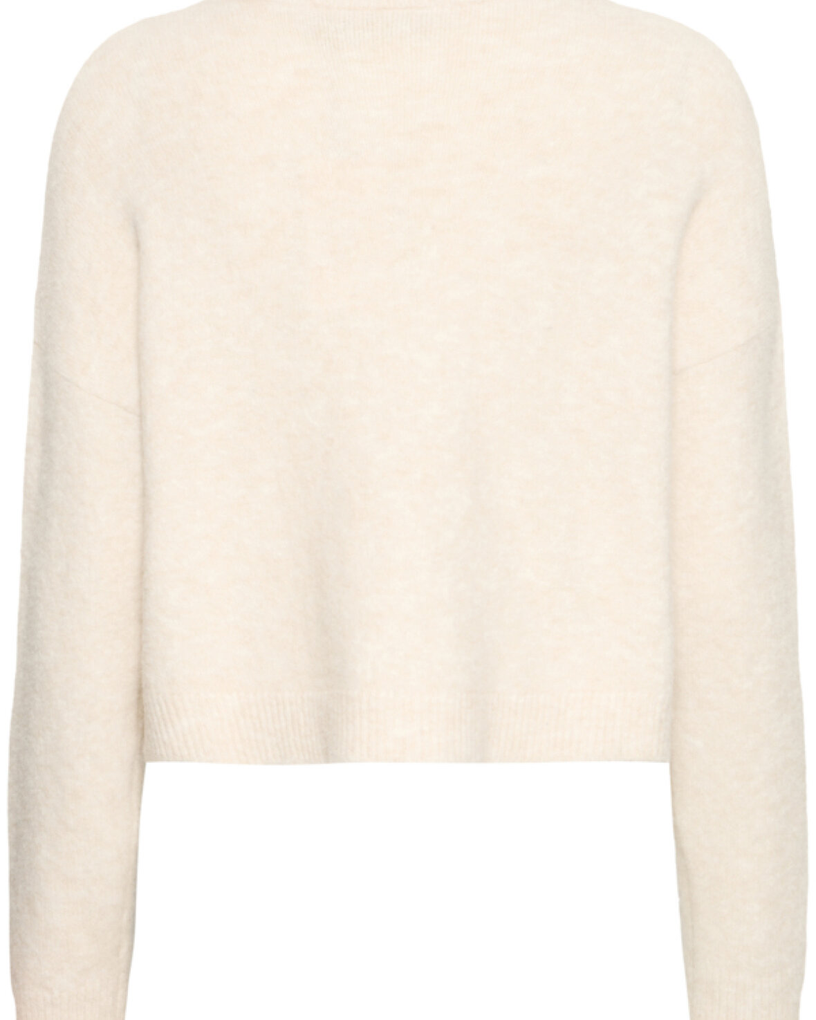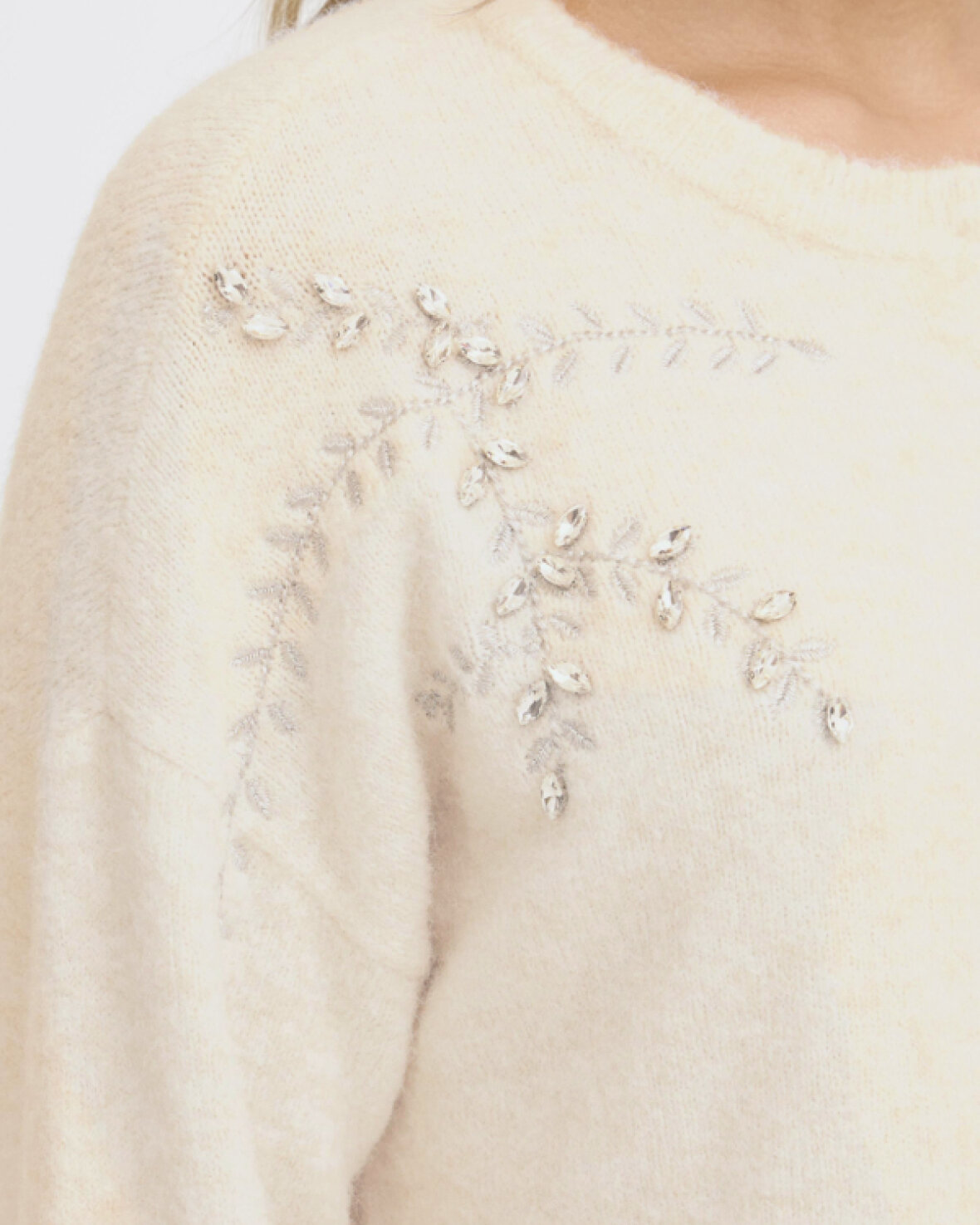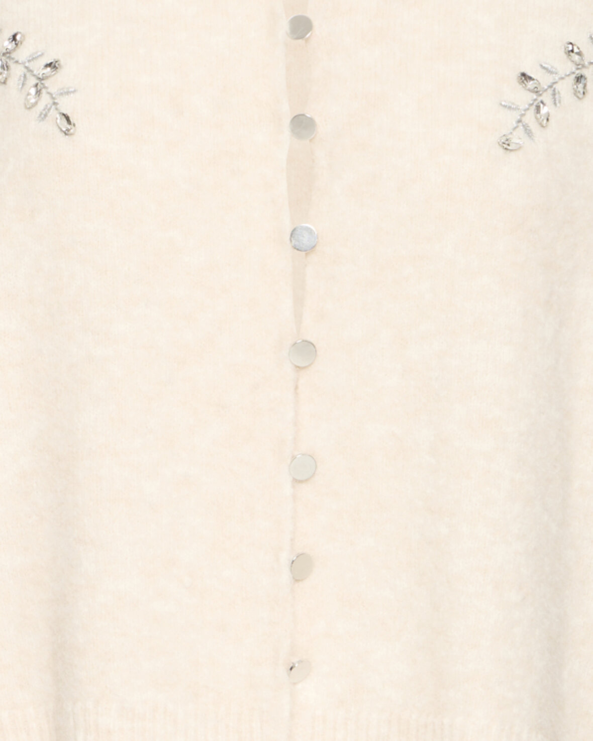FRKENDRA CAR 3 - FRANSA kombinerer klassisk elegance med et feminint udtryk. Den er strikket i en blød, lun kvalitet, der føles behagelig mod huden og giver et eksklusivt look. De fine sølvfarvede broderier og små perler på skuldrene tilføjer et diskret, festligt touch.