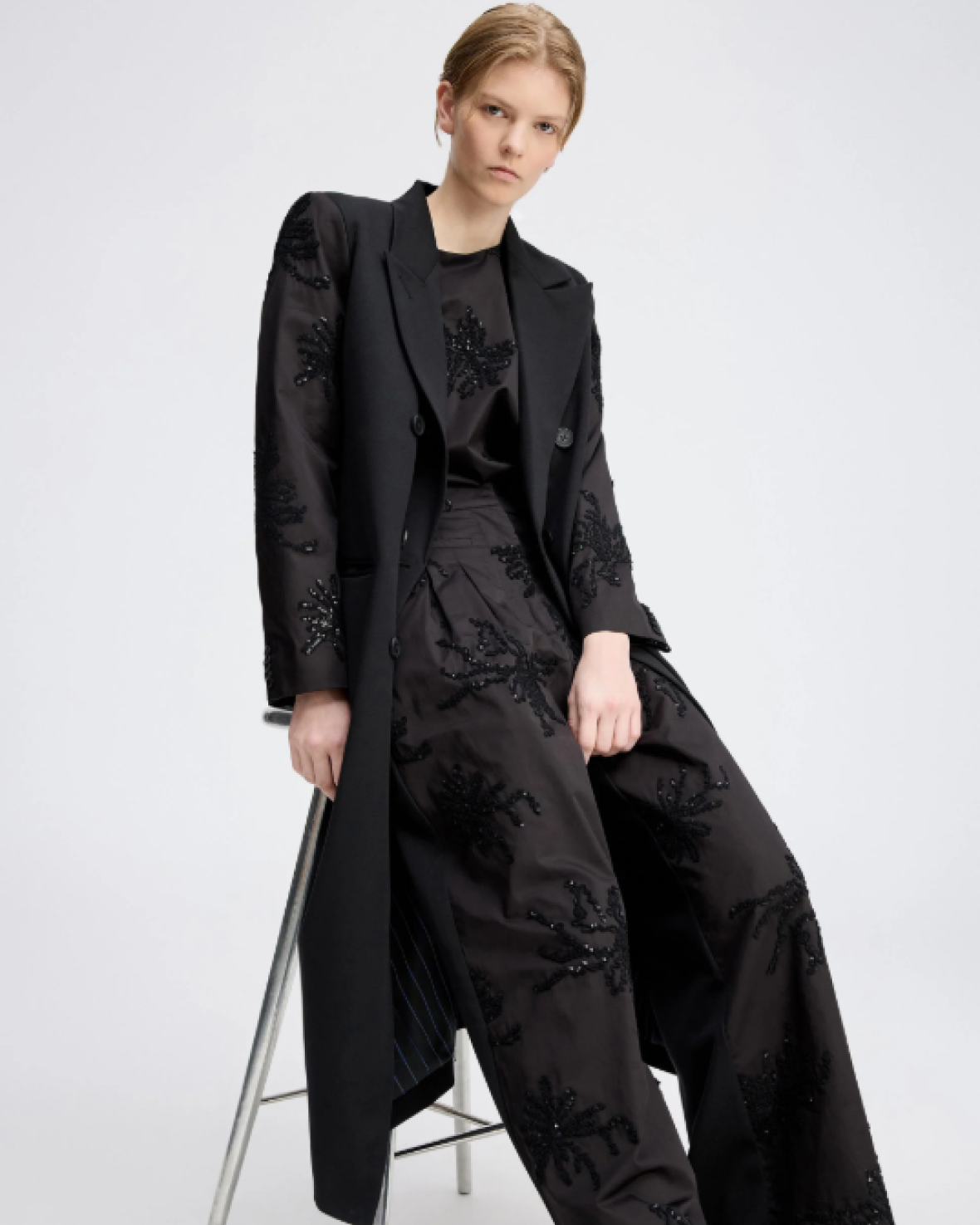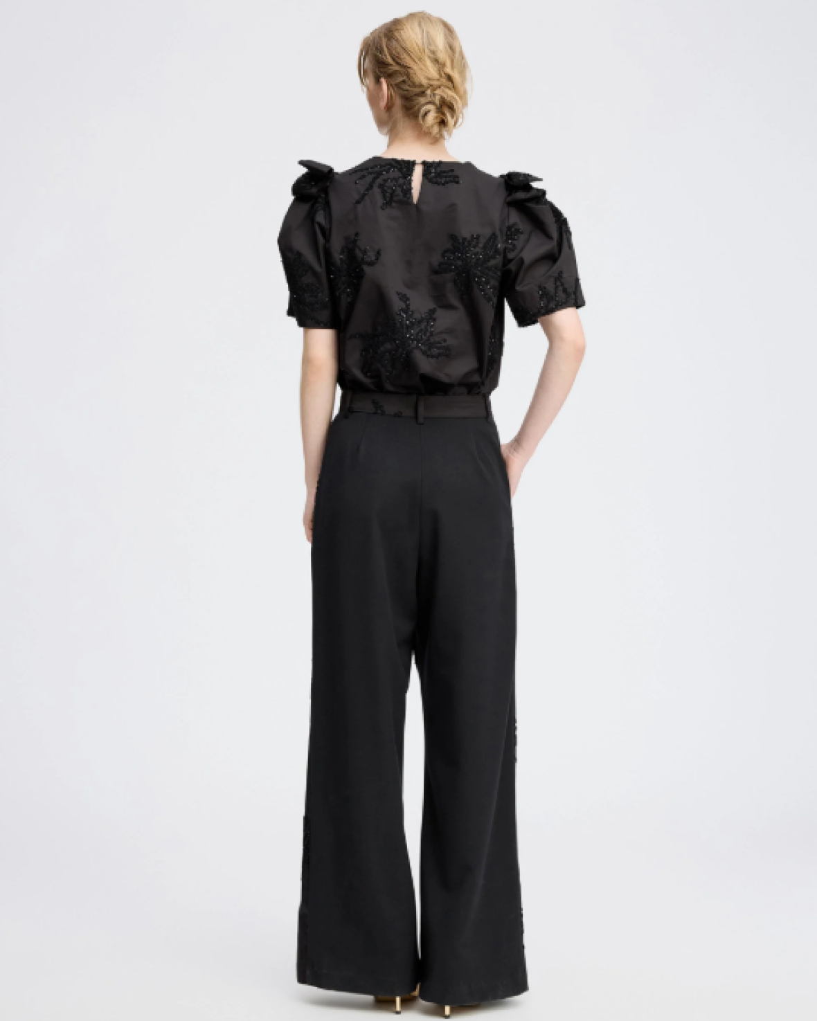 RYME BLUSE - MUNTHE er en yderst elegant sort bluse med korte, brede ærmer og dekorative pailletbroderier. Blusen har en løs pasform og smukke detaljer på skuldrene, som giver et eksklusivt og festligt look.