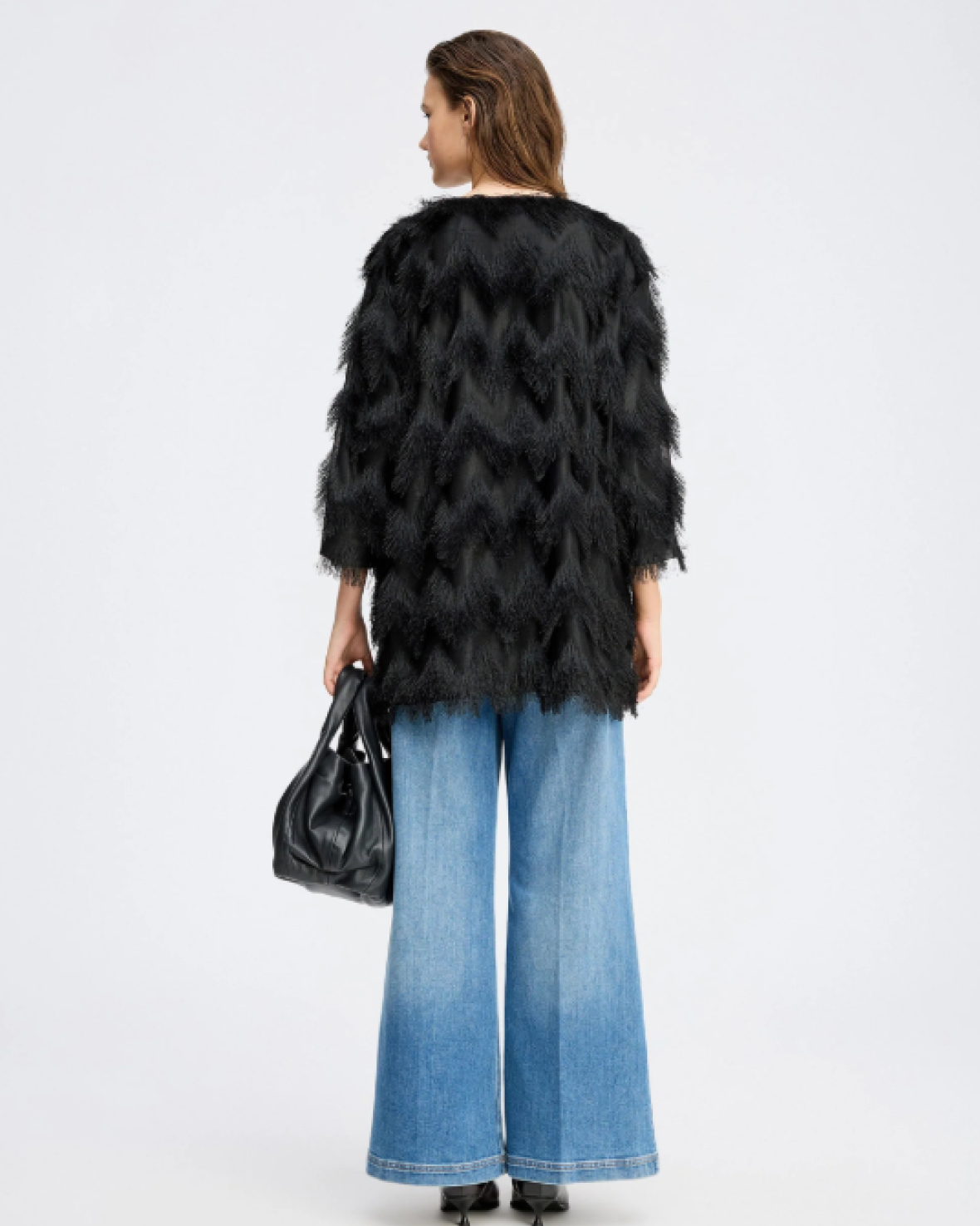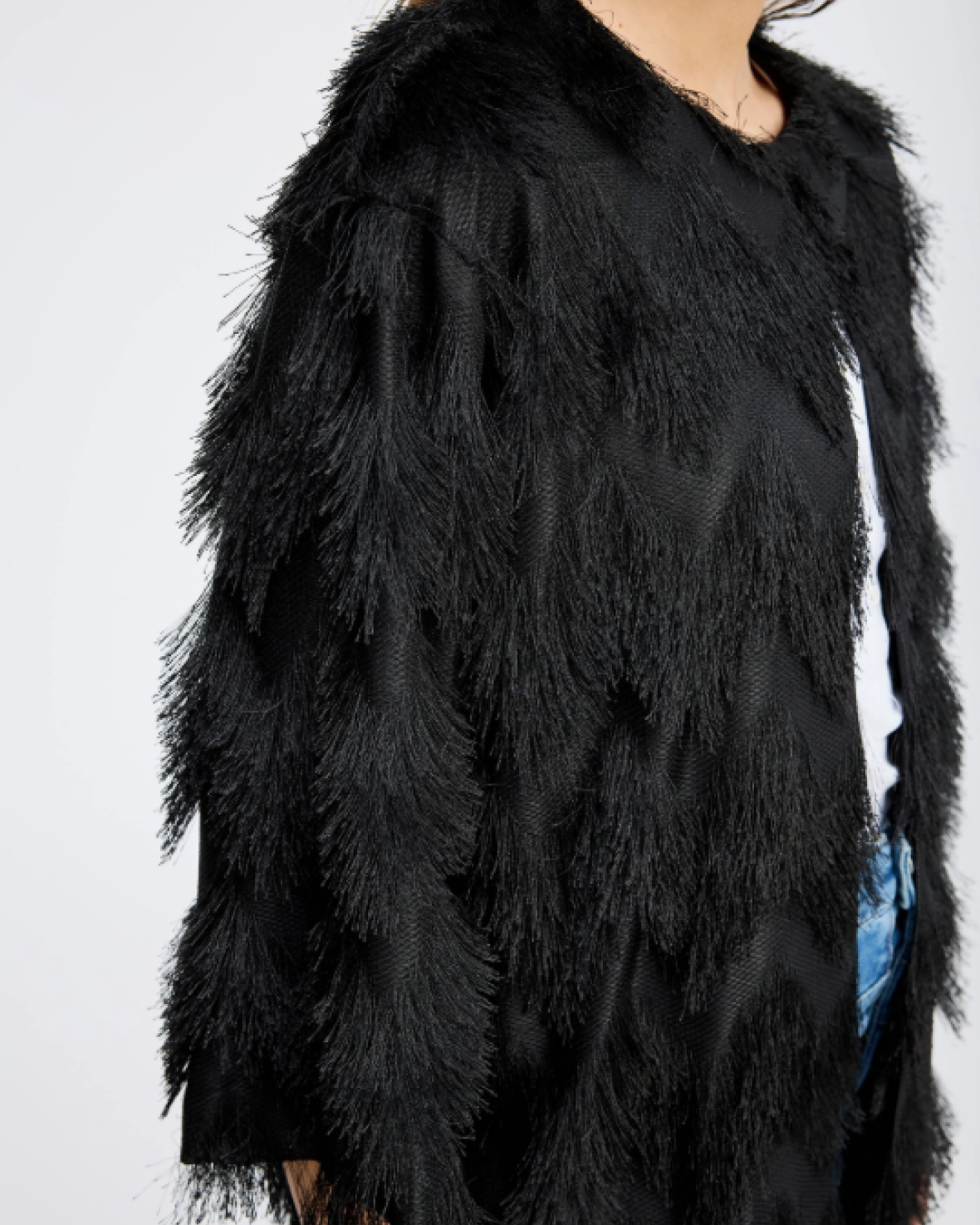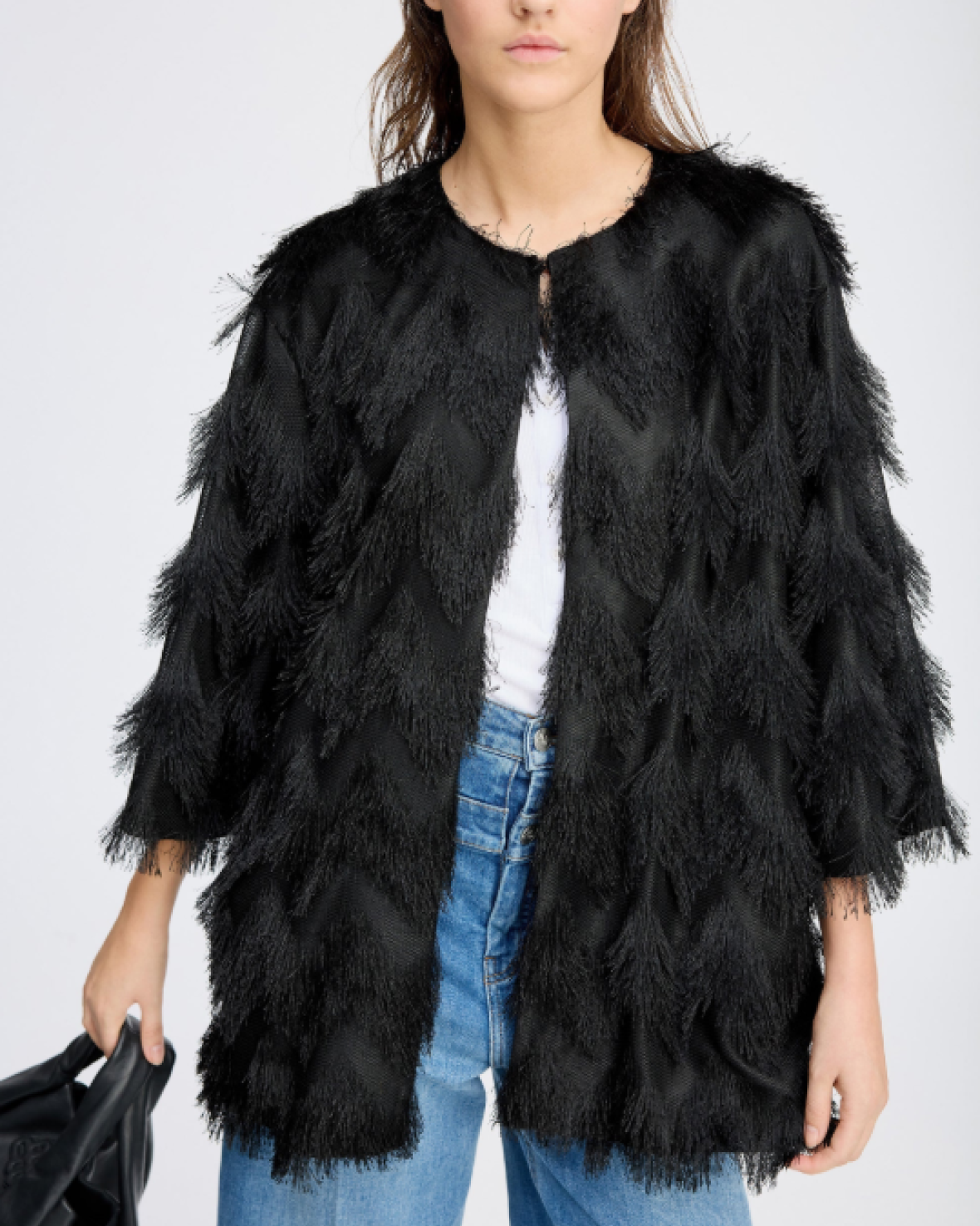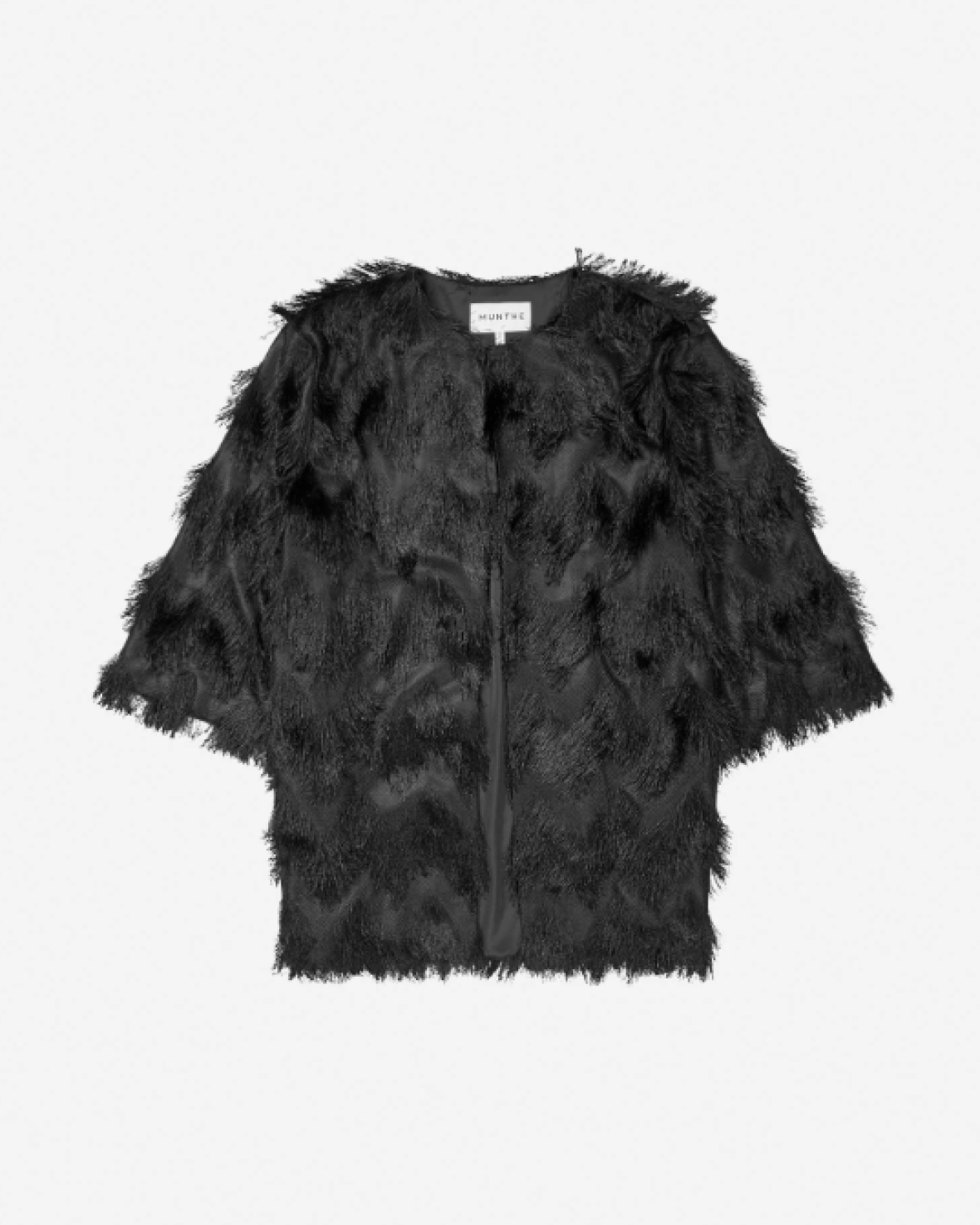 ROSAVILLA JAKKE - MUNTHE er en stilfuld sort statement-jakke med flot frynset tekstur i et diskret zigzag-mønster. Designet med rund halsudskæring og 3/4-lange ærmer. Jakken lukkes elegant med en hægte øverst ved halsen.