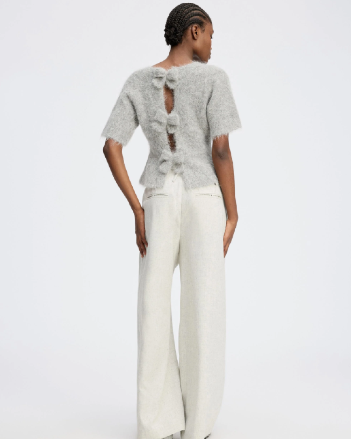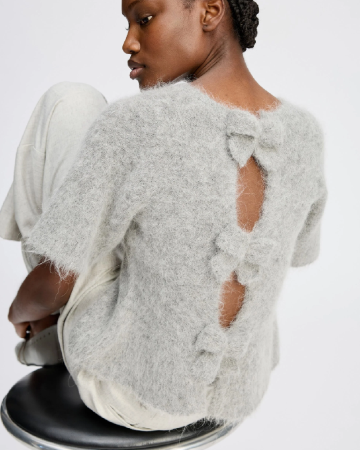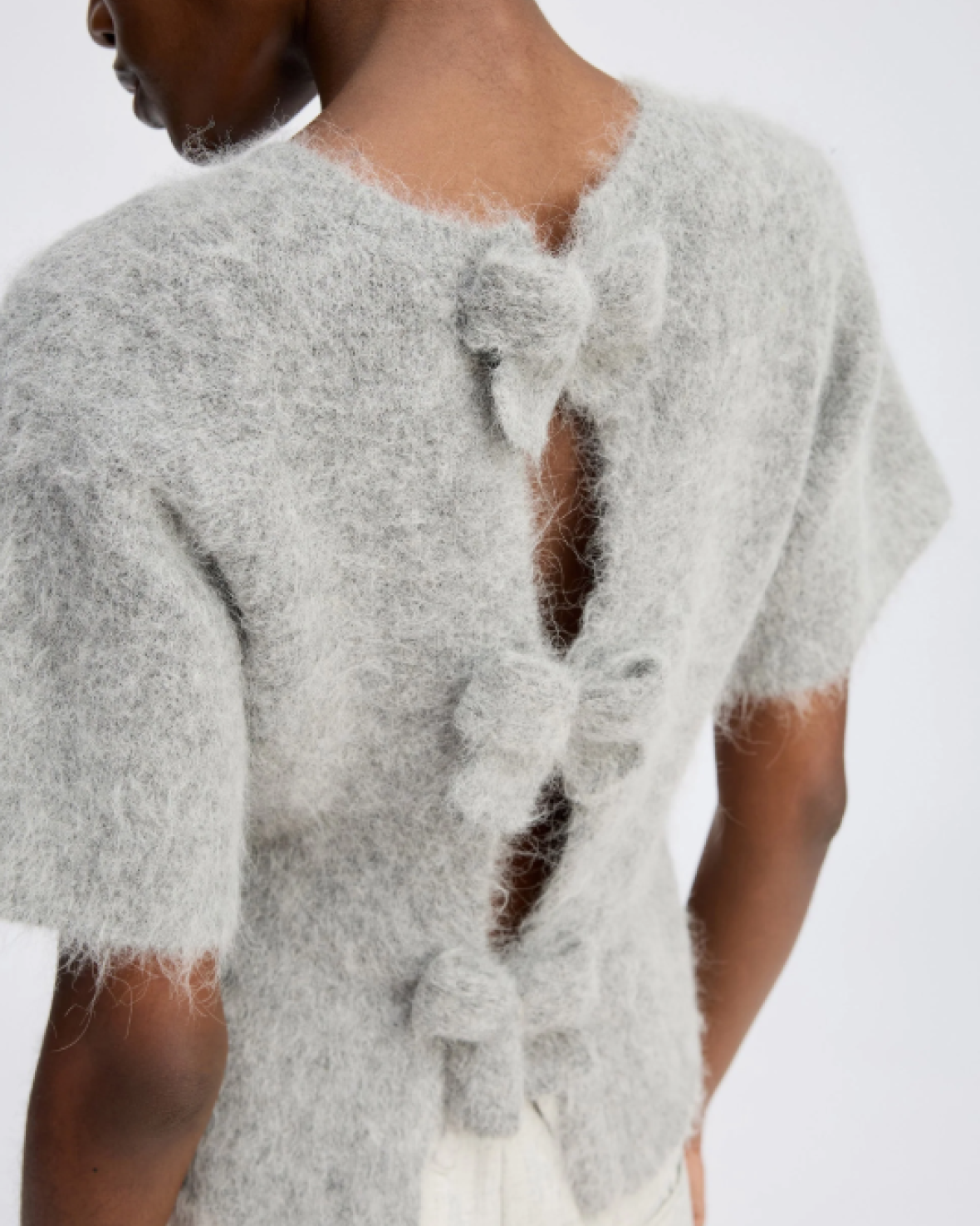 RYLALINE STRIK - MUNTHE er en feminin, blød kortærmet strik med tre smukke sløjfer på ryggen. Den nederste del af strikken er designet med en let peplum-effekt.