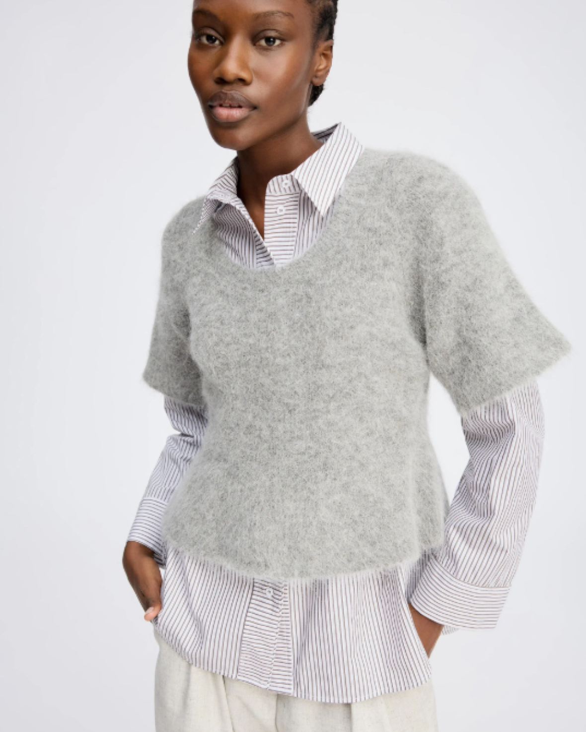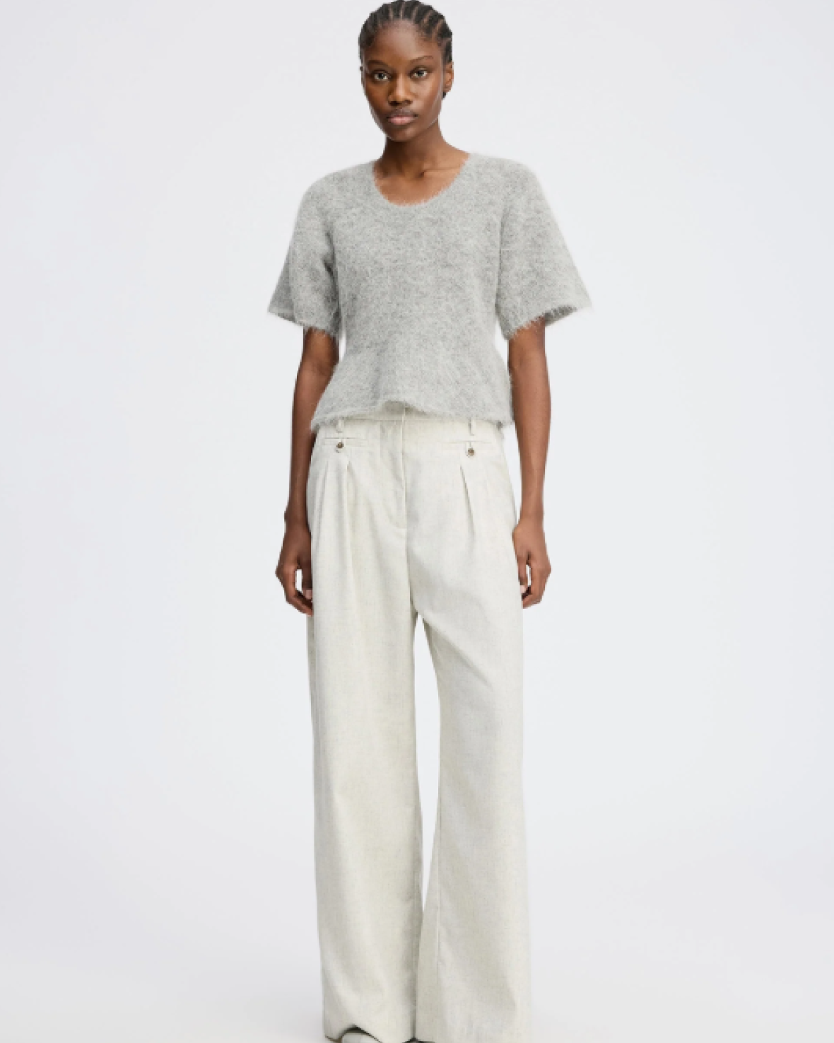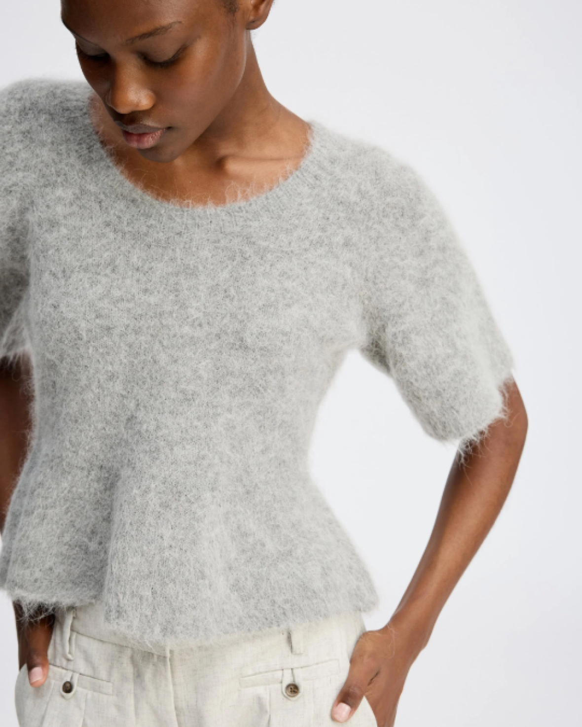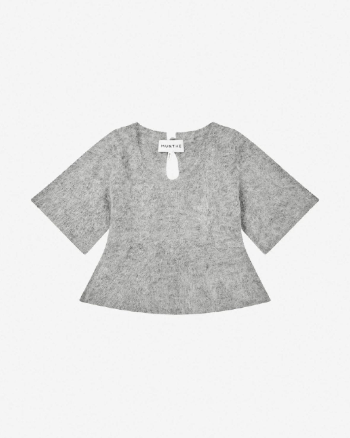 RYLALINE STRIK - MUNTHE er en feminin, blød kortærmet strik med tre smukke sløjfer på ryggen. Den nederste del af strikken er designet med en let peplum-effekt.