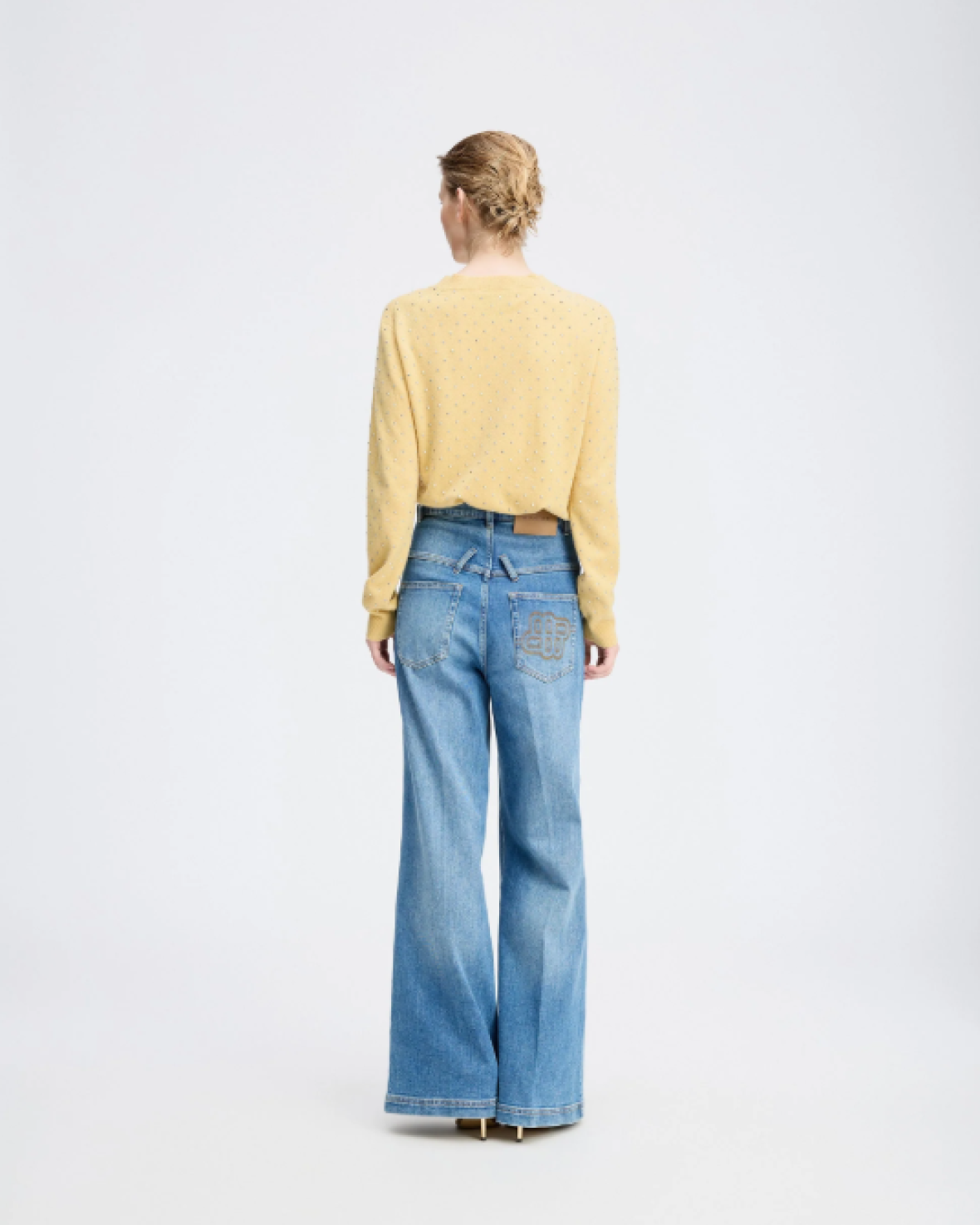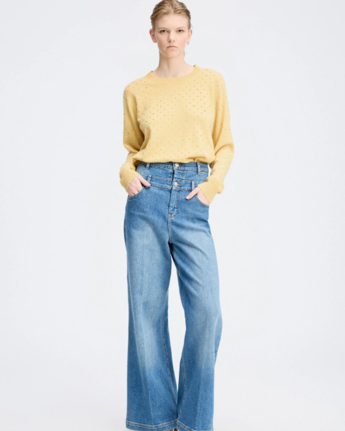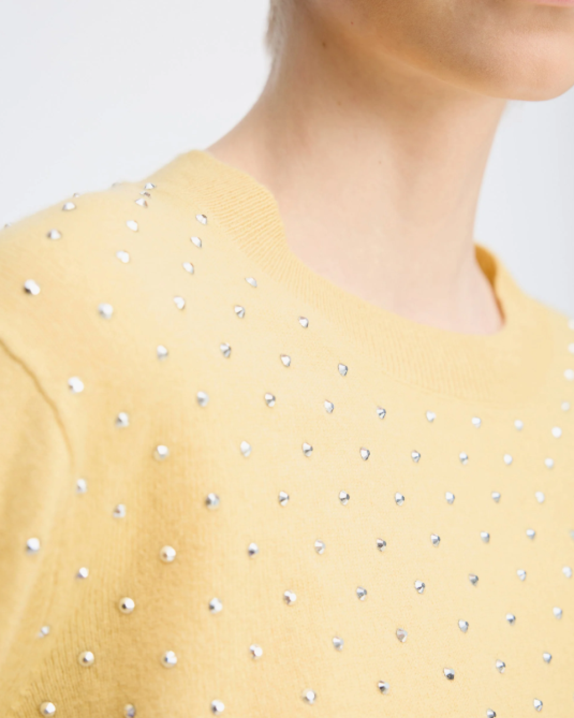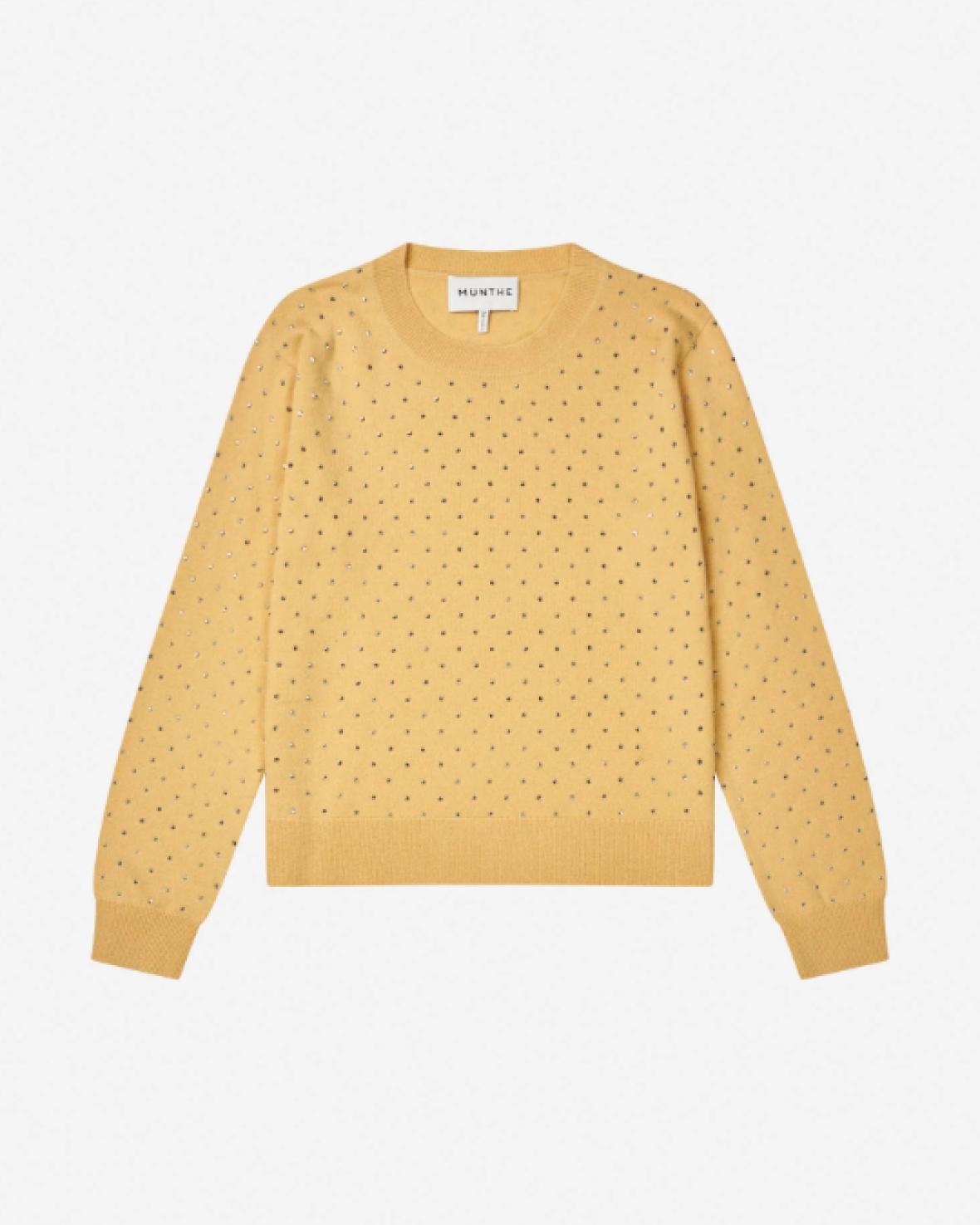 RELINA STRIK - MUNTHE er en smuk, frisk og blød striktrøje med elegante sølvfarvede nitter. Strikken har en klassisk rund halsudskæring og lange ærmer med ribkanter.