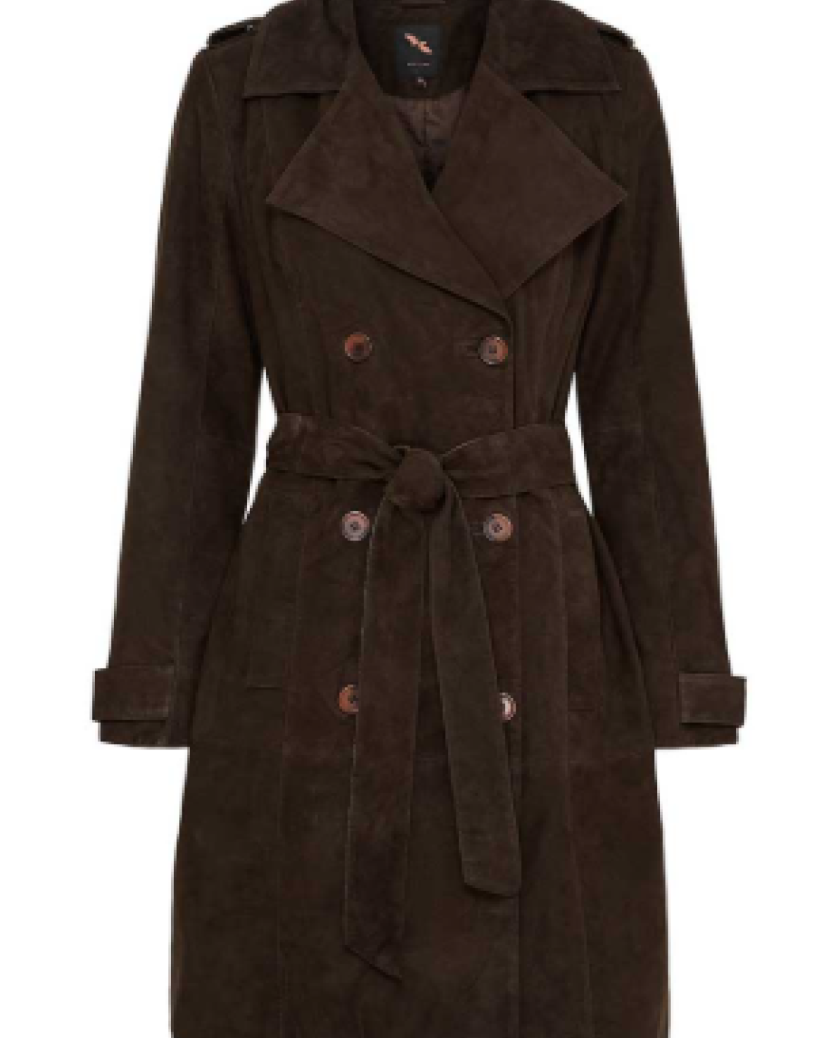TRENCHCOAT SUEDE - BTF-CPH er en trendy, tidløs, og eksklusive i klassisk trenchcoat stil i blødt ruskind. Trenchcoaten er med krave, lukkes med dobbeltradet knapper og med bindebånd i taljen. Brug bæltet i taljen bundet eller som hængende løs evt. bundet på ryggen. Dekorative stropper med knap ved skuldrene samt for enden af ærmerne. Den er både feminin og rå og kan bruges som en del af din styling.