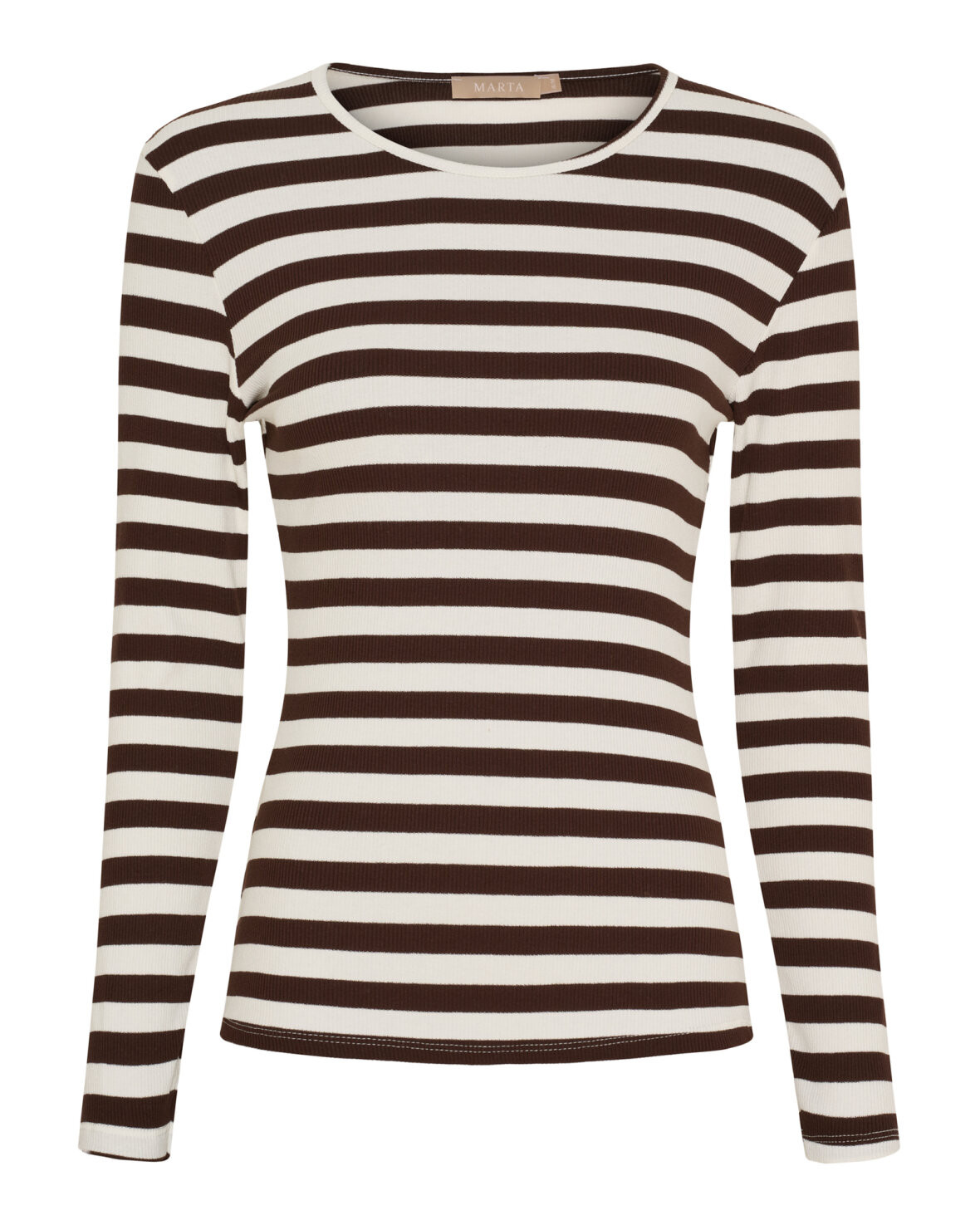 T.shirt 7702 Marta Du Chateau er et elegant og tidløst must-have til garderoben. Denne langærmede tee har en let, luftig kvalitet og en ren silhuet, der gør den alsidig til både hverdag og pænere anledninger. Rund hals og ribkanter giver et klassisk udtryk, mens den tætsiddende pasform sikrer komfort og et flatterende look. Perfekt at style med jeans, nederdel eller under en skjorte som et blødt lag.Kvalitet: 97% Viskose, 3% Elastan