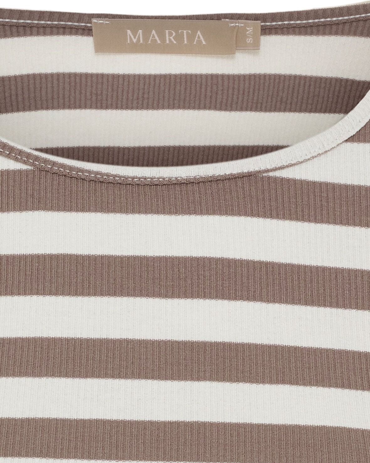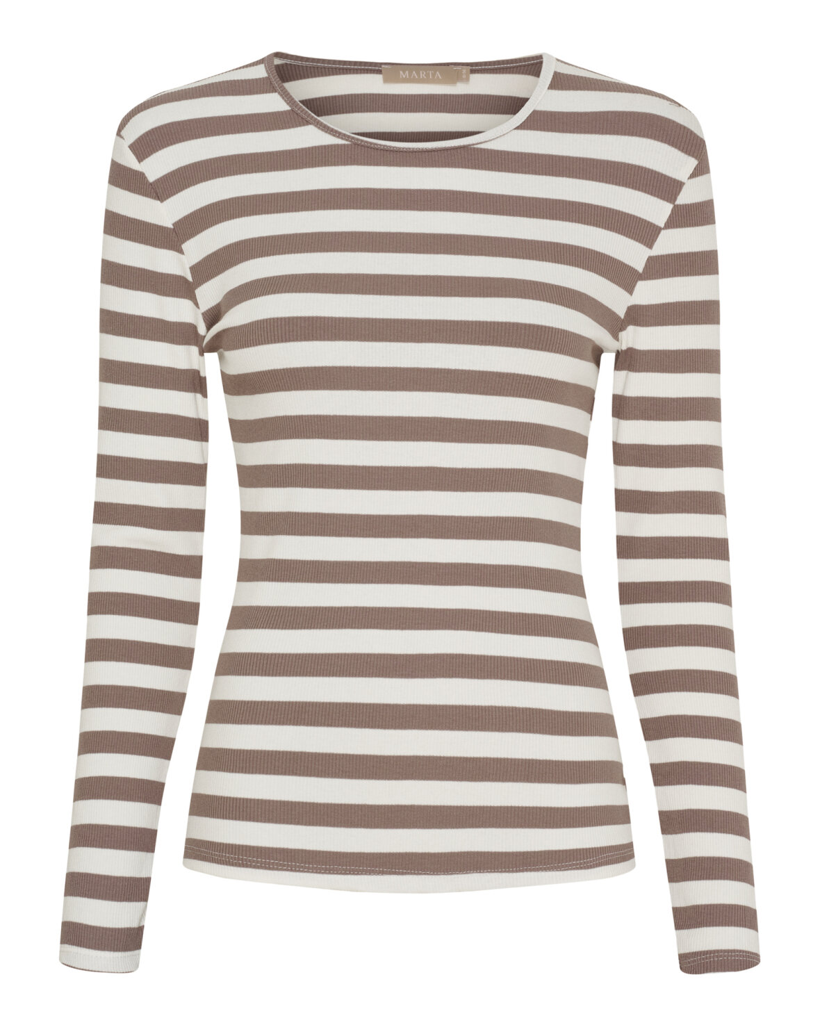 T.shirt 7702 Marta Du Chateau er et elegant og tidløst must-have til garderoben. Denne langærmede tee har en let, luftig kvalitet og en ren silhuet, der gør den alsidig til både hverdag og pænere anledninger. Rund hals og ribkanter giver et klassisk udtryk, mens den tætsiddende pasform sikrer komfort og et flatterende look. Perfekt at style med jeans, nederdel eller under en skjorte som et blødt lag.Kvalitet: 97% Viskose, 3% Elastan