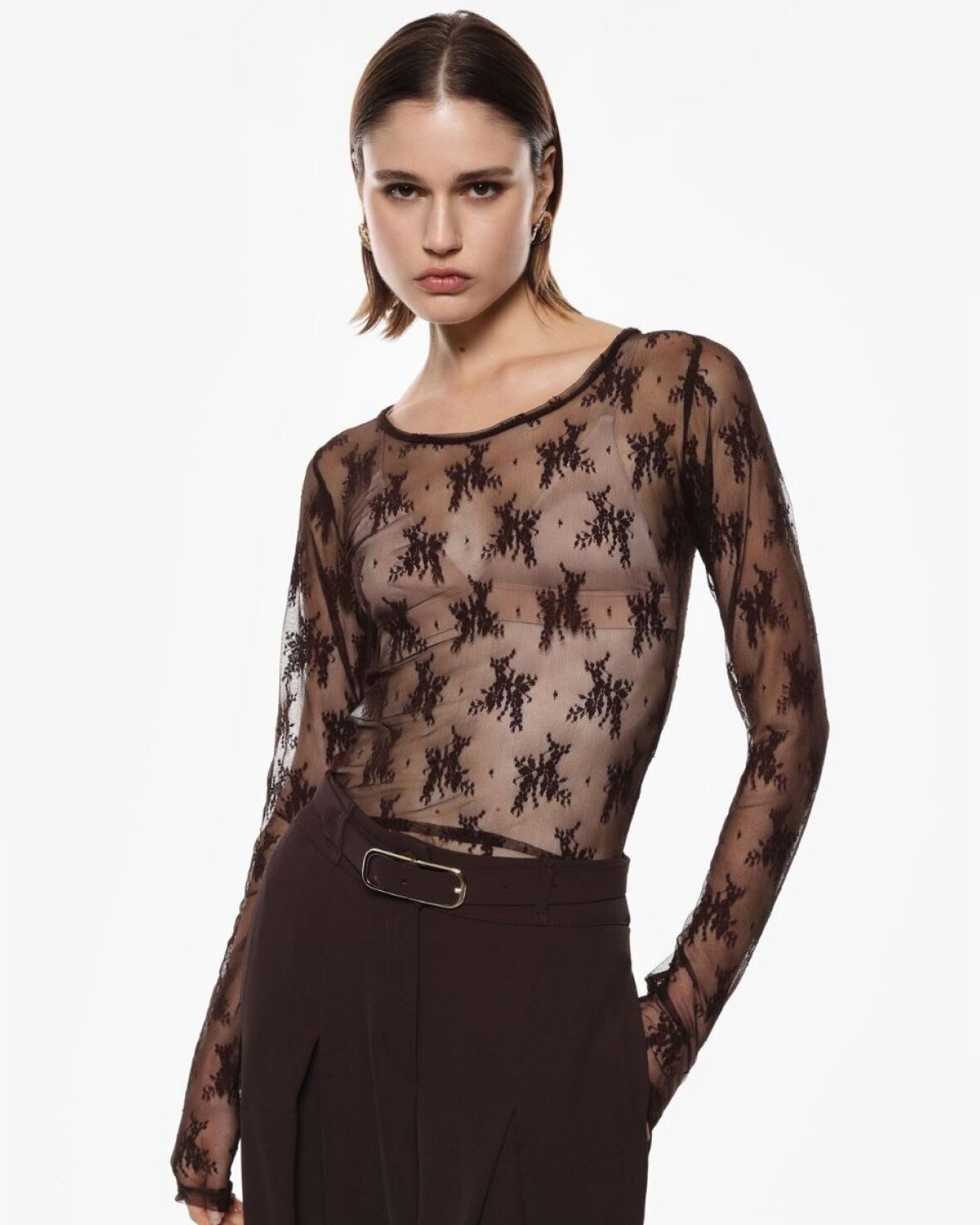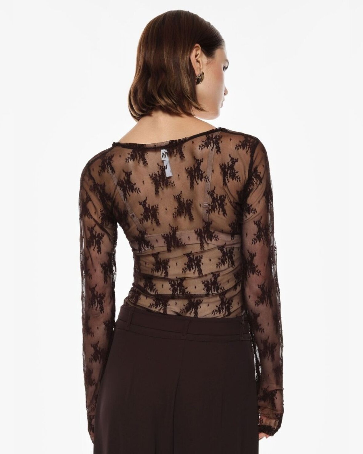 BLUSE TW91KMX - IMPERIAL er en smuk blondebluse med lange ærmer. Toppen er i transparant strækbart materiale og har en rund halsudskæring.