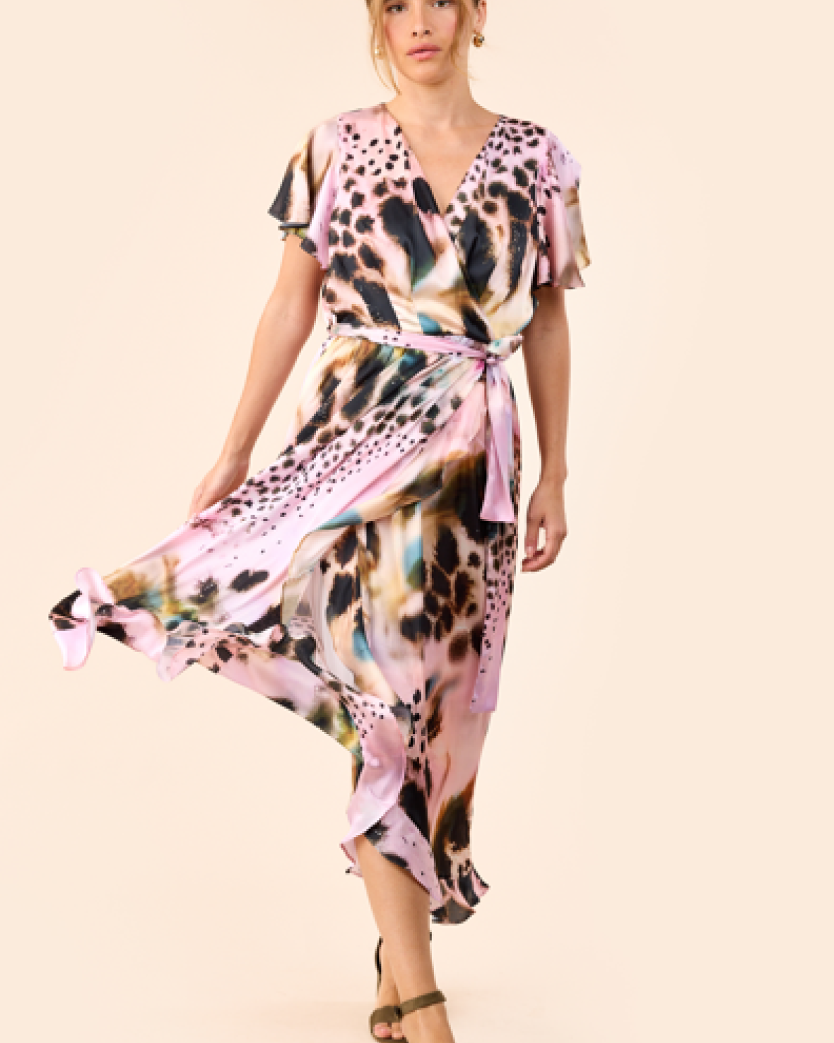 KJOLE 7905 - MOLLY JO Denne kjole har et feminint og let udtryk med et smukt fald, der bevæger sig elegant med kroppen. Den slå-om-inspirerede overdel skaber en flot V-udskæring, som fremhæver hals og silhuet på en elegant måde. De korte, lette ærmer giver kjolen et luftigt look, mens bindebåndet i taljen gør det nemt at justere pasformen og skabe en flatterende form. Skørtet falder blødt ned i en let asymmetrisk afslutning, der giver kjolen et eksklusivt og levende udtryk.Kvalitet: 100% Polyester