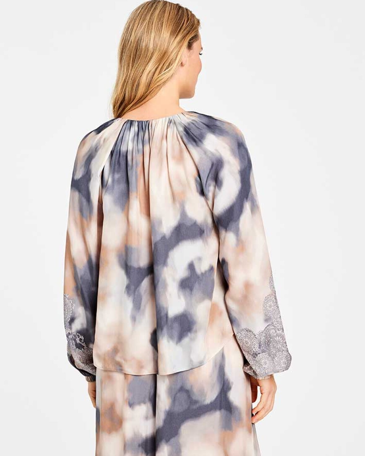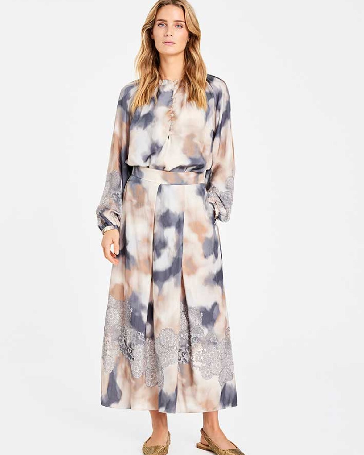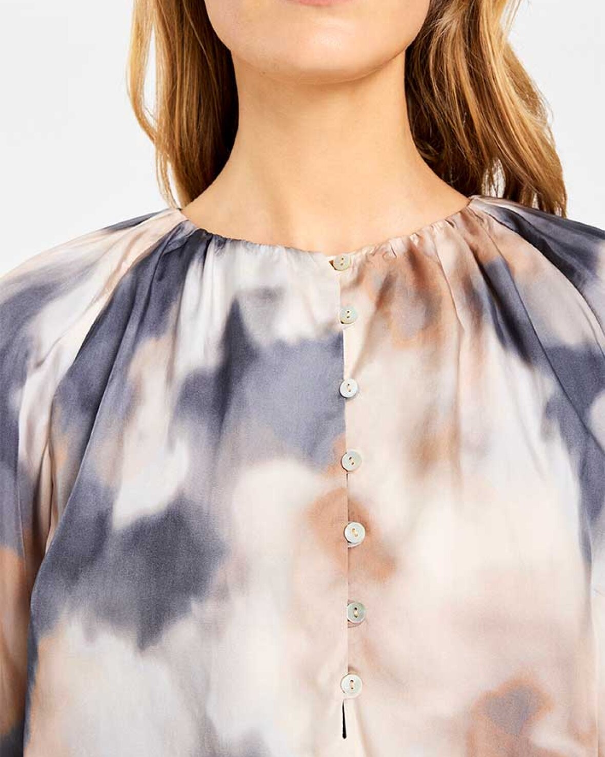 ANNABELL BLUSE - GUSTAV er en smuk printet bluse, designet i en lækker cuprokvalitet. Blusen har et rummeligt snit med rund hals, stolpelukning med perlemorsknapper og masser af læg. Blusen har hellange raglanærmer med elastikmanchetter og sidder dejligt løst og behageligt. Perfekt bluse både til skindbukser, almindelig bukser og nederdel.