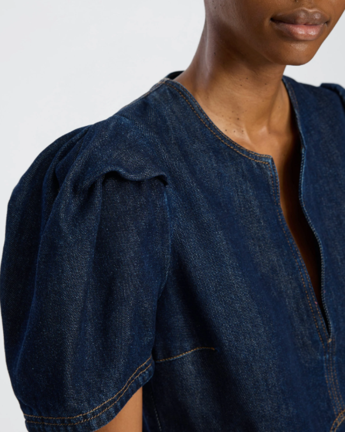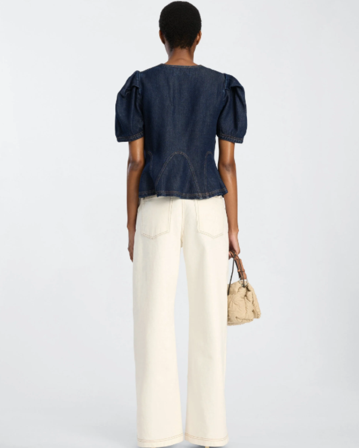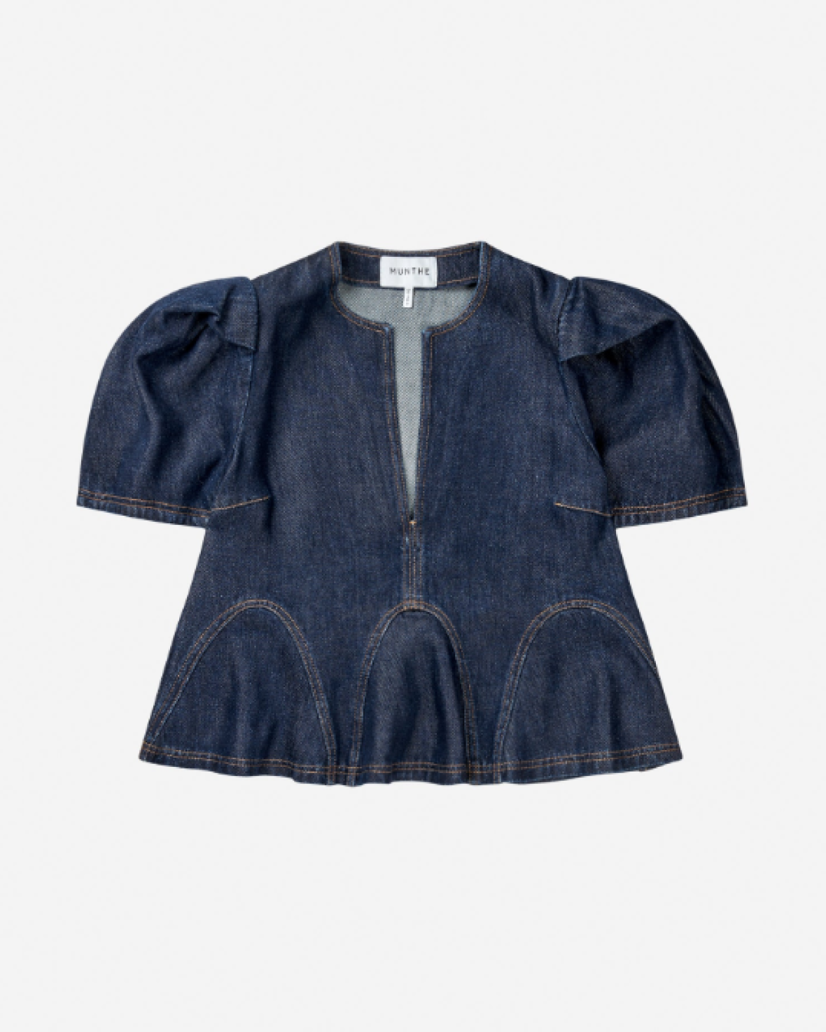 BAYNOR BLUSE - MUNTHE Top med kontrastsyninger, korte, let puffede ærmer, en rund halsudskæring med slids og en let A-formet silhuet. For at holde dit rå denim pænt, anbefaler vi at vaske det skånsomt på et mildt program, med skånsomt vaskemiddel. På grund af rå denims natur, kan der forekomme en naturlig farveændring med tiden – det er helt normalt og giver dit denim et unikt look over tid.