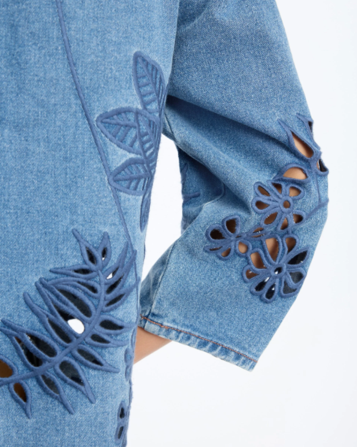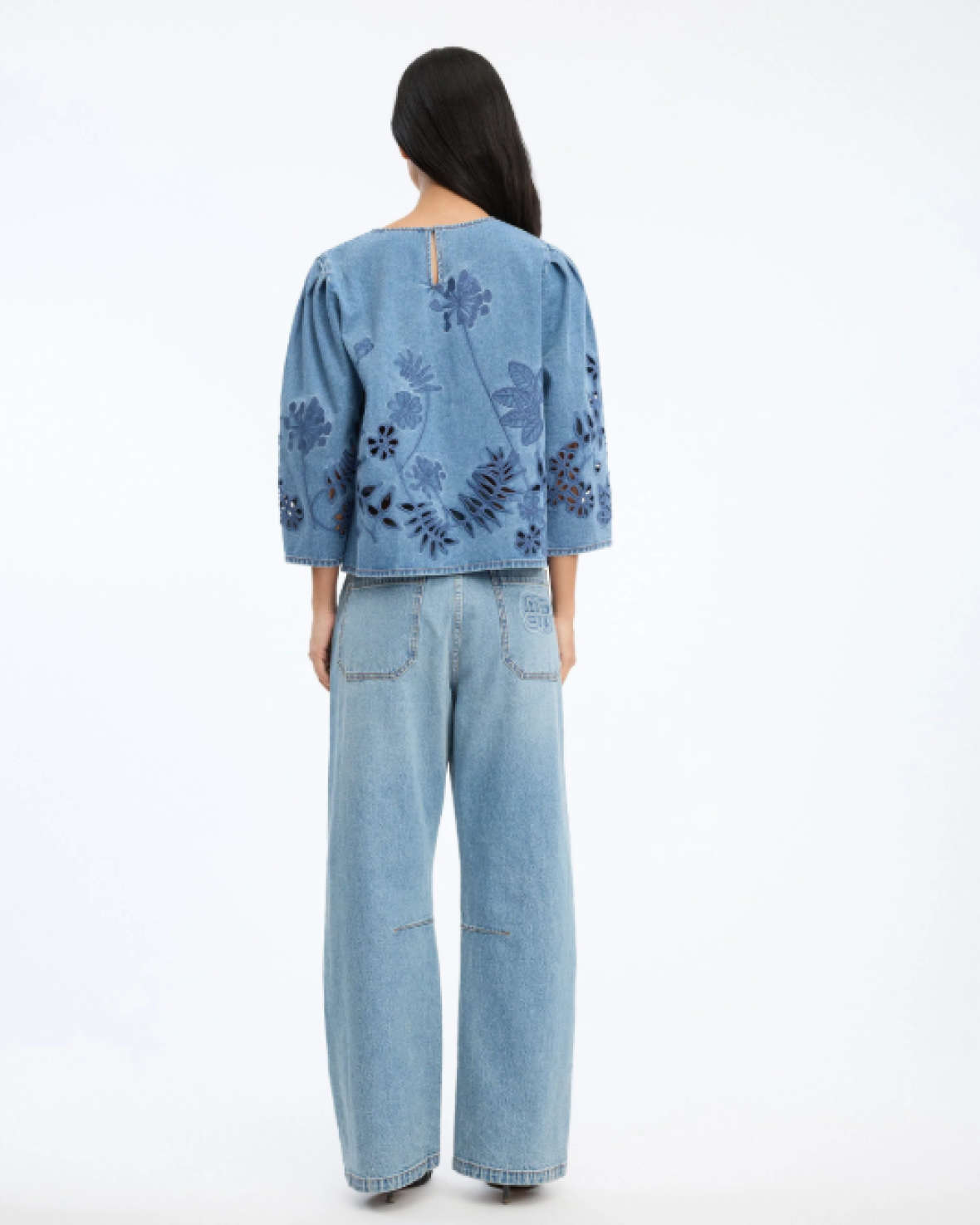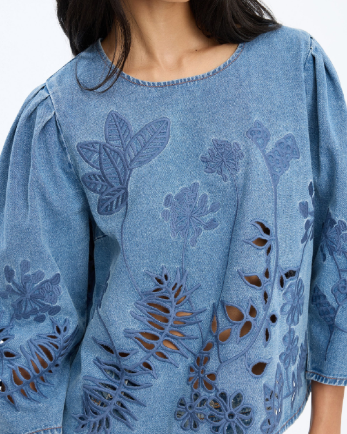 BRAMBLE BLUSE - MUNTHE er en smart top i denim med blomsterbroderi, lange ærmer med let volumen, en rund halsudskæring og en normal pasform.Kvalitet: 100% bomuld