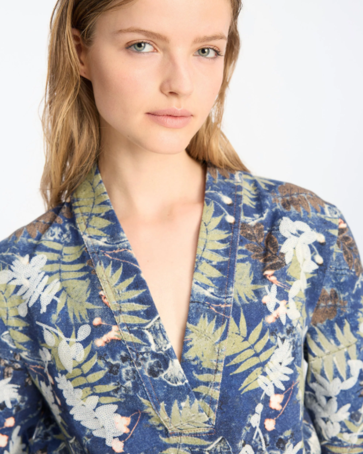 BENOIT BLUSE - MUNTHE er en smart top med et botanisk print i dyb blå og grønne nuancer. Toppen har bredde ærmer, en åben front og tilfører et kunstnerisk look til ethvert outfit.Kvalitet: 100% bomuld