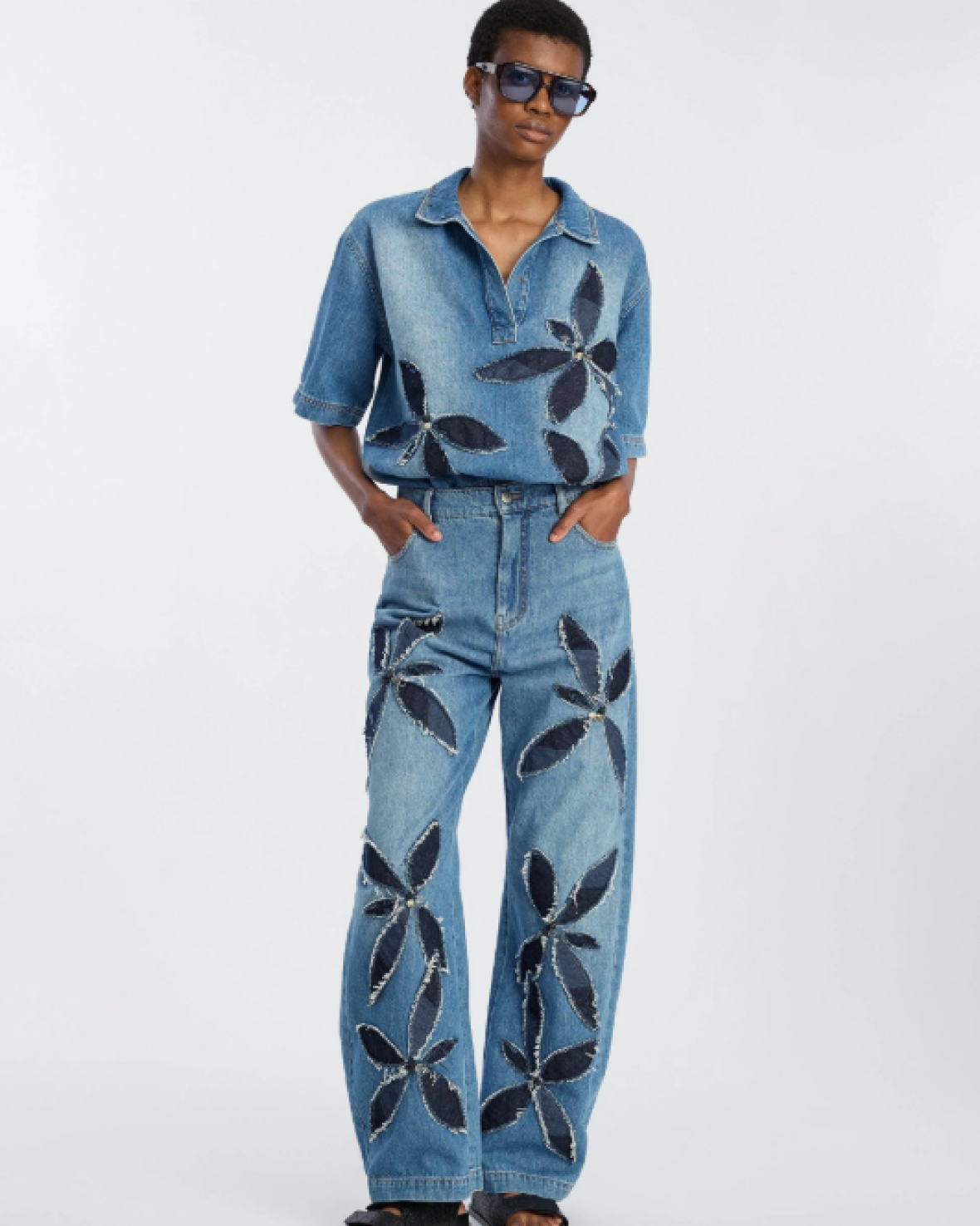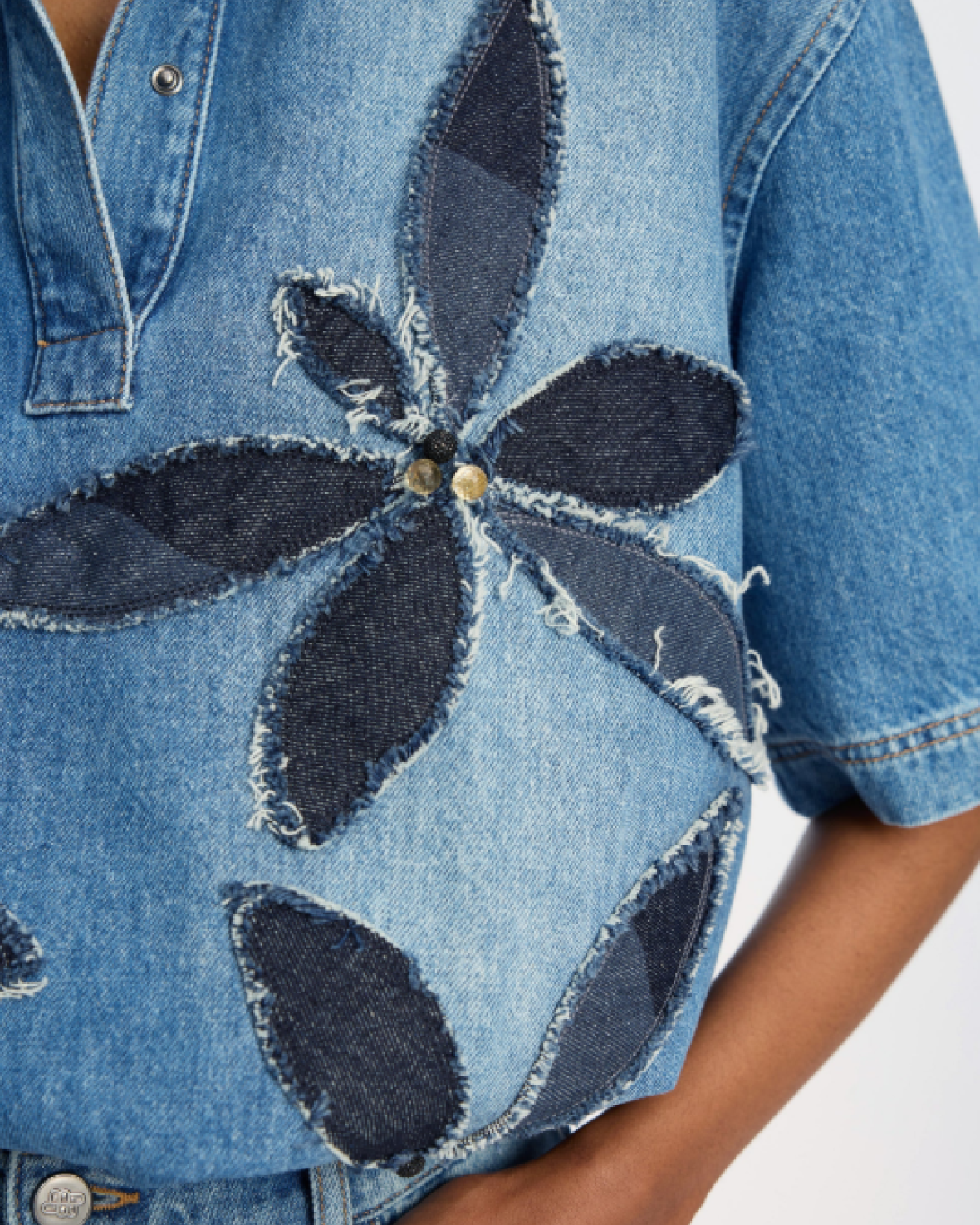 BERTRYM BLUSE - MUNTHE er en smart top i denim med mørkere denimapplikationer i blomstermotiver. Toppen har korte ærmer, en krave og en løs afslappet pasform.Kvalitet: 100% økologisk bomuld