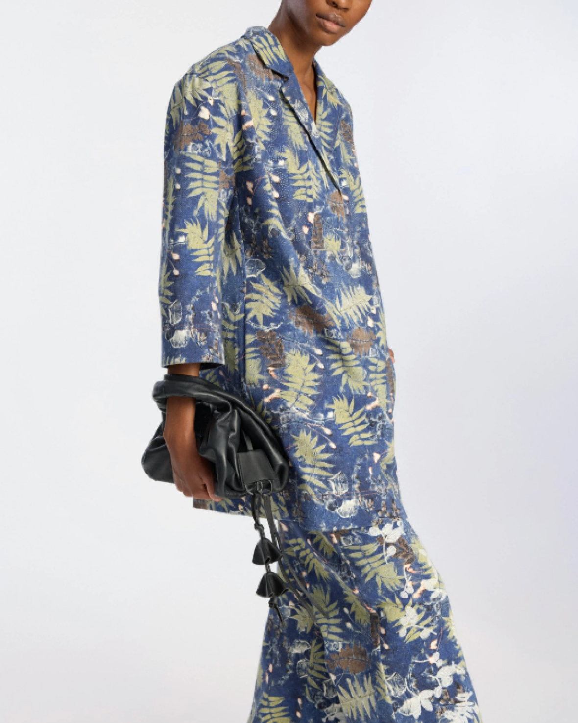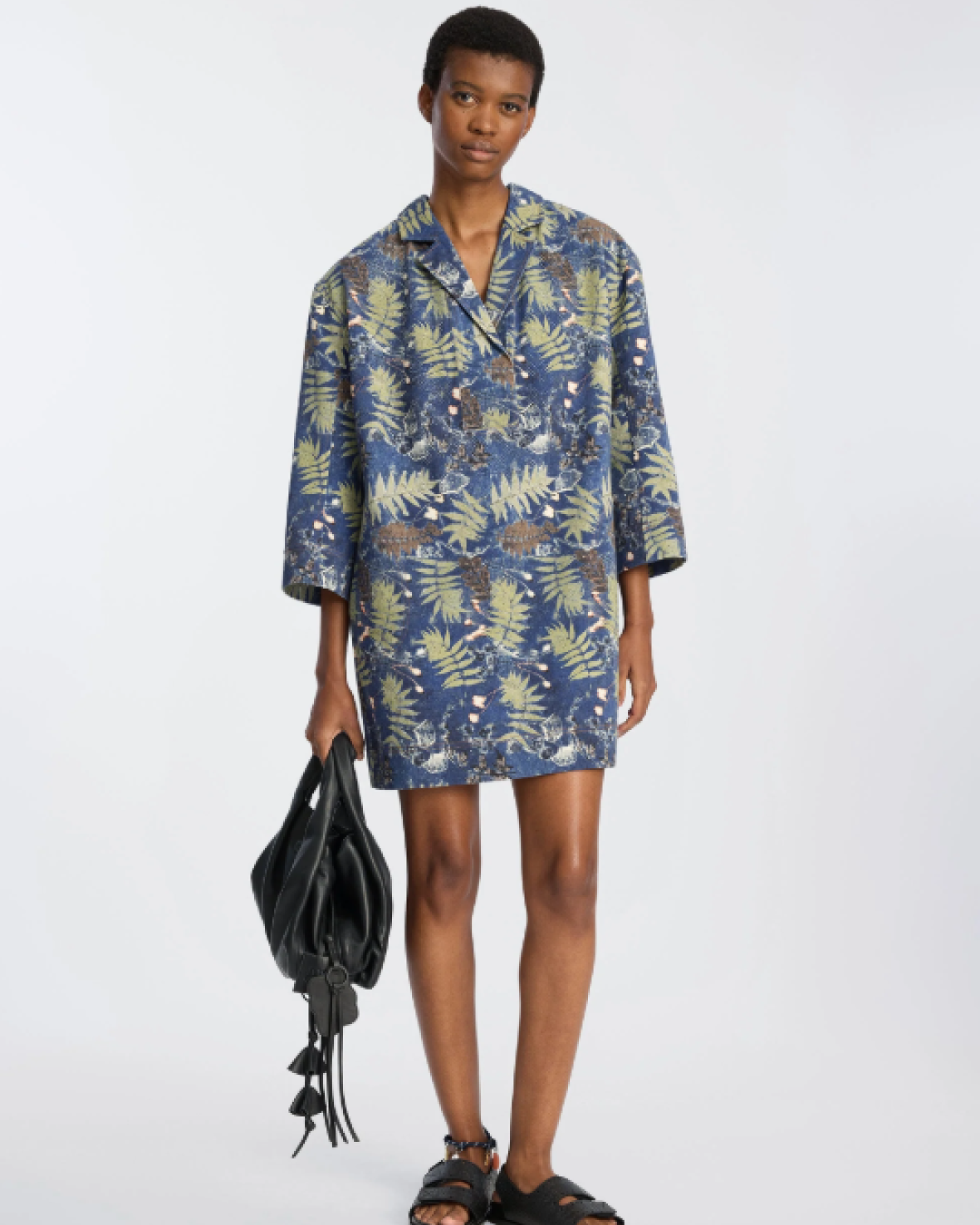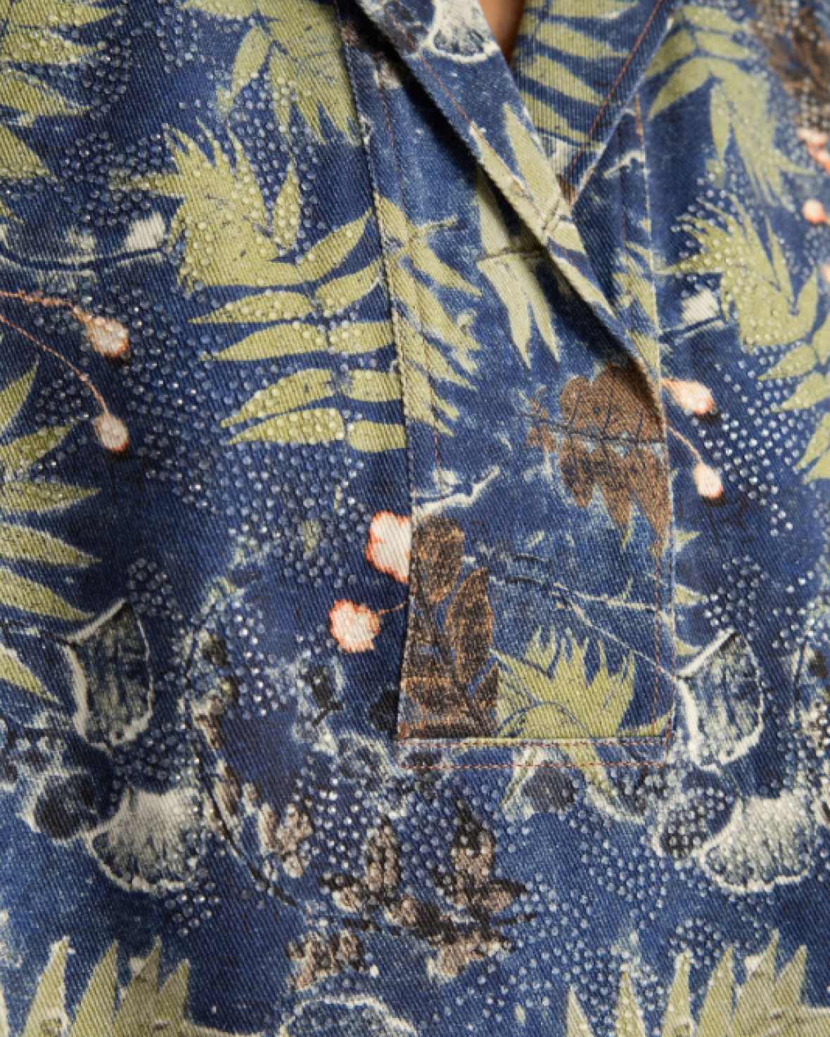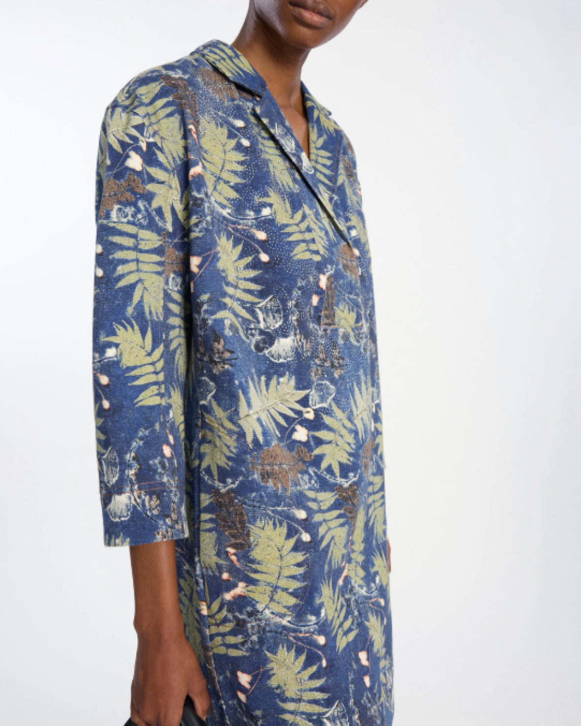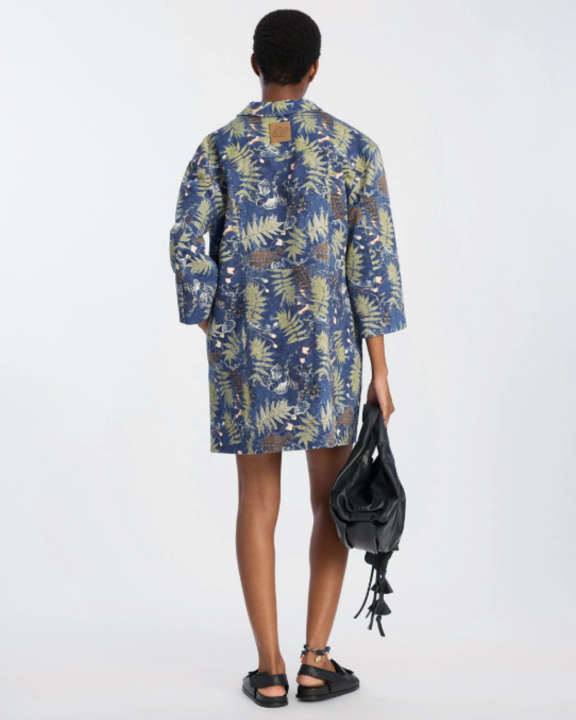 BELONA KJOLE - MUNTHE Kjole er skåret i en let vævet kvalitet med et botanisk print i dybe blå og grønne nuancer. Modellen har en lige pasform, V-udskæring med lille krave samt trekvartlange ærmer, der giver et afslappet og velafbalanceret udtryk. Munthe har et mål om at producere printede styles med et minimum af materiale spild. Det betyder, at hver style er forskellige i forhold til hvordan mønsteret er placeret, og alle printede styles er derfor unikke. For at holde dit rå denim pænt, anbefaler vi at vaske det skånsomt på et mildt program, med skånsomt vaskemiddel. På grund af rå denims natur, kan der forekomme en naturlig farveændring med tiden – det er helt normalt og giver dit denim et unikt look over tid.