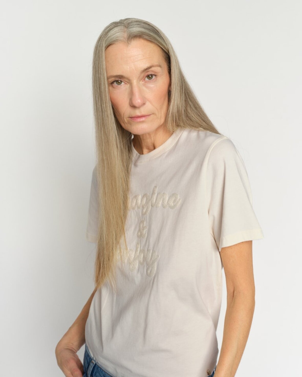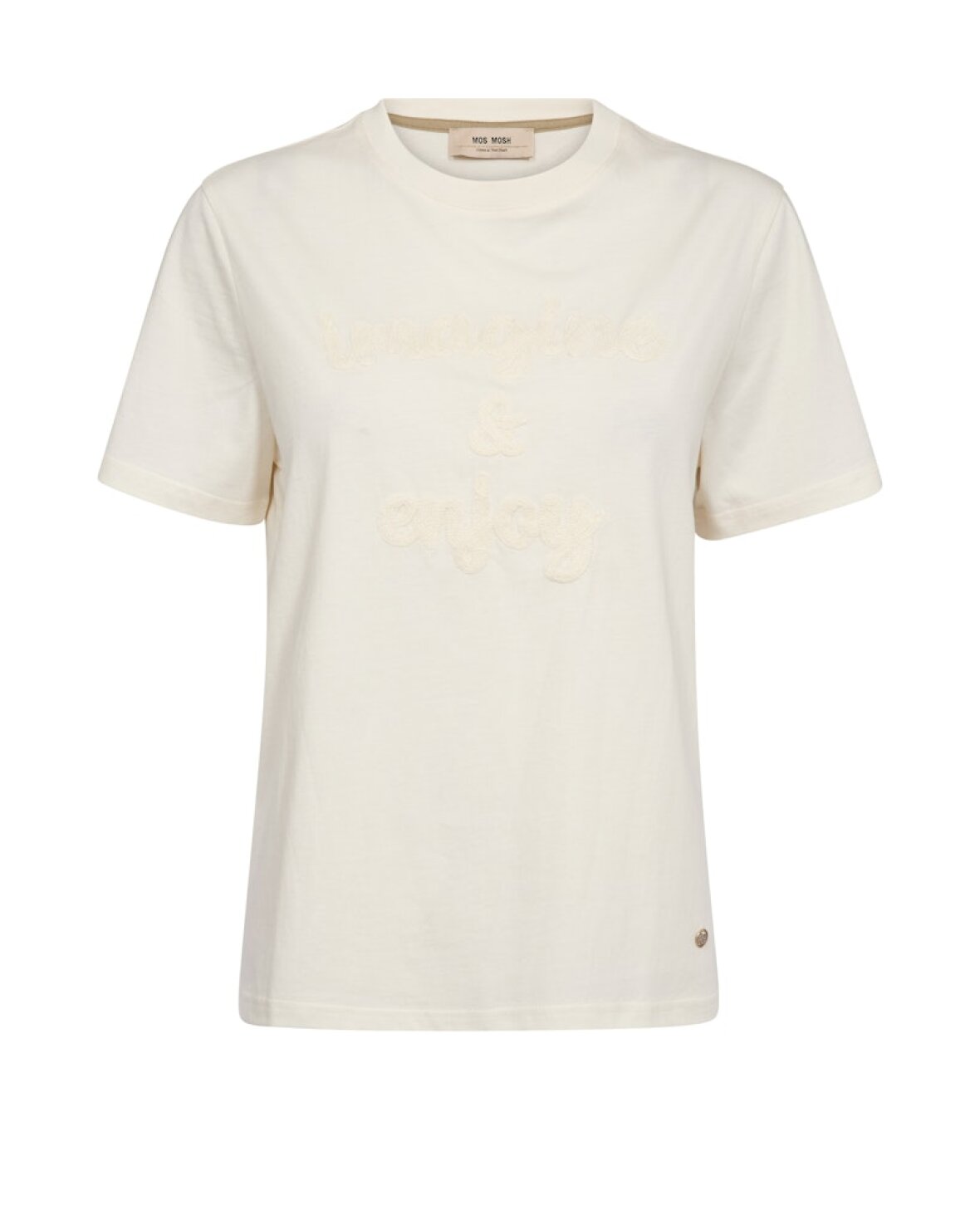 MMMAKRI O-SS TEE - MOS MOSH En blød T-shirt i økologisk bomuld med klassisk pasform og rund hals. Det diskrete broderi foran tilfører et raffineret touch til det ellers enkle design. Perfekt at style med skræddersyede bukser eller afslappet denim for et ubesværet chikt hverdagslook.
