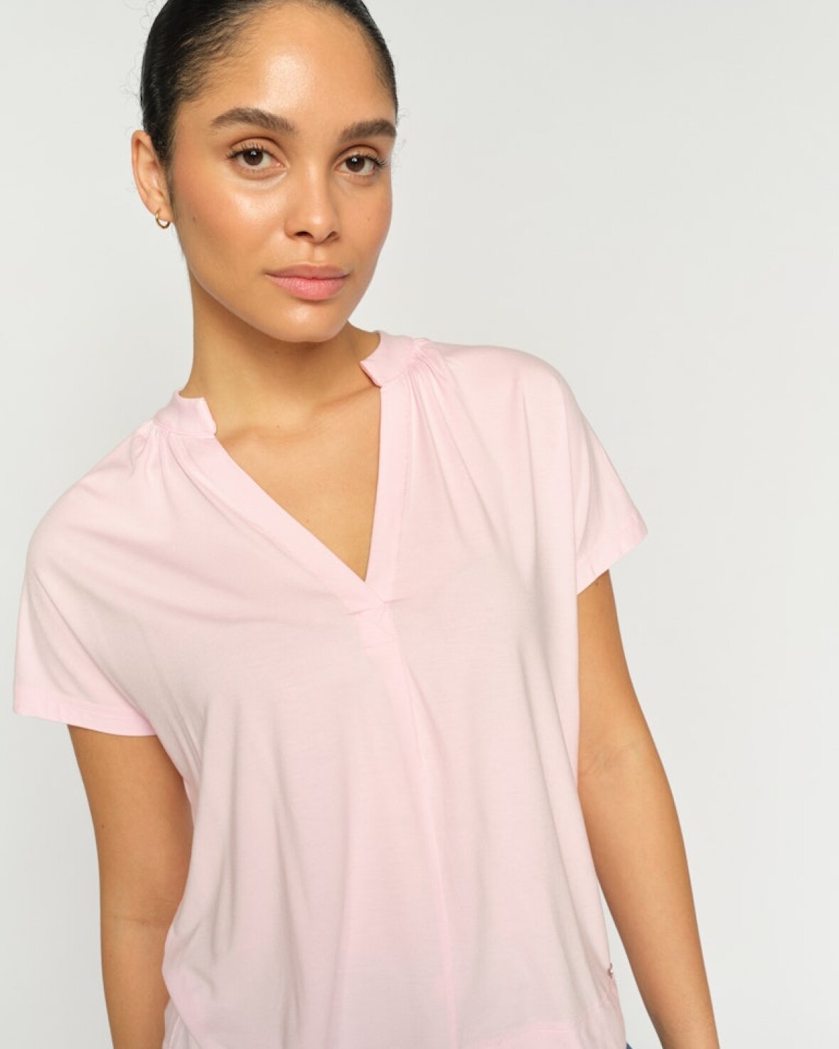 MMSHIRA TEE - MOS MOSH Denne t-shirt er et elegant stykke tøj i garderoben! Den er lavet af viskose og designet i en løs silhuet med en flatterende v-hals. Den er afsluttet med bløde læg, og vi ville style den med jeans, en denimnederdel eller et skræddersyet tøj.Kvalitet: 94% LENZING™ ECOVERO™ Viscose 6% Elastan