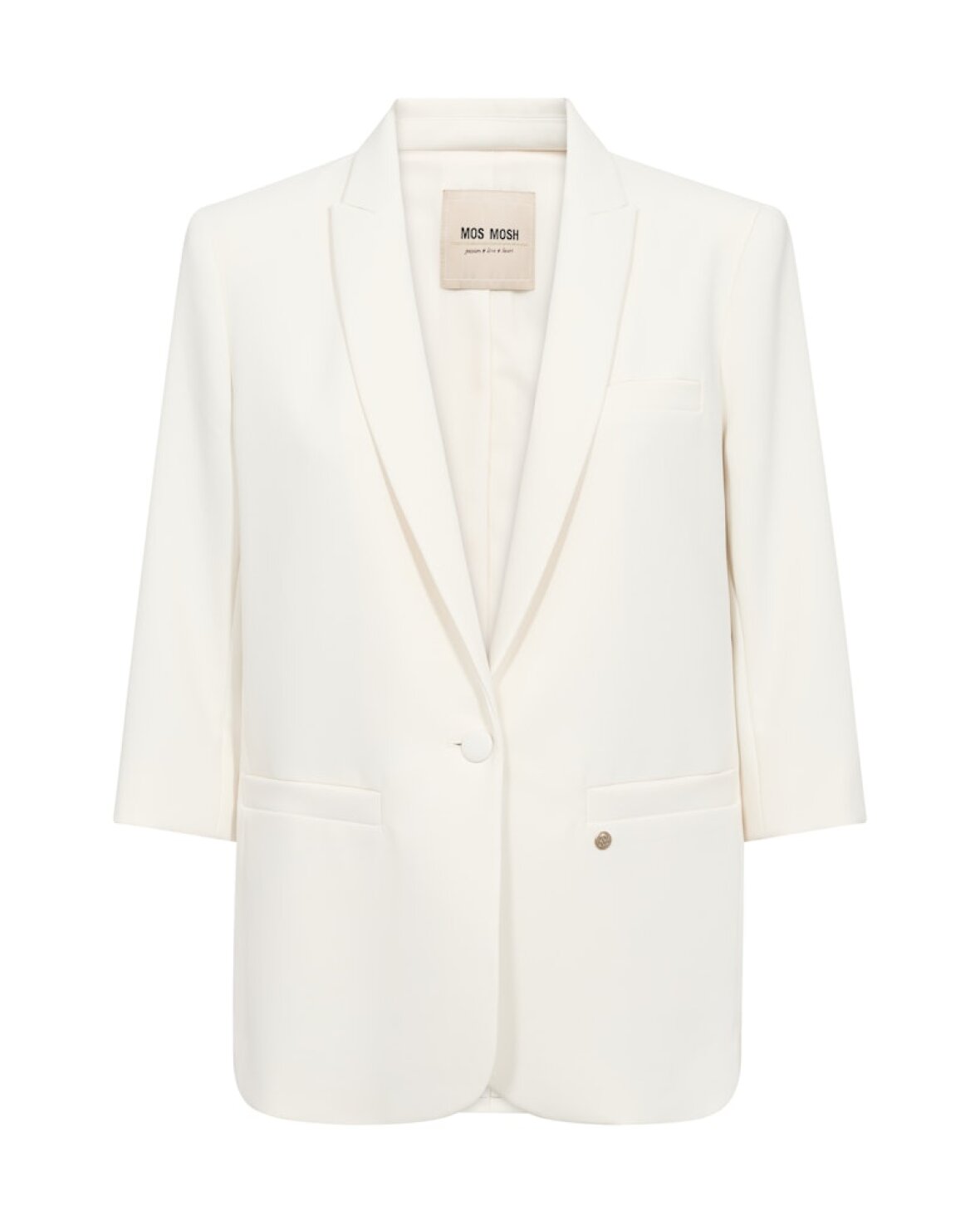 MMJUIE MILEY BLAZER - MOS MOSH er en chikt skræddersyet blazer med 3/4-ærmer og elegant lukning med én knap. Den er designet med klassisk krave og regular pasform og fremstillet i glat polyester for en poleret, moderne silhuet – perfekt til overgangssæsonen.