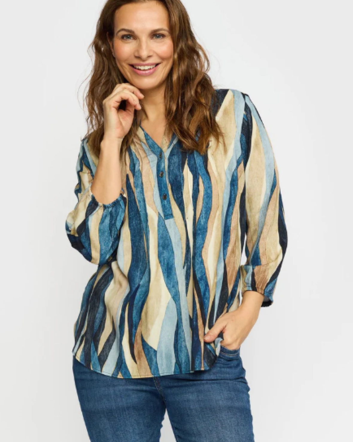 DORTE BLUSE-2-BIZ Bluse med trekvartærmer og elastik der har en v-udskæring med knaplukning. Den har flæser hen også brystet, som giver et flot spil i blusen.