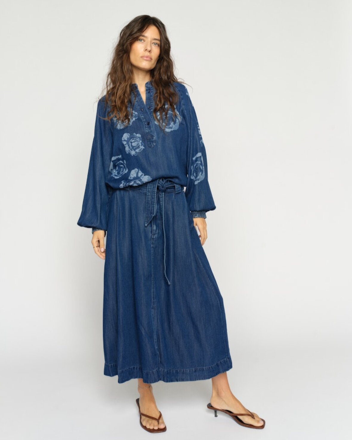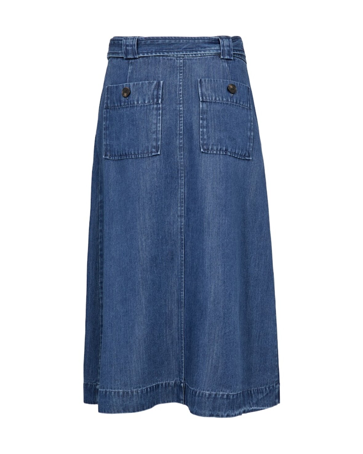MMKODA DENIM SKIRT - MOS MOSH En tidløs nederdel med et moderne twist og en flatterende, feminin silhuet. Den er fremstillet i et blødt, let faldende materiale og har en A-formet silhuet med en flatterende mellemlang længde. Det matchende bælte fremhæver taljen smukt, mens knaplukningen foran tilfører et afslappet touch. Style den med en sprød skjorte eller en enkel T-shirt for et ubesværet chikt look.