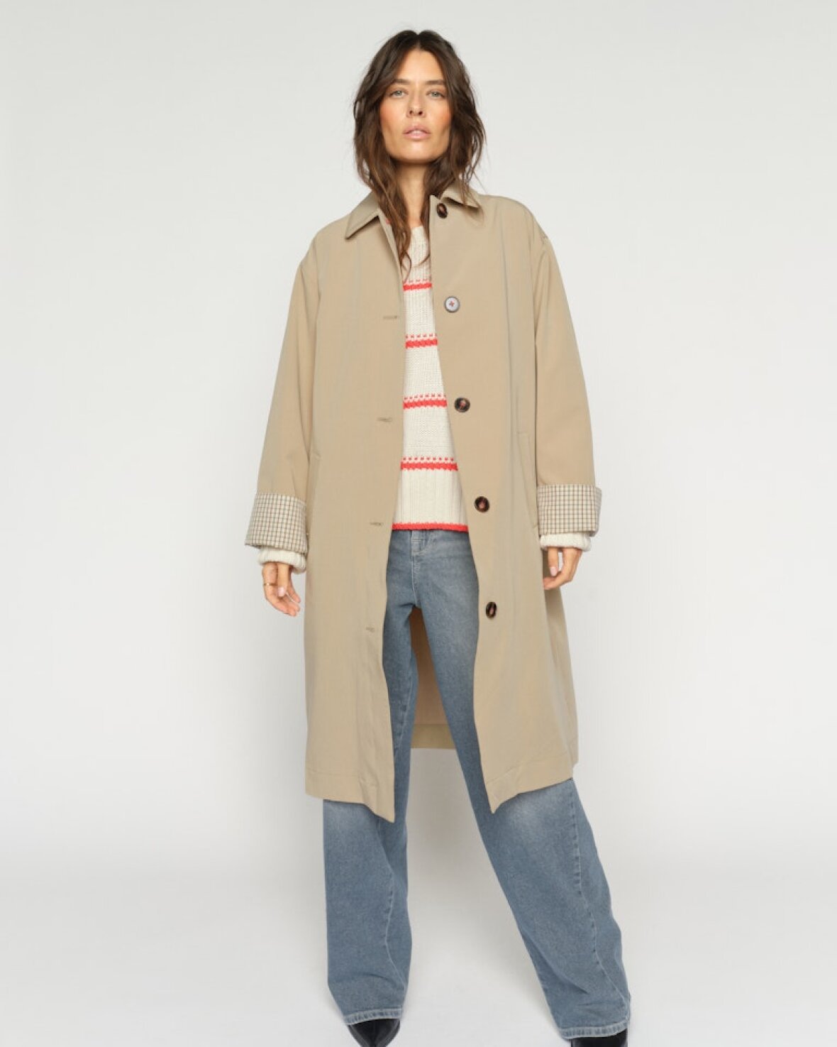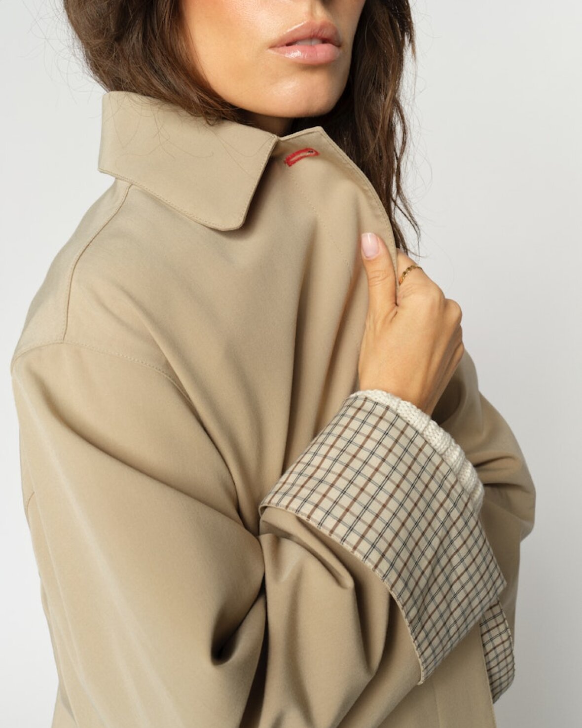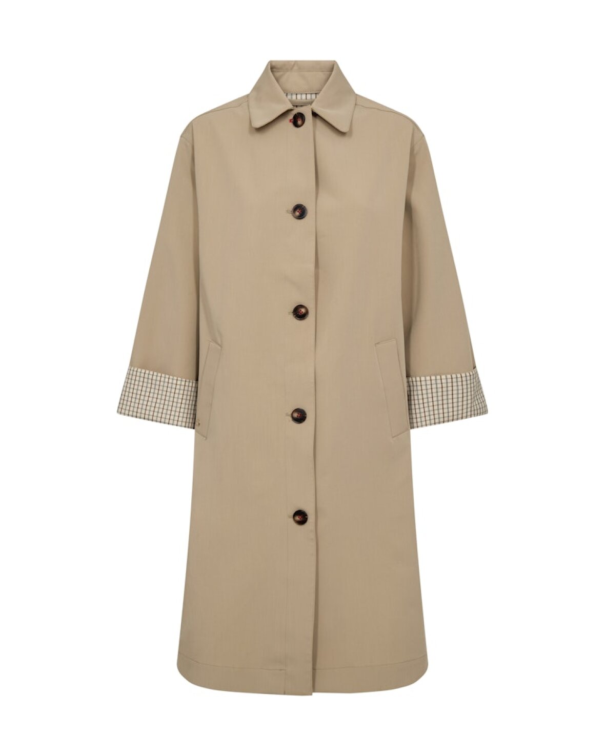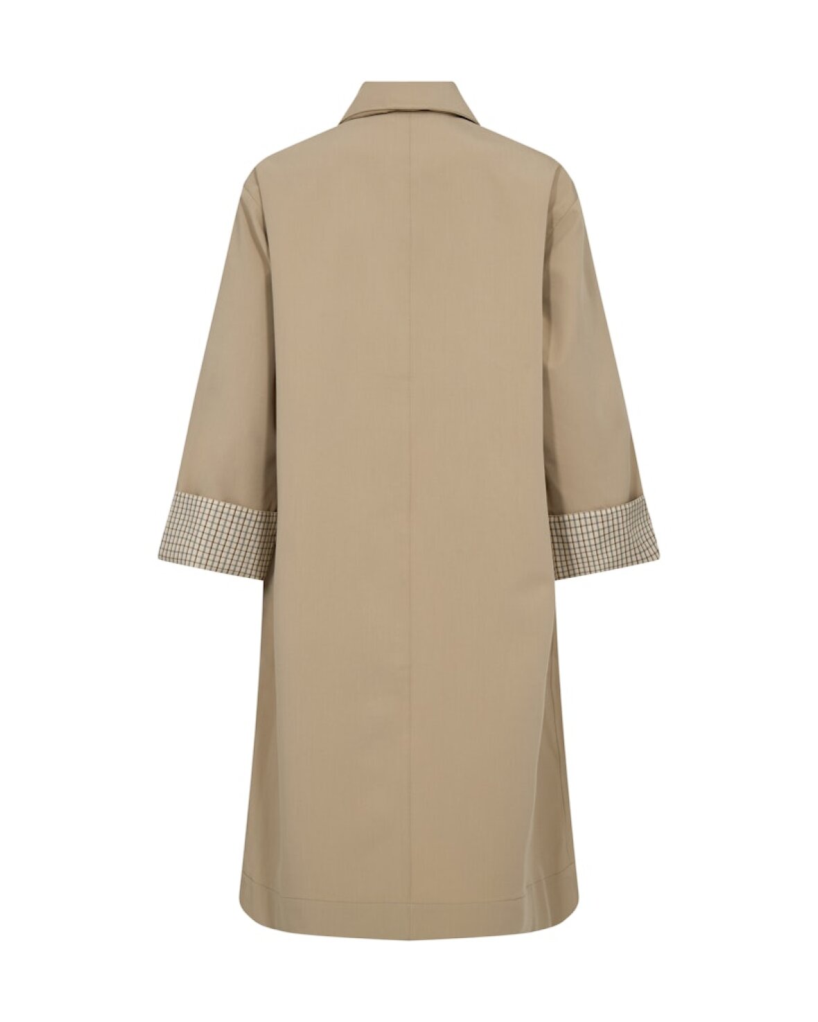 MMRIKO BORA TRENCHCOAT - MOS MOSH En moderne fortolkning af den tidløse trenchcoat. Denne frakke er designet i en afslappet pasform med klassisk krave, knaplukning og cropped ærmer med kontraststribede manchetter, der tilfører et raffineret touch. Fremstillet i en glat, let strækbar kvalitet, der giver et ubesværet sofistikeret udtryk – perfekt til lag-på-lag styling over både skræddersyede og afslappede looks.